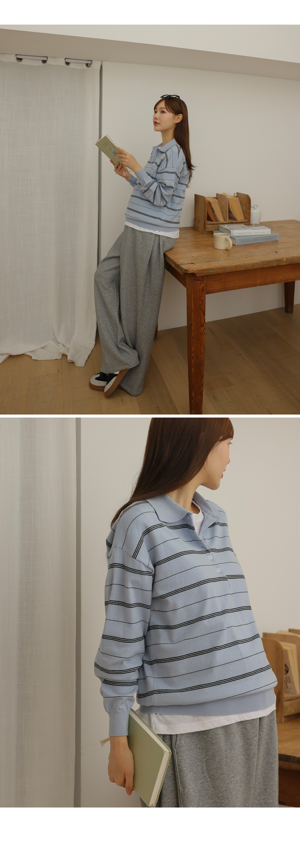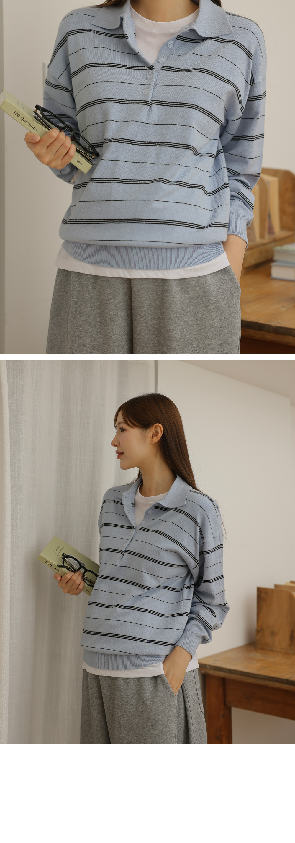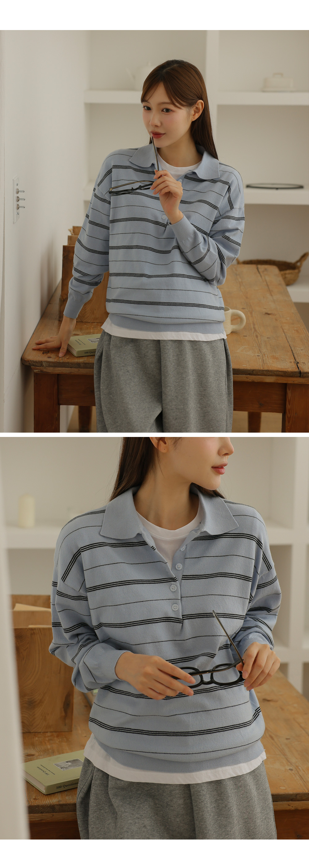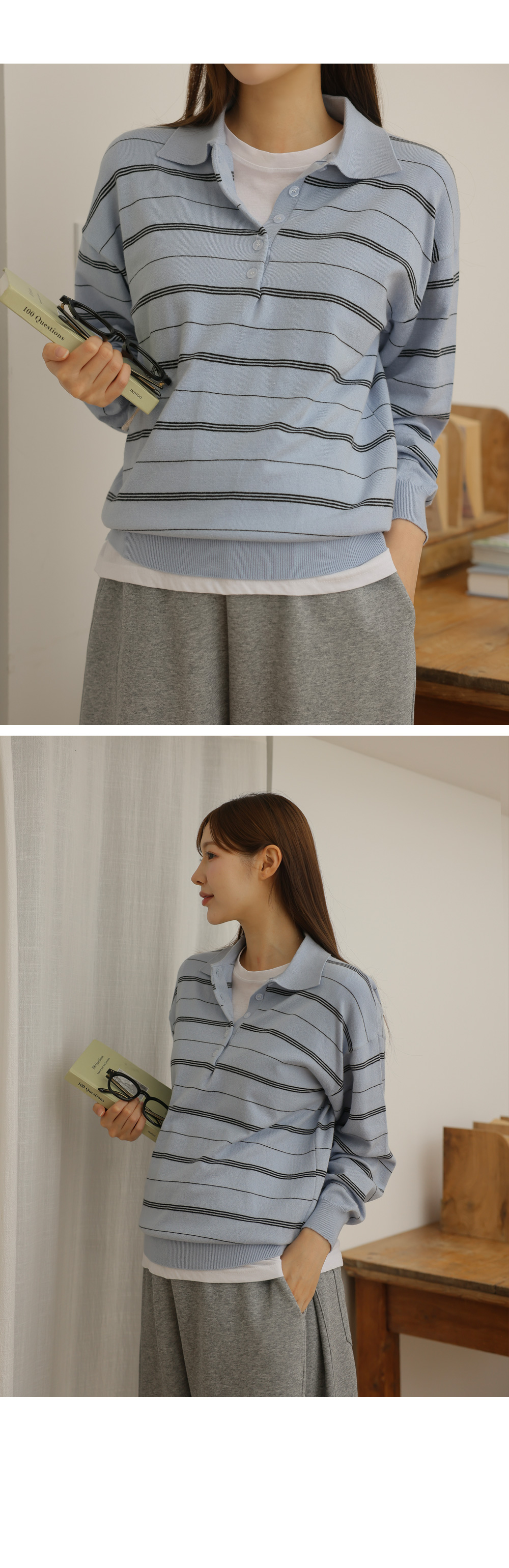 - 카라넥과 얇은 스트라이프 패턴으로