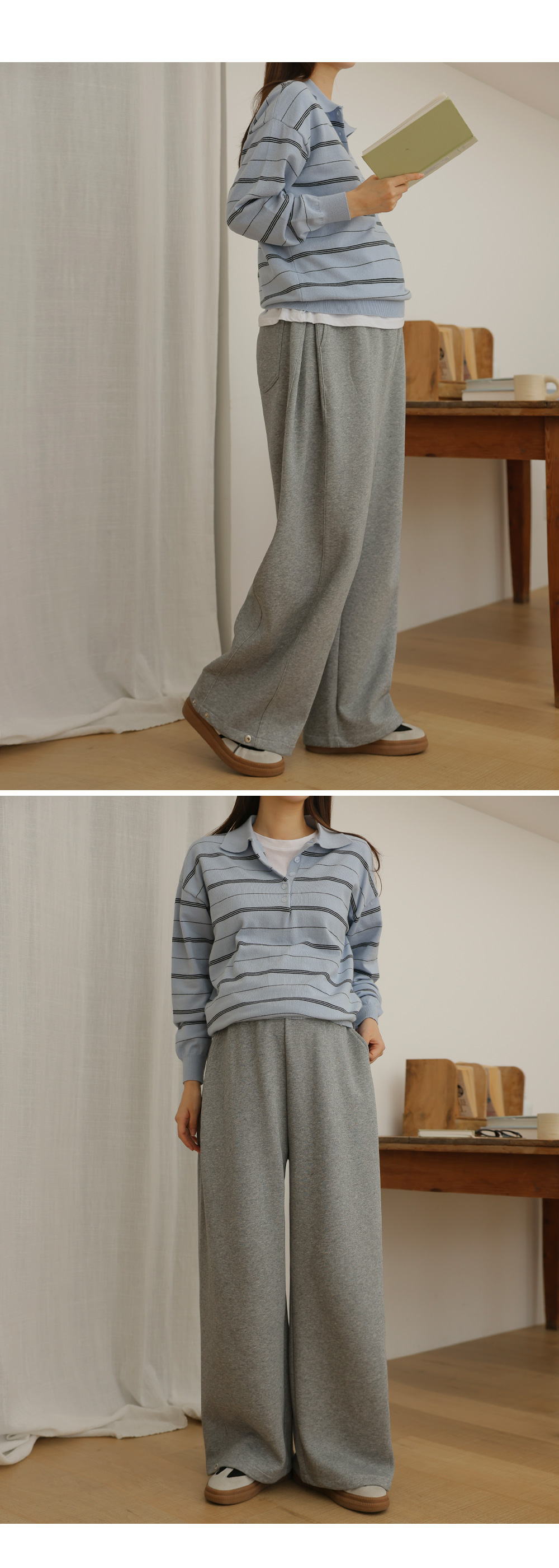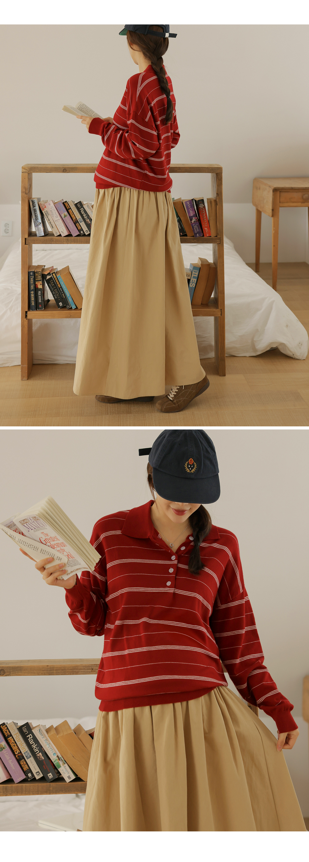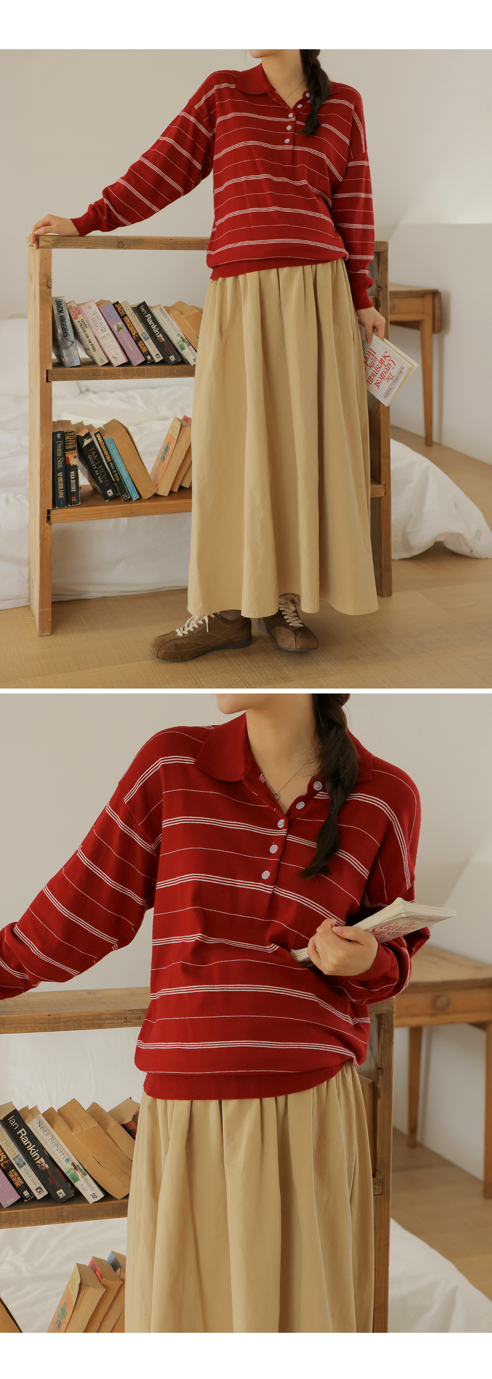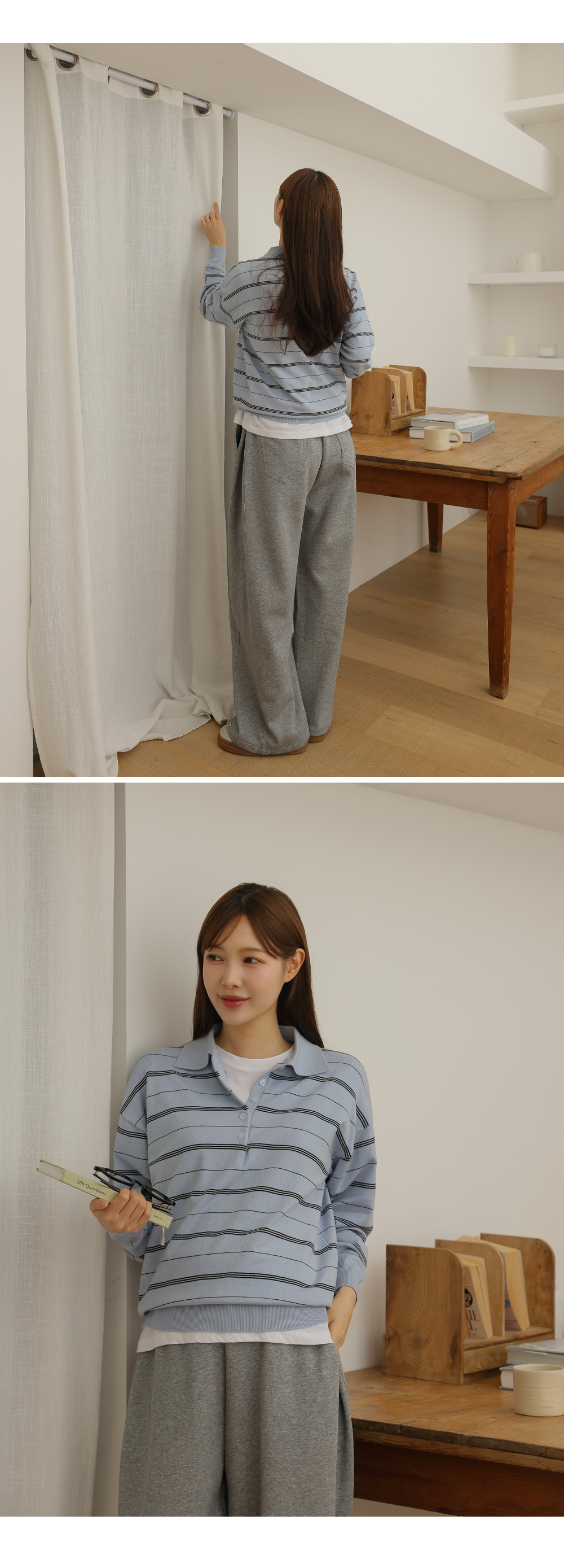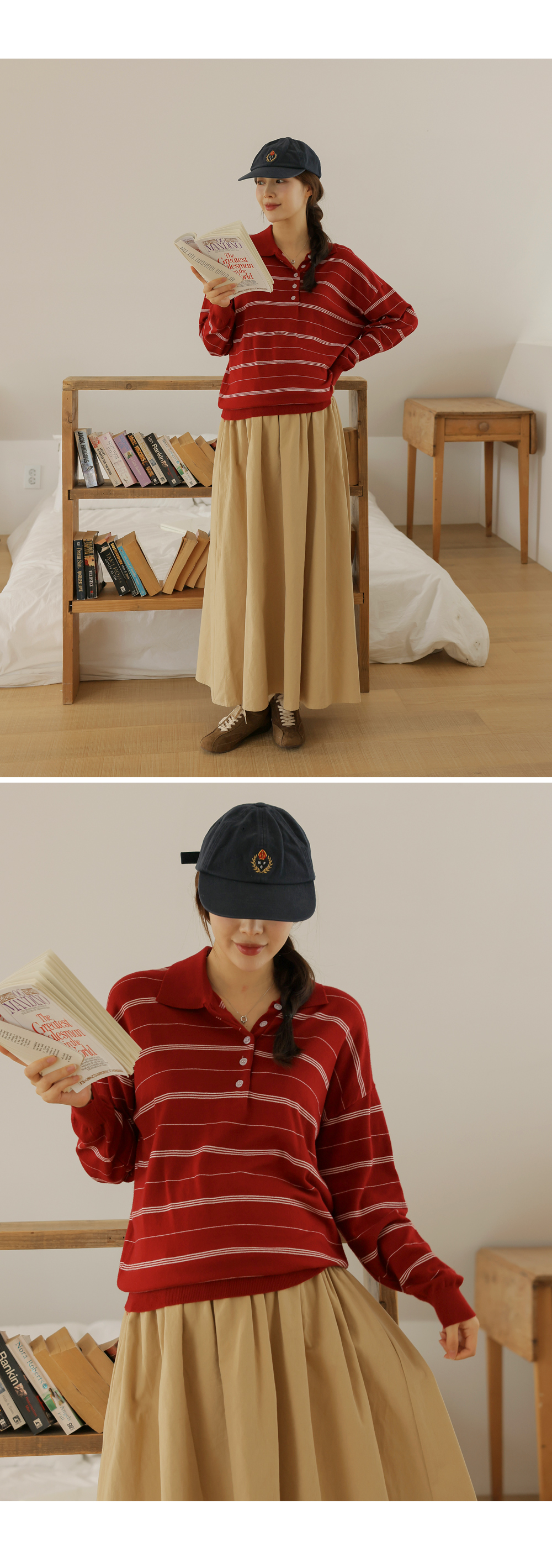 - 카라넥과 얇은 스트라이프 패턴으로