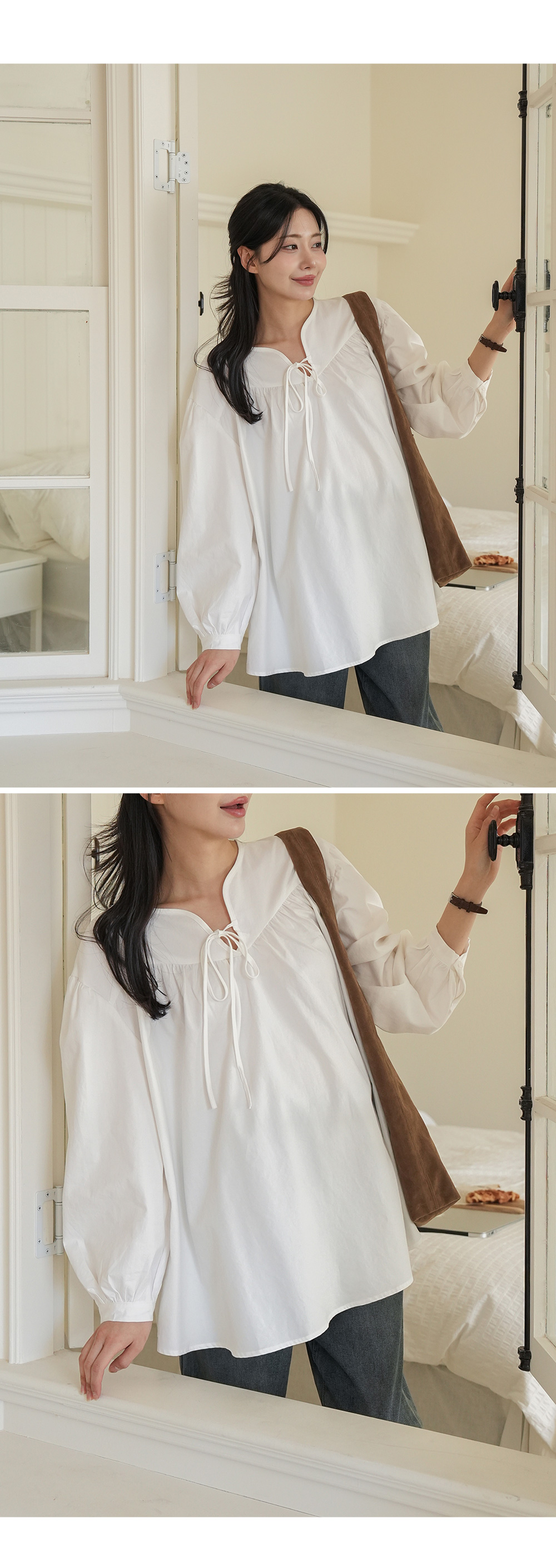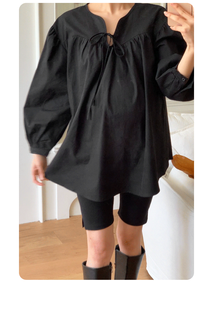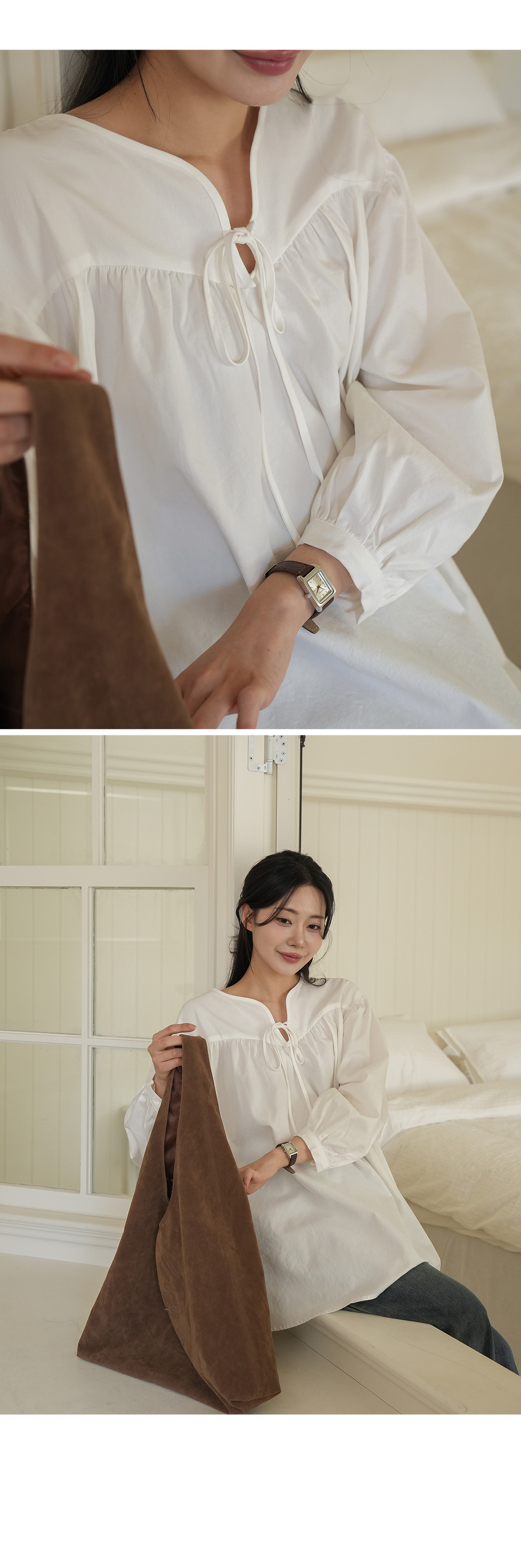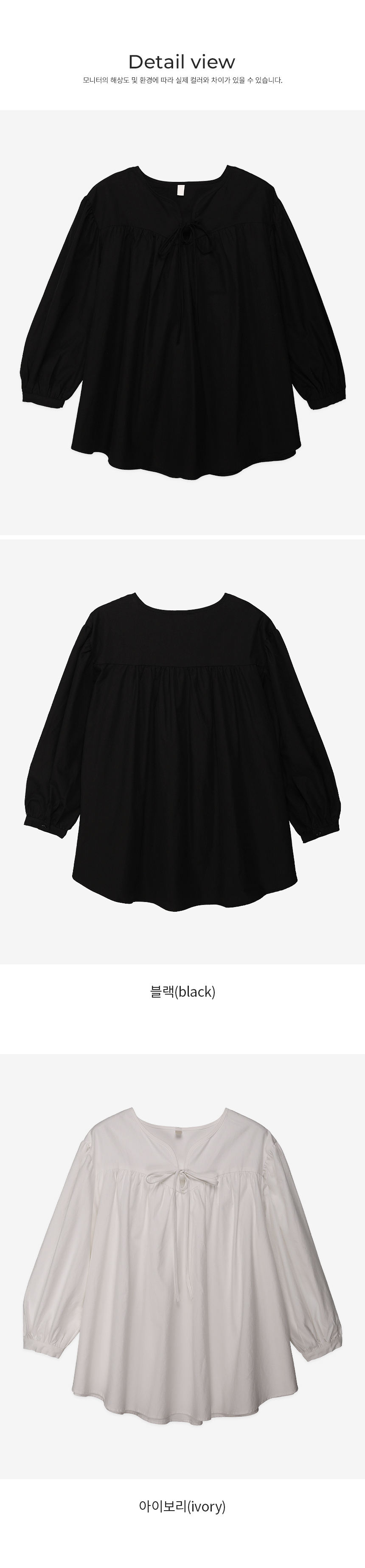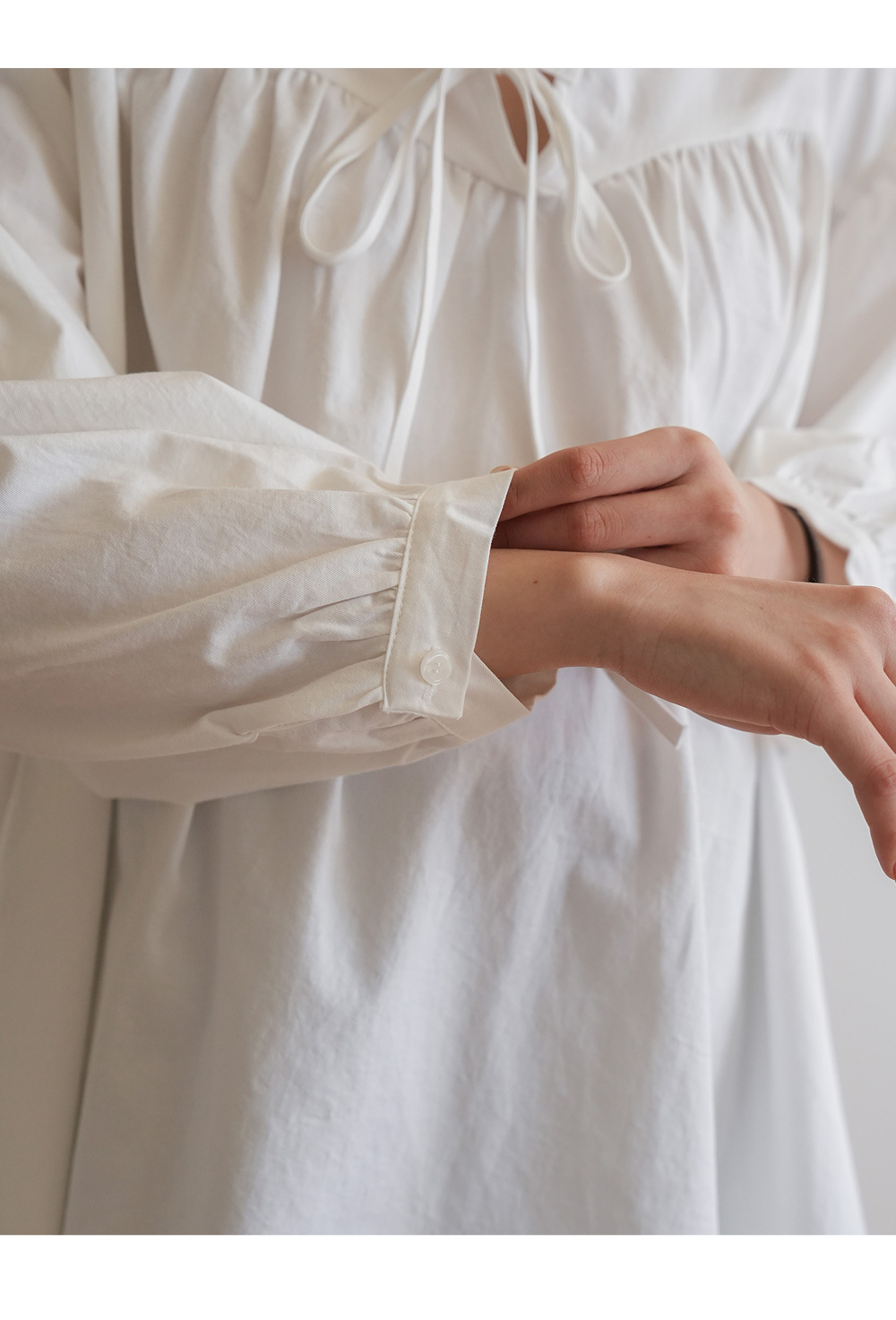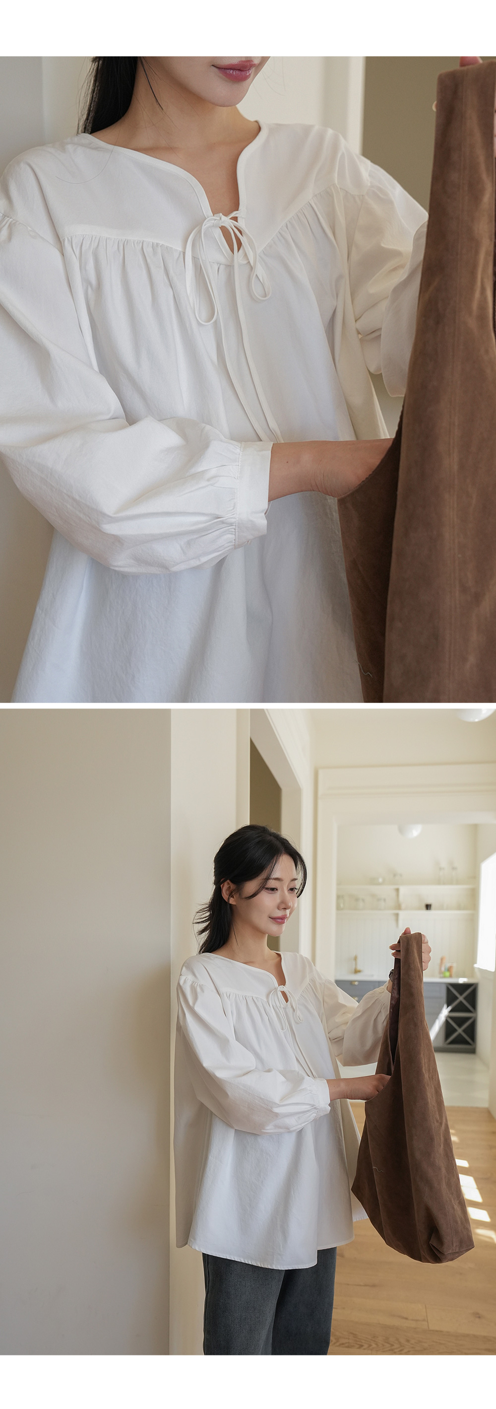 -네크라인의 리본과 은은한 셔링이 여성스러운 무드를