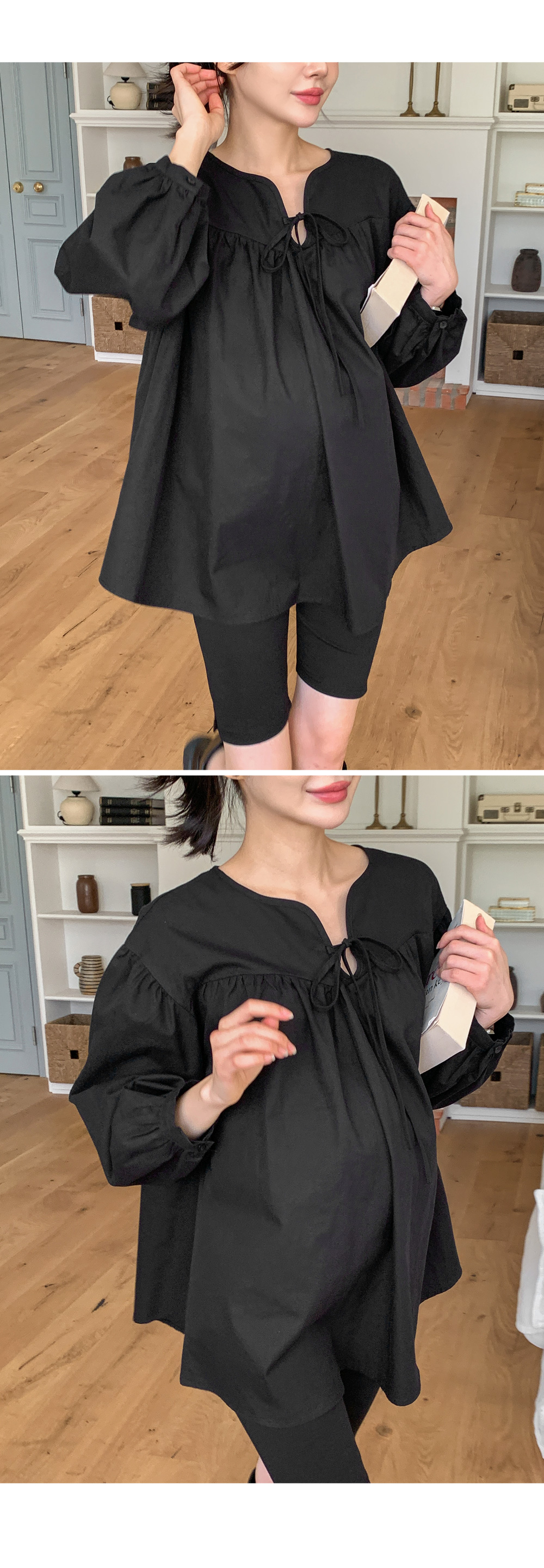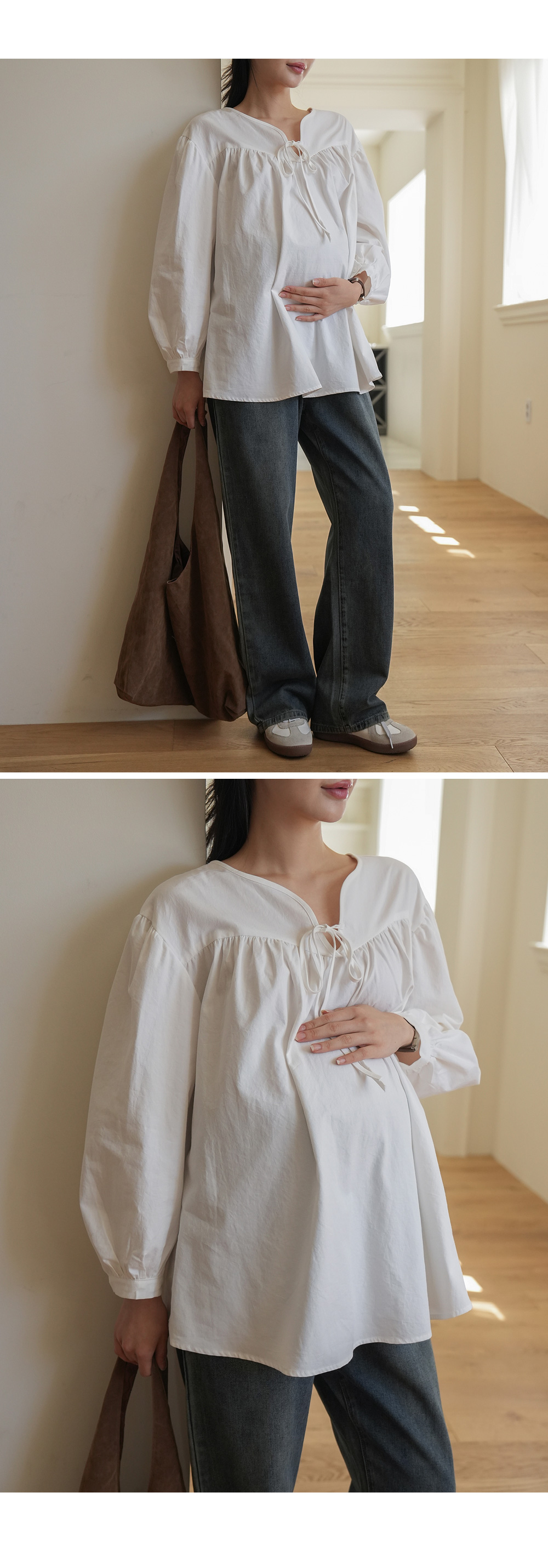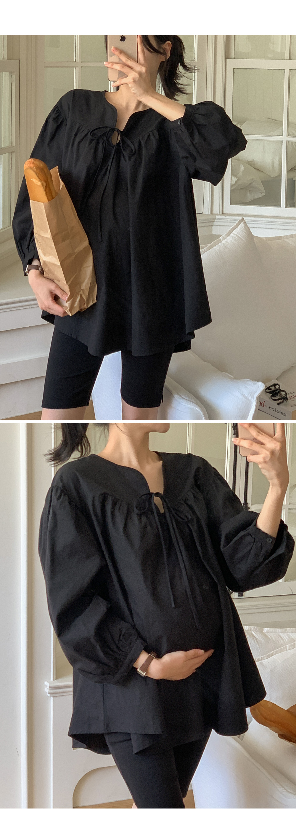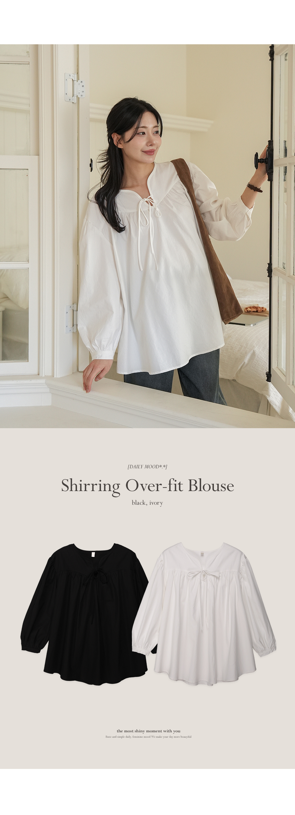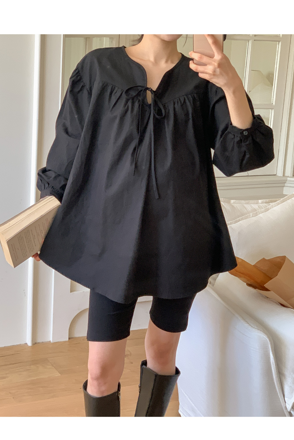 -네크라인의 리본과 은은한 셔링이 여성스러운 무드를