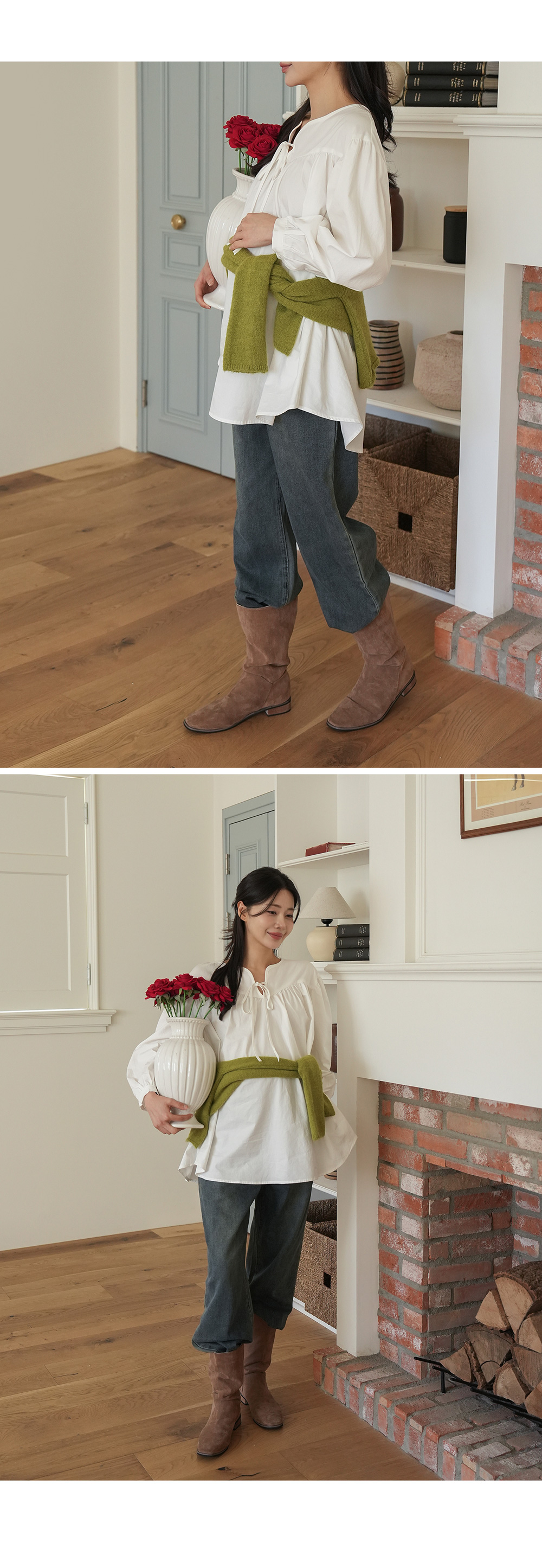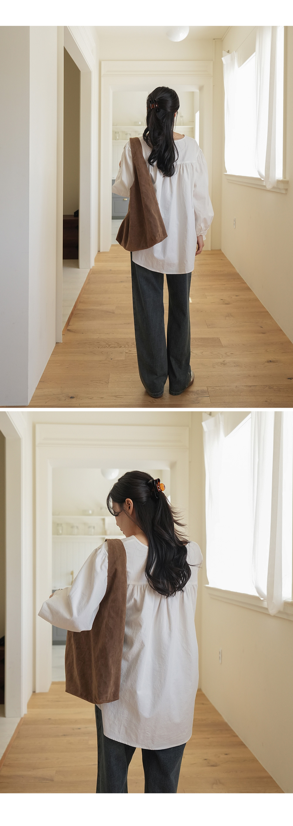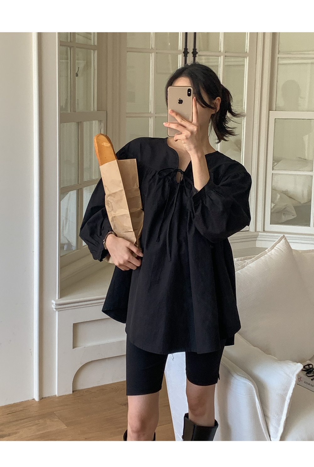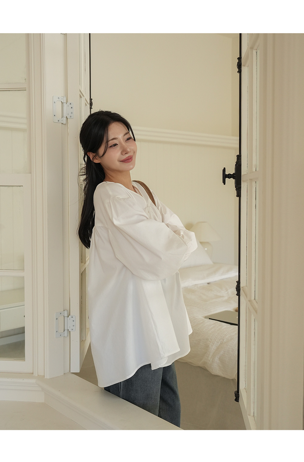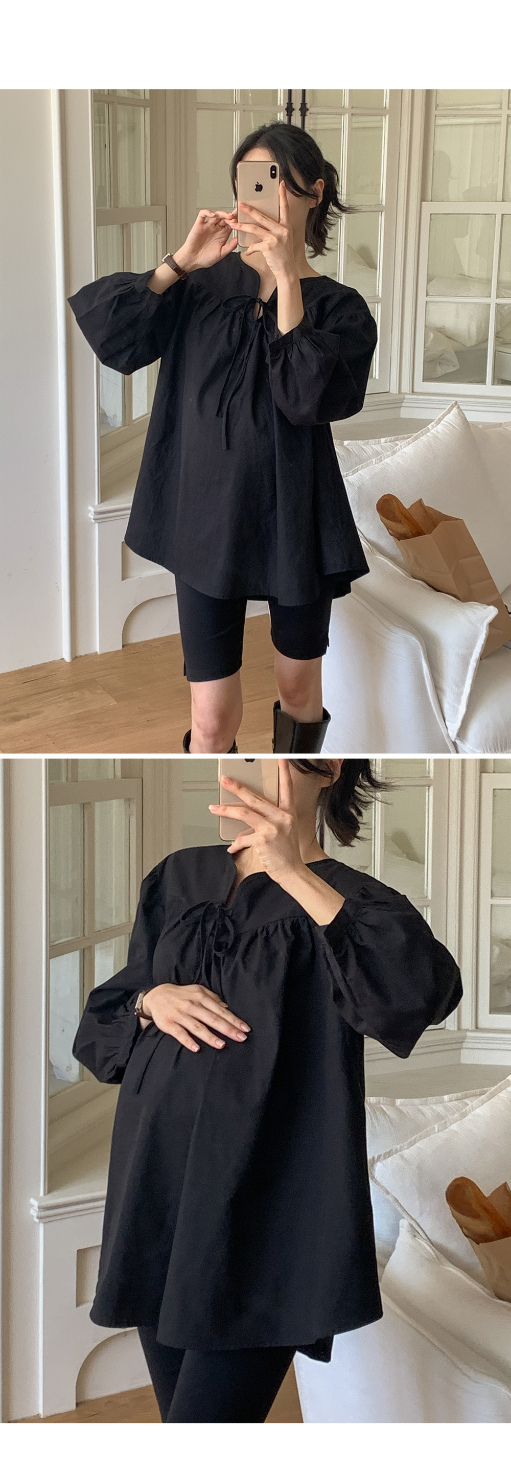 -네크라인의 리본과 은은한 셔링이 여성스러운 무드를