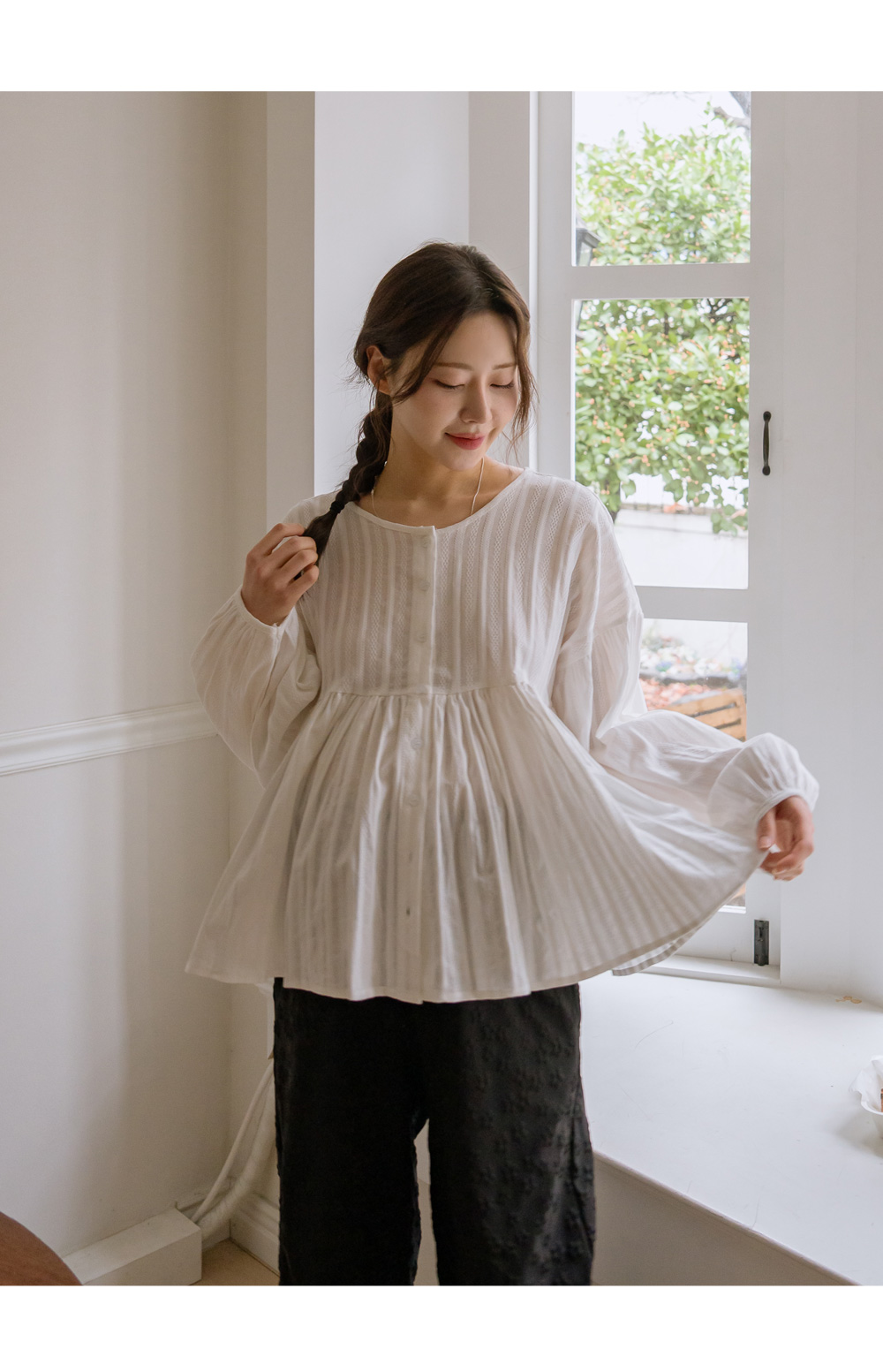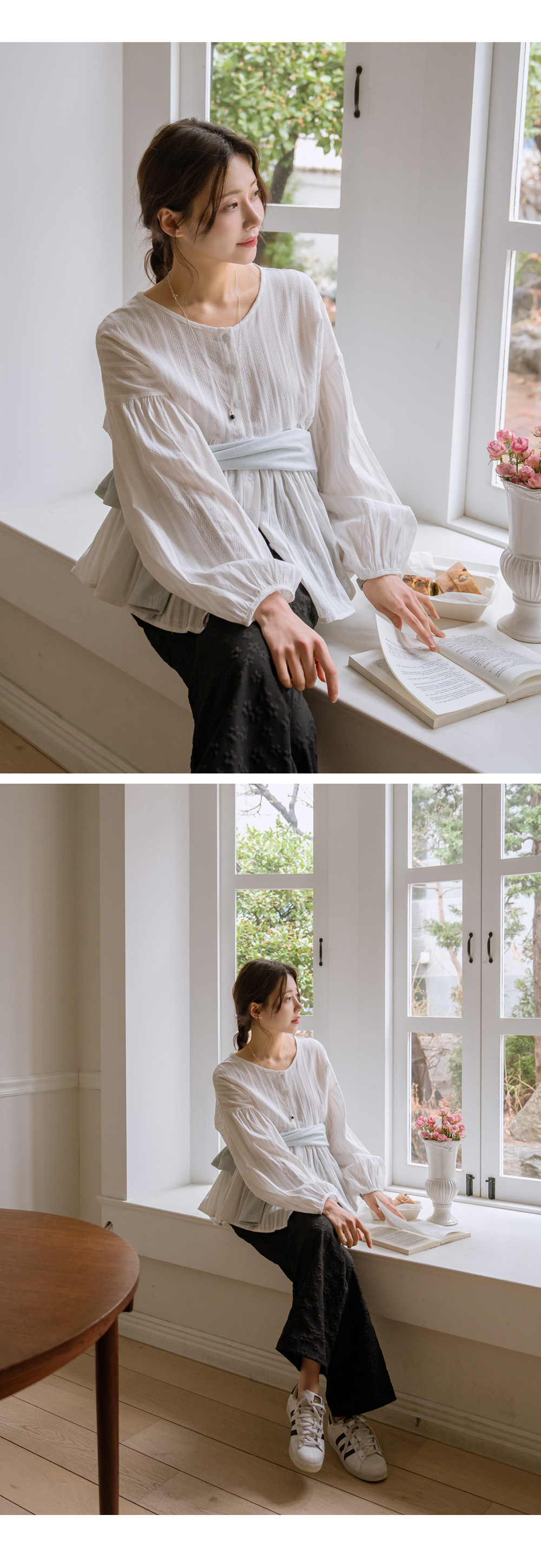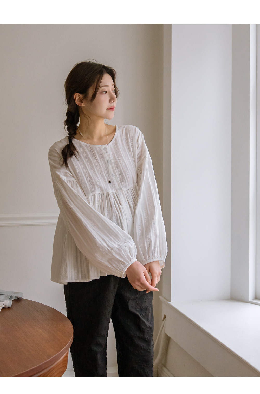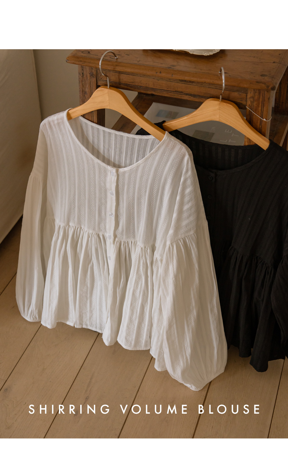 러블리한 무드의 셔링 볼륨 블라우스로,