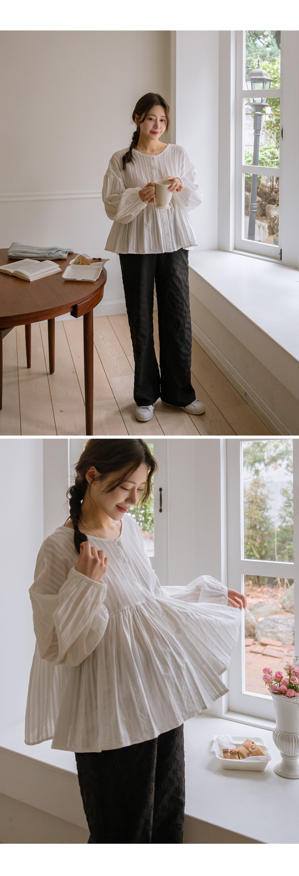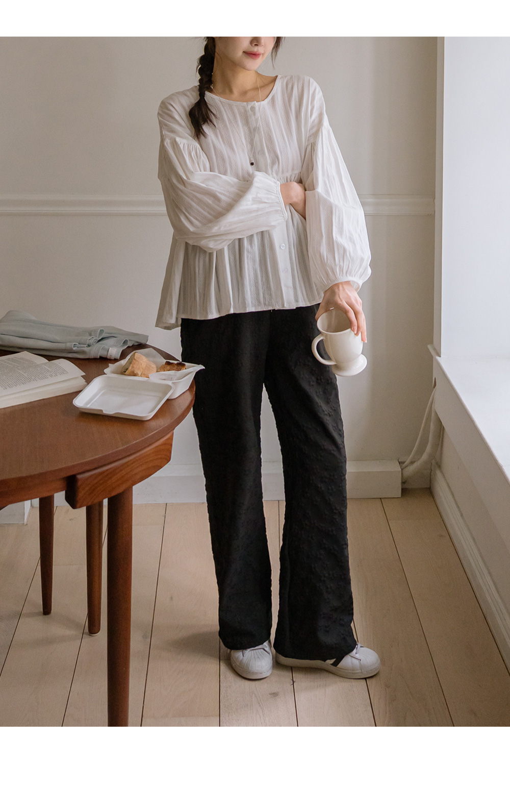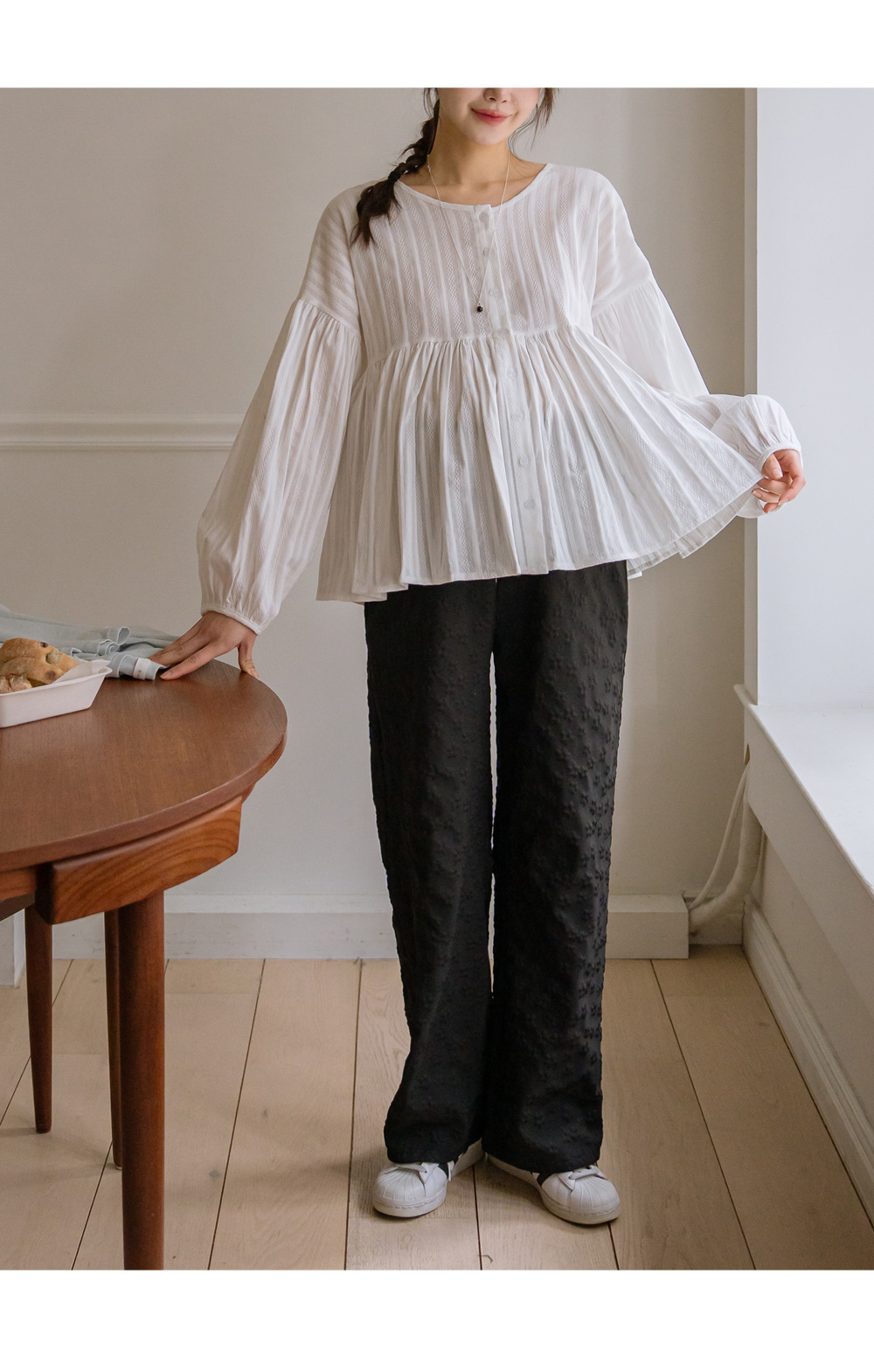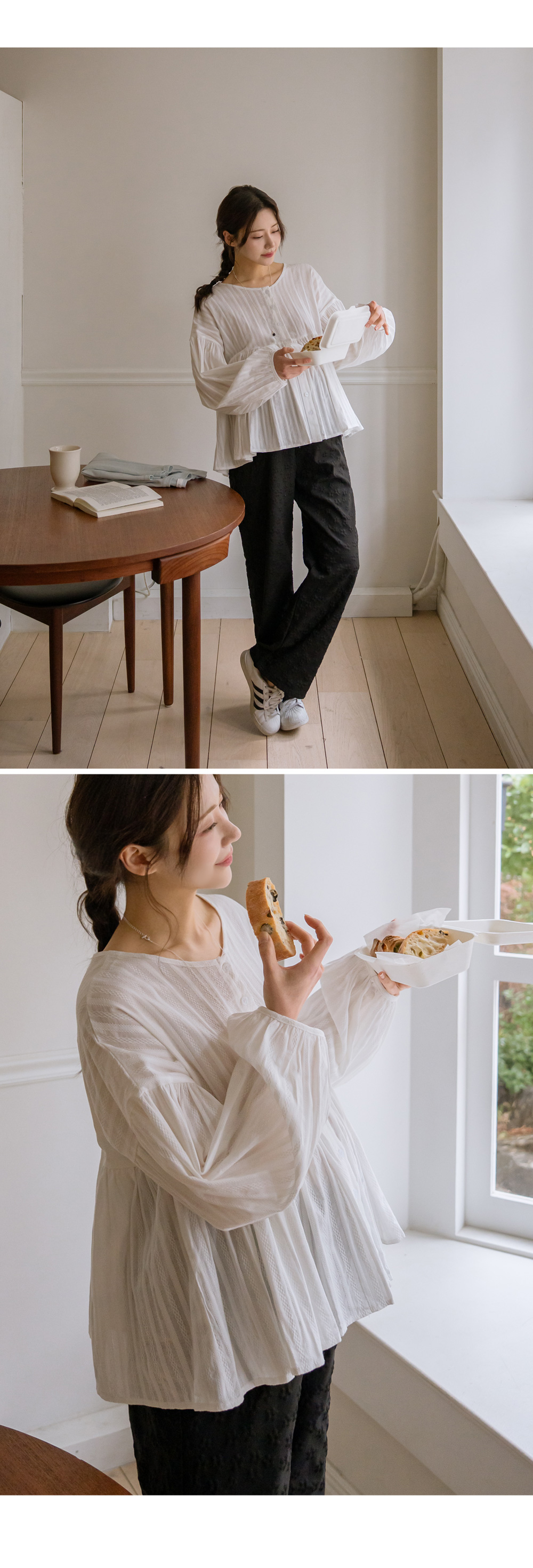 러블리한 무드의 셔링 볼륨 블라우스로,