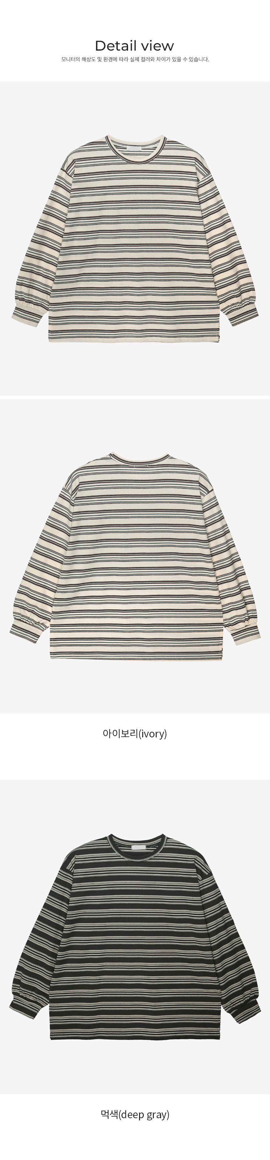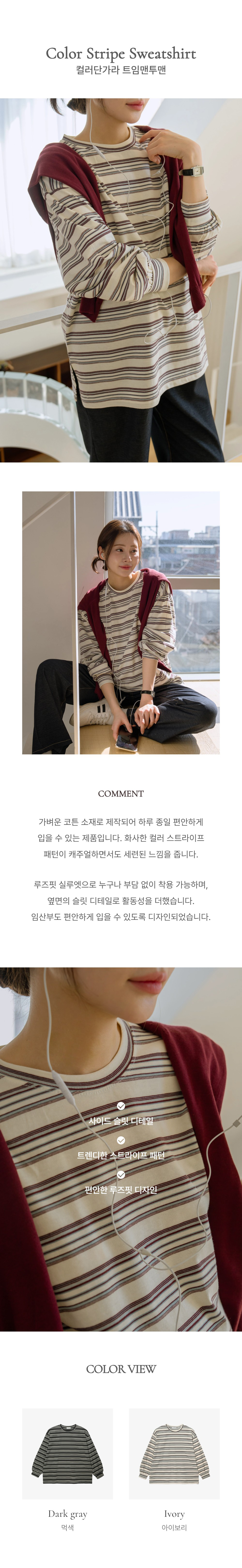 Product information-가벼운 코튼 소재로 제작된 컬러 스트라이프 티셔츠로 데일리룩에 활용하기 좋은 아이템입니다.-루즈핏 실루엣으로 체형에 구애 없이 편안하게 착용 가능한 데일리 티셔츠입니다. -컬러 배색 스트라이프 패턴이 더해져 캐주얼하고 경쾌한 무드를 연출해줍니다. -사이드 옆트임 디테일로 활동성을 높여주며 자연스럽게 떨어지는 핏으로 부담 없이 착용할 수 있습니다. -단독으로도 포인트가 되며 맨투맨, 가디건, 후드집업 이너 티셔츠로 레이어드 활용하기 좋은 스트라이프 티셔츠입니다. |