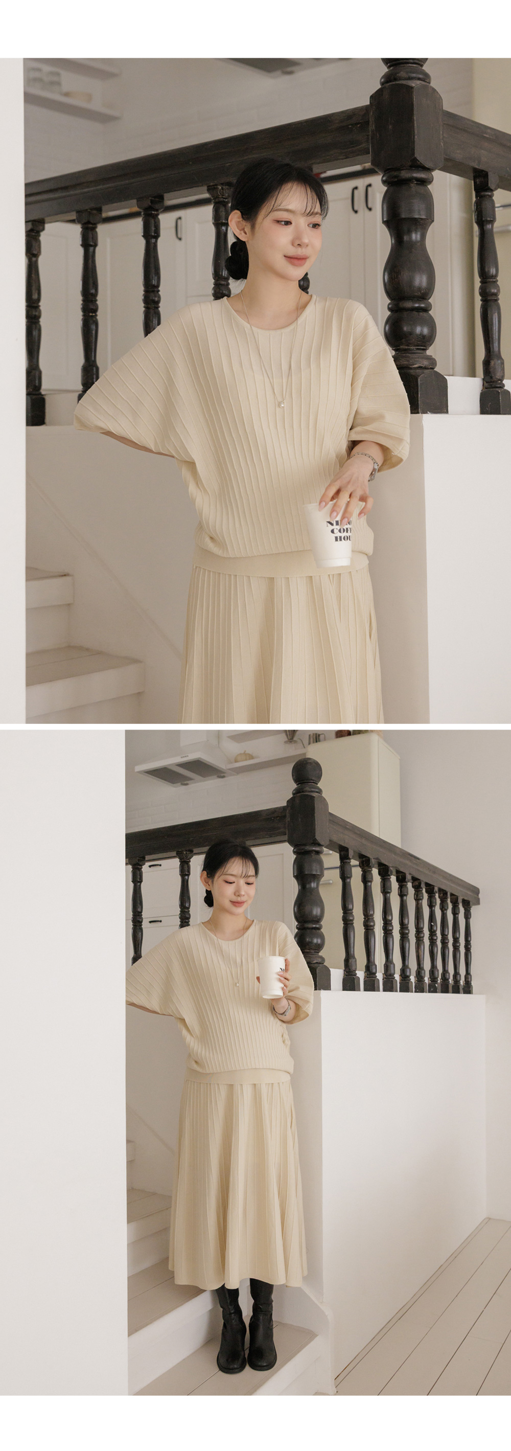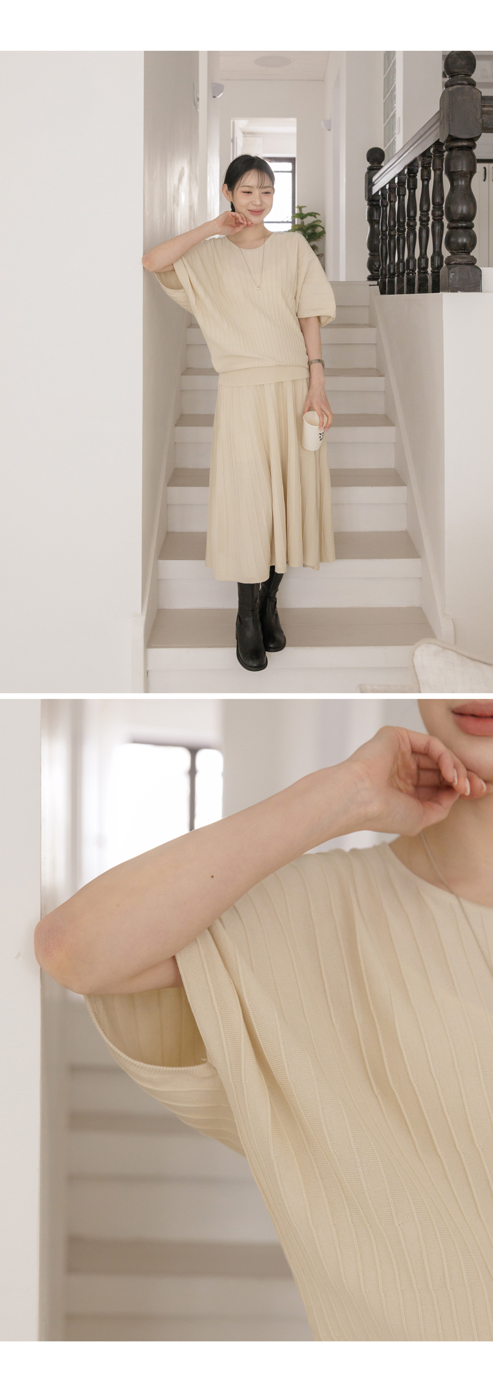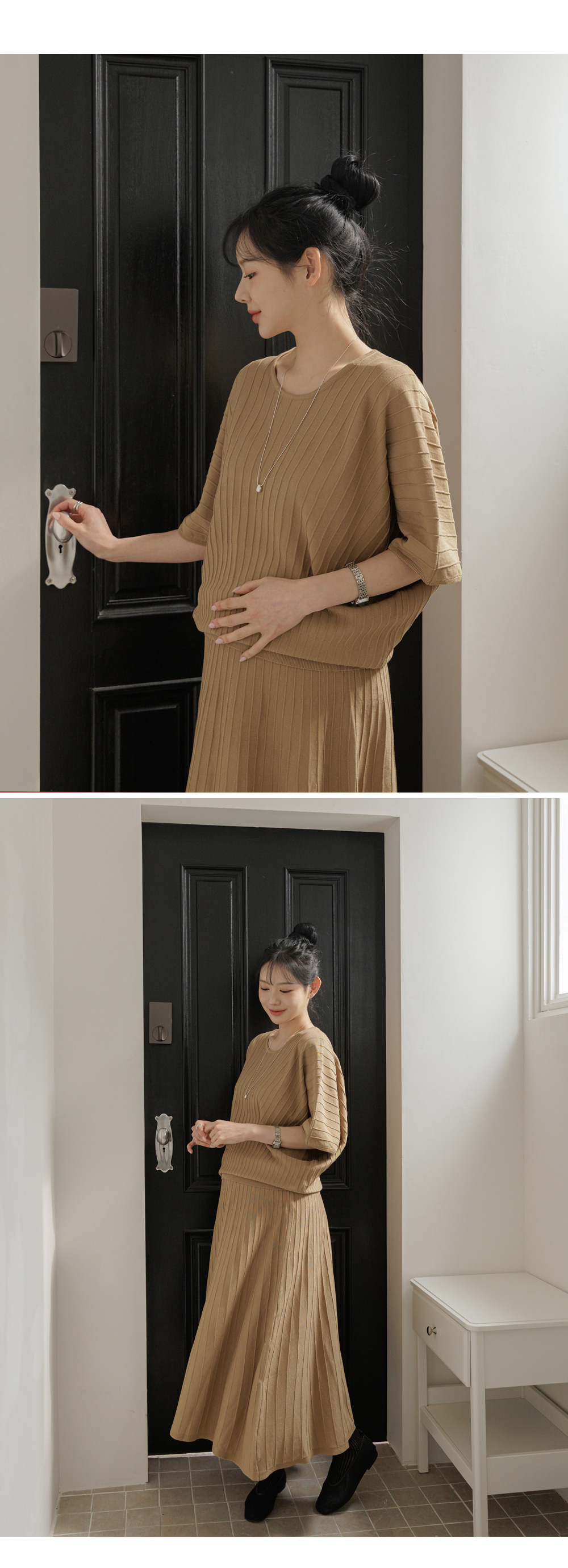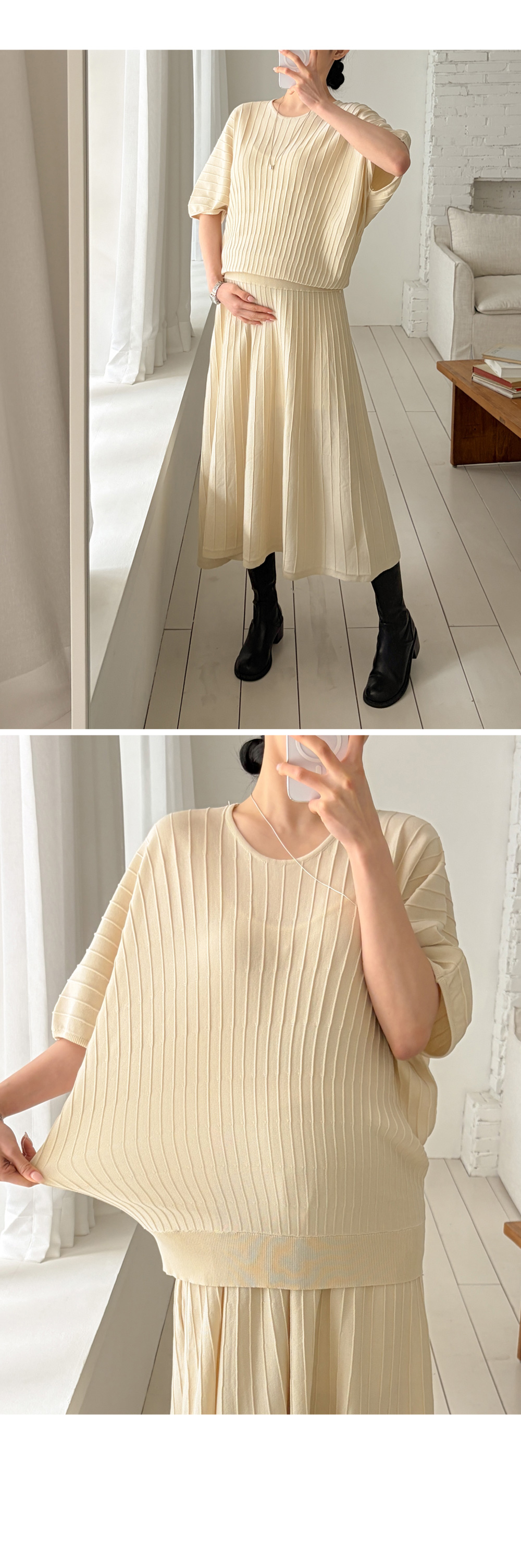 Product information임신 전후로 활용하기 좋은 니트 투피스입니다.어깨선이 자연스럽게 떨어지는 가오리핏입니다. 임산부 배도 안정적으로 커버해주는 허리 밴딩디자인입니다. 체형 커버에 도움을 주는 플레어 실루엣입니다. |