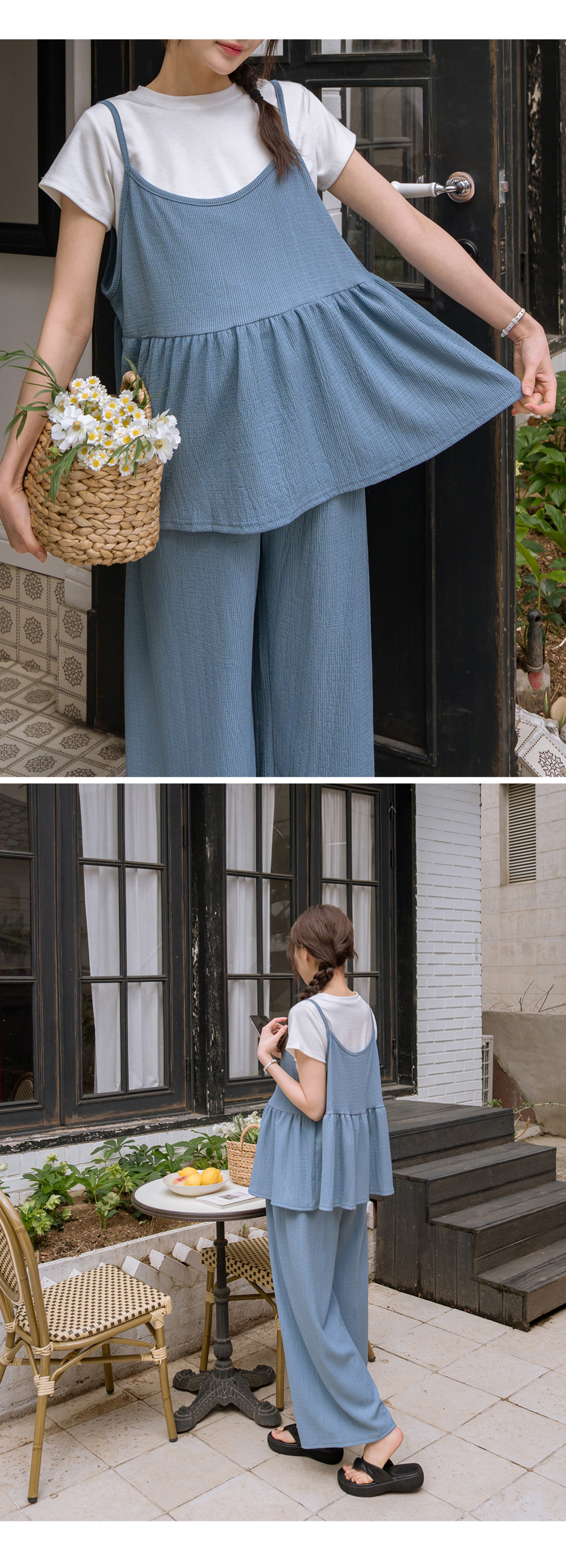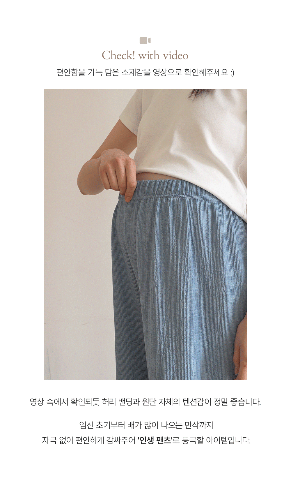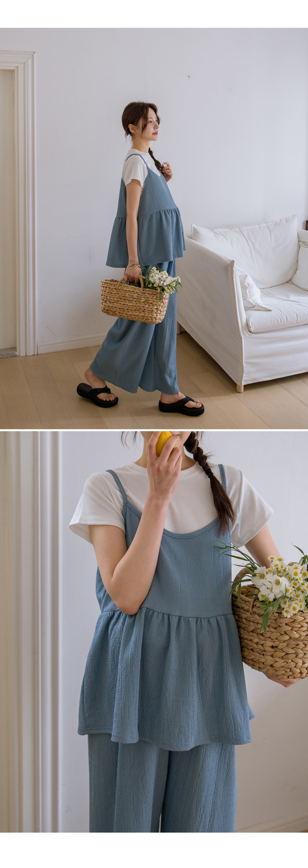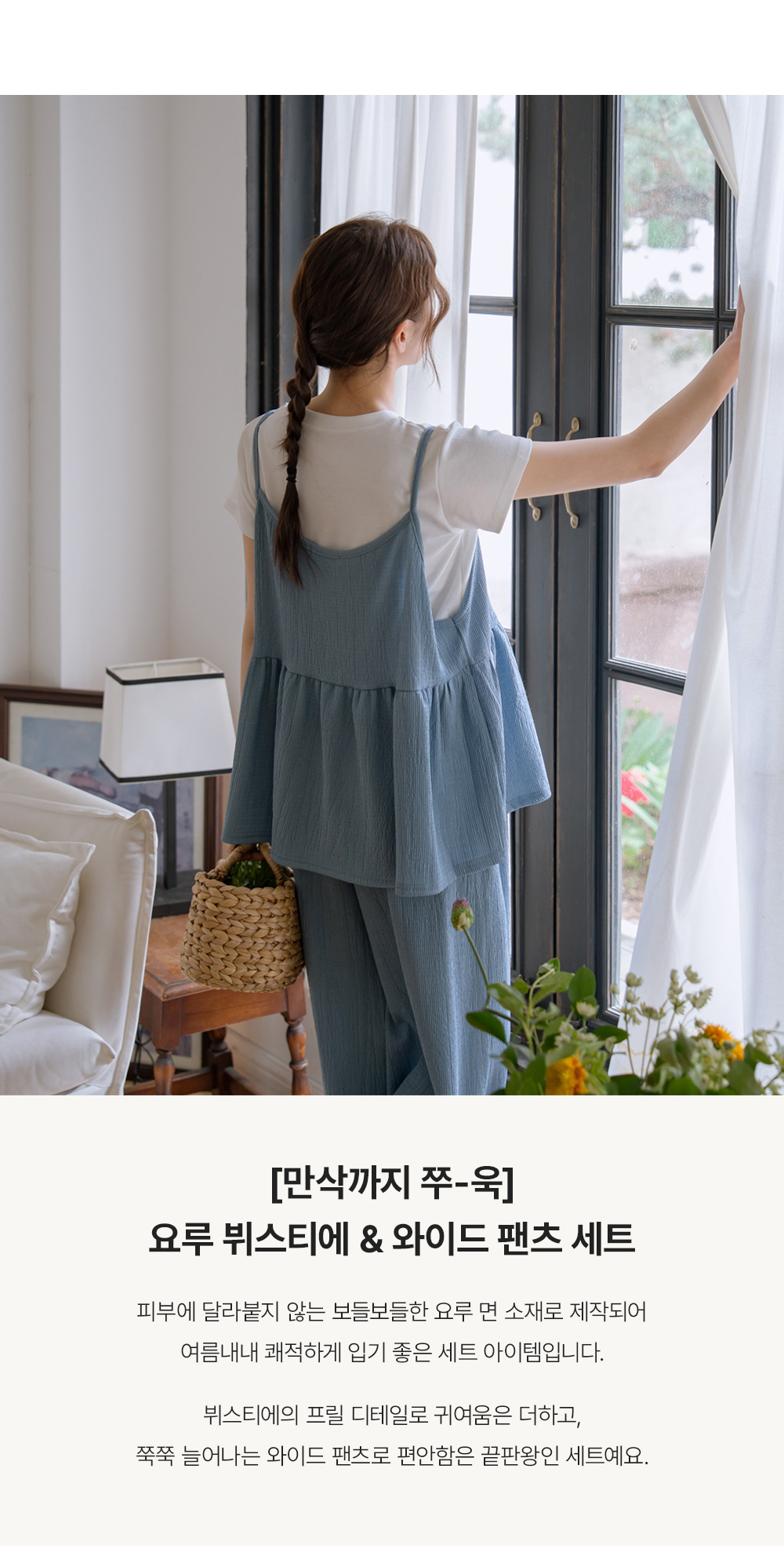Product information달라붙지 않는 보들보들한 요루 면 소재를 사용하여 여름 내내 쾌적한 착용감을 선사합니다.러블리한 프릴 뷔스티에와 신축성 끝판왕 와이드 팬츠 구성으로 편안함과 스타일을 모두 잡았습니다. 원단 자체의 우수한 텐션감과 부드러운 허리 밴딩이 만삭 D라인을 자극 없이 포근하게 감싸줍니다. 가슴 아래로 퍼지는 프릴 디자인이 배 라인을 자연스럽게 커버하며 여성스러운 무드를 완성합니다. 티셔츠와 레이어드하기 좋은 뷔스티에 디자인으로 노출 부담 없이 센스 있는 코디가 가능합니다. 군살을 싹 가려주는 와이드 핏과 찰랑이는 소재감이 다리 라인을 더욱 길고 슬림해 보이게 합니다. 활동성이 뛰어난 고신축 소재로 제작되어 임신 초기부터 만삭, 산후 홈웨어까지 활용도가 높습니다. |