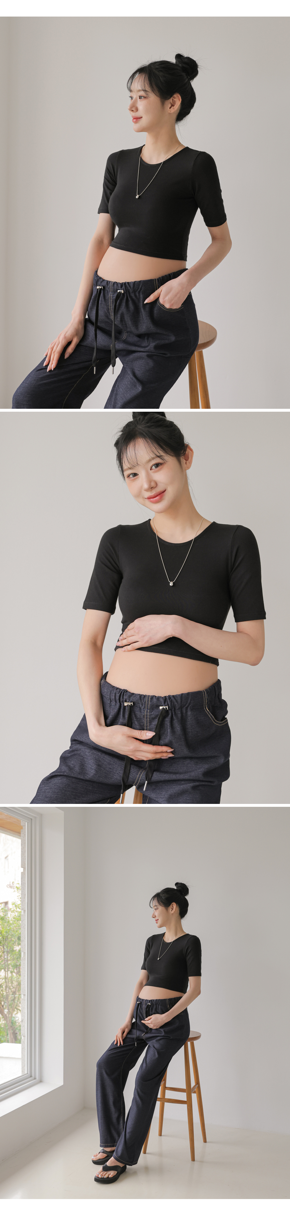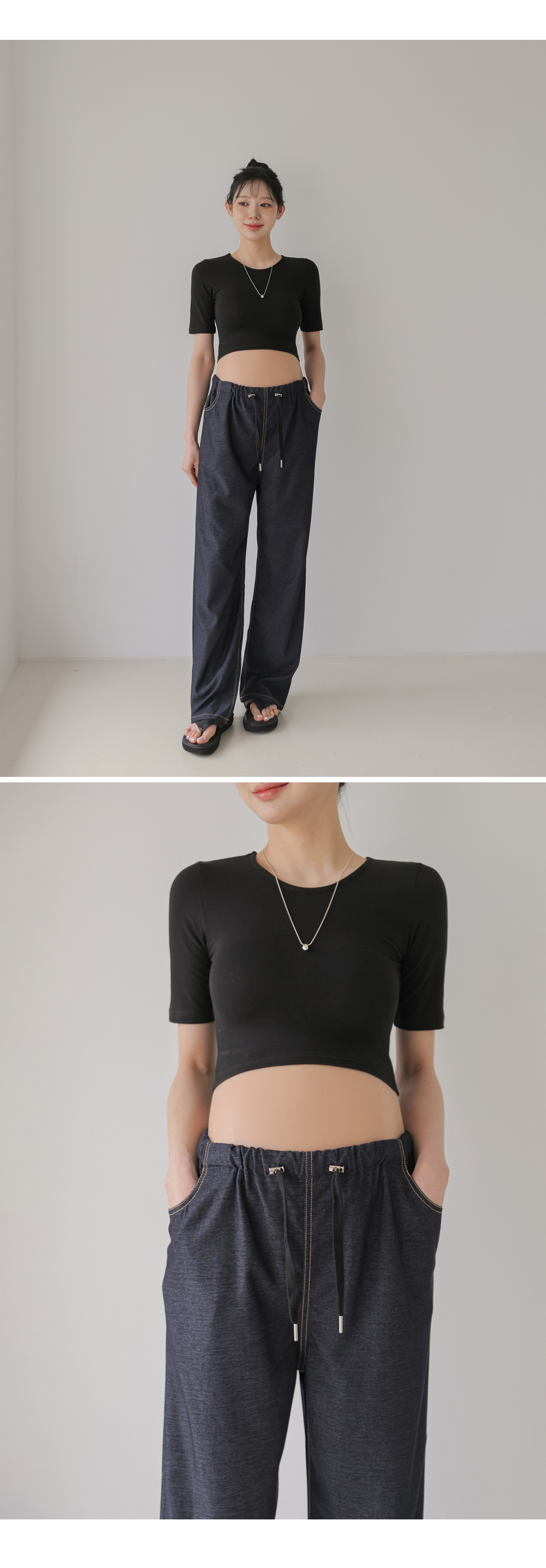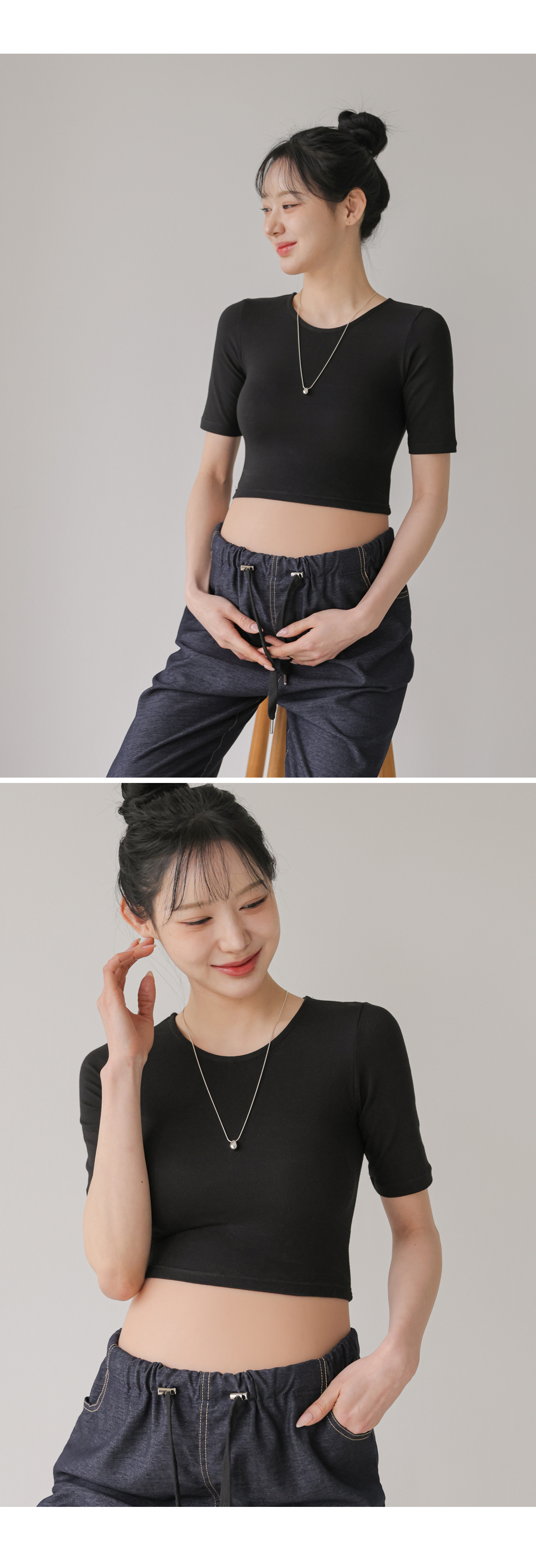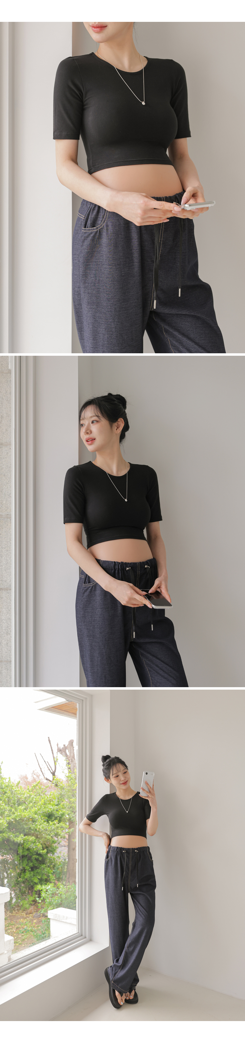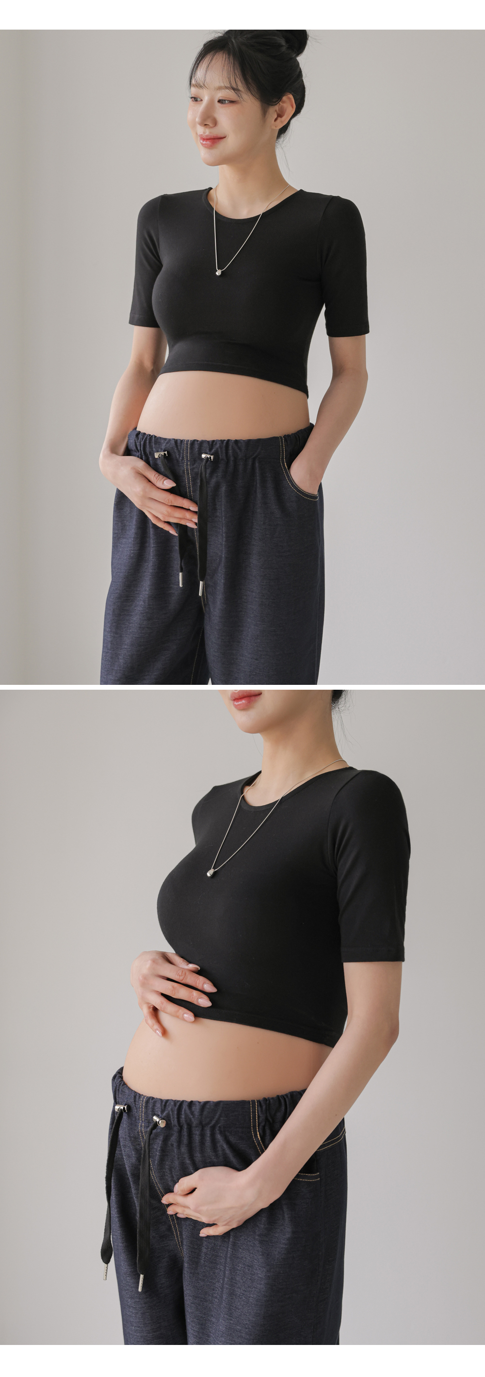 Product information라운드넥 디자인입니다.만삭배가 돋보이는 크롭기장입니다. 편안하게 늘어나는 스판 소재입니다. |