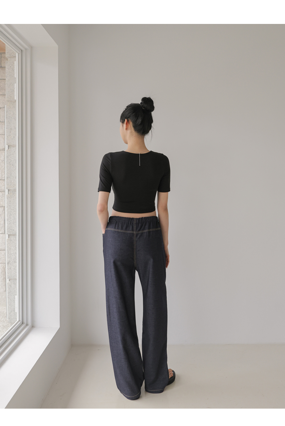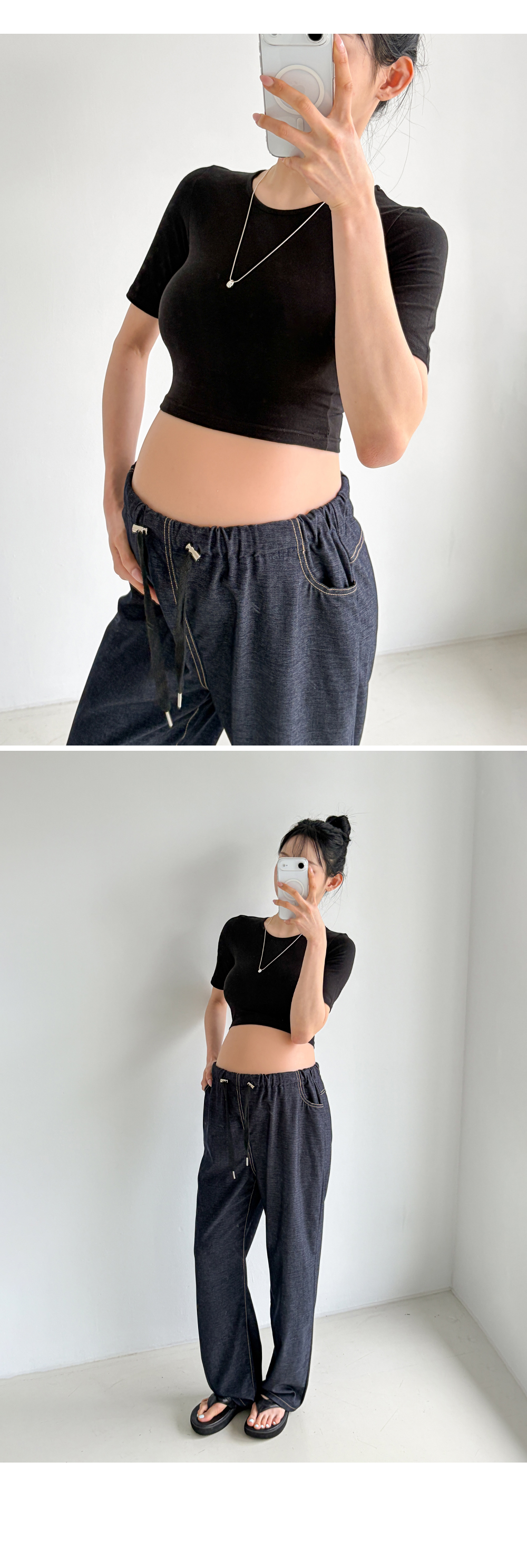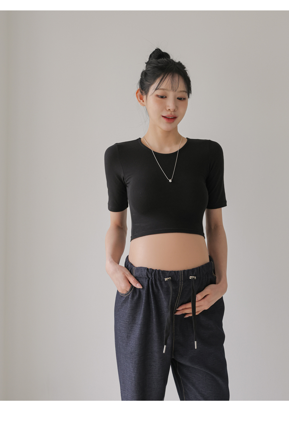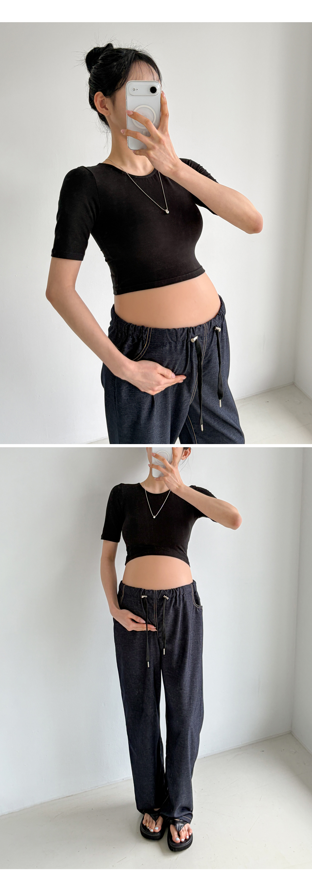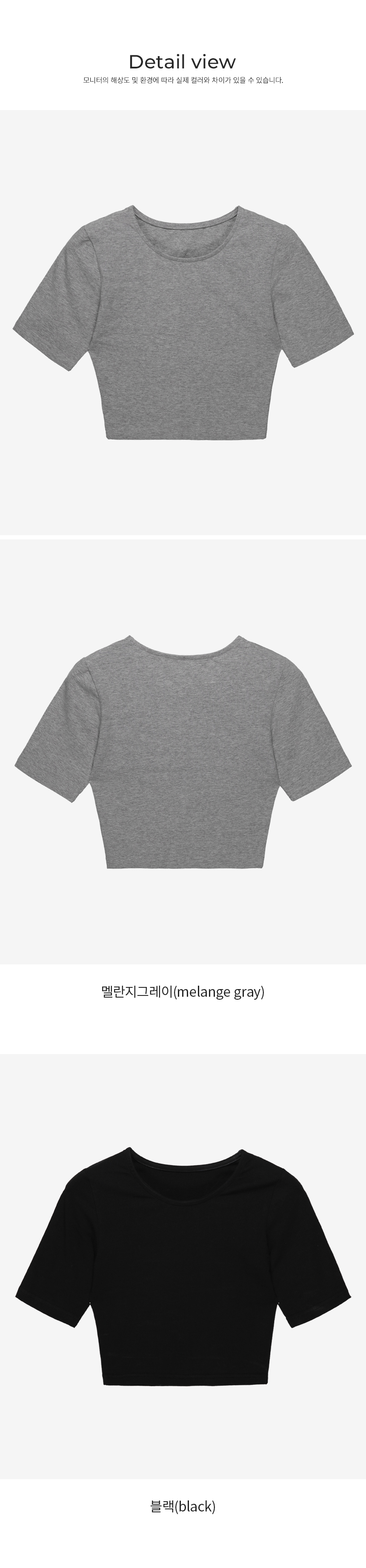 Product information라운드넥 디자인입니다.만삭배가 돋보이는 크롭기장입니다. 편안하게 늘어나는 스판 소재입니다. |