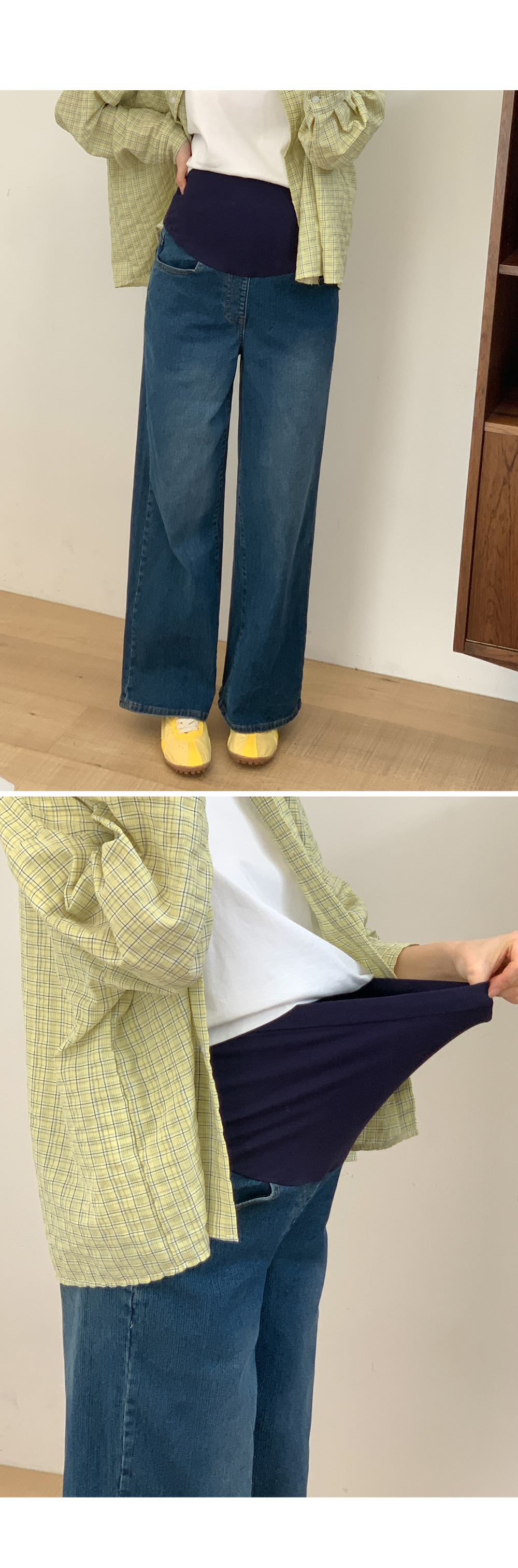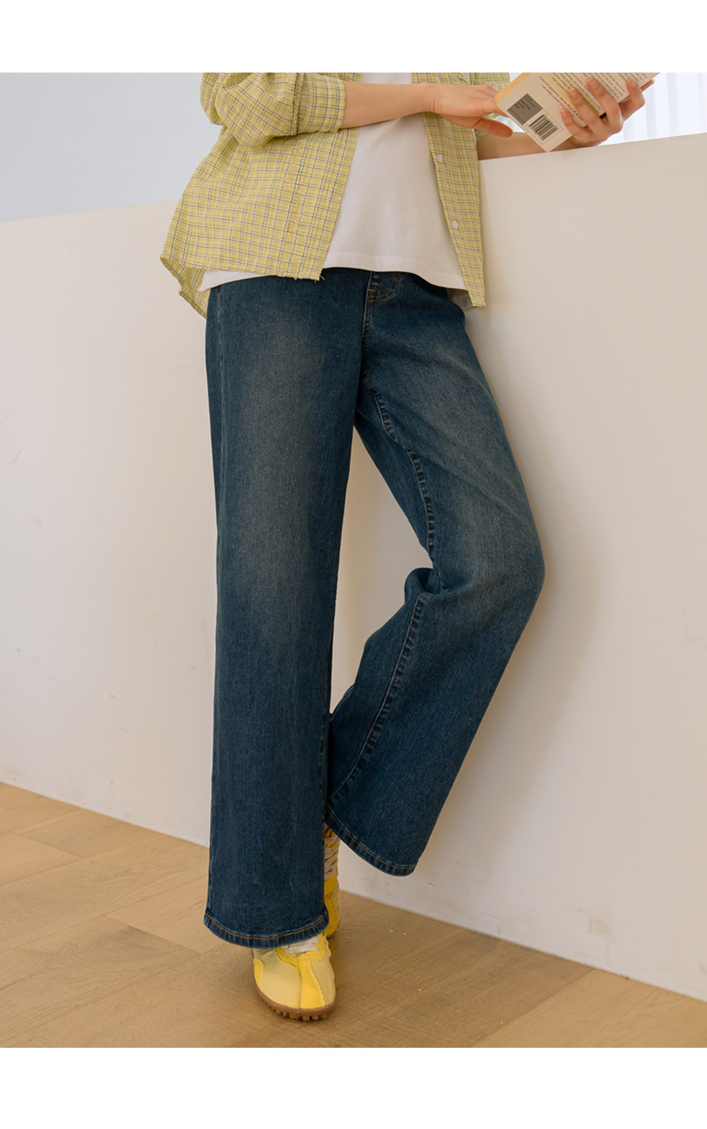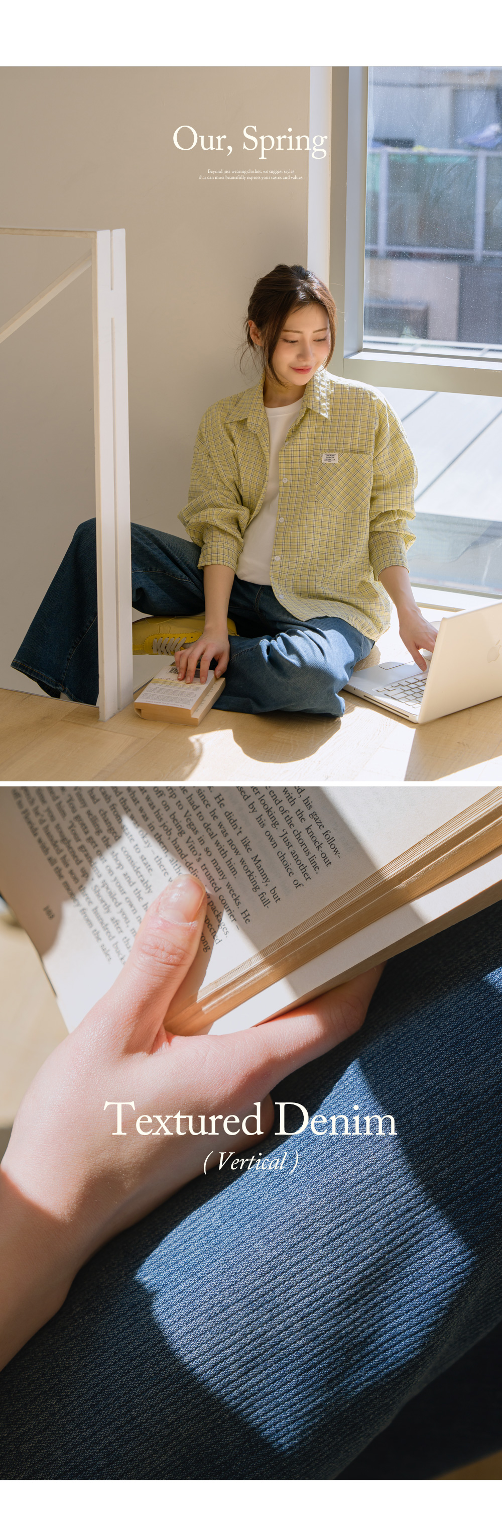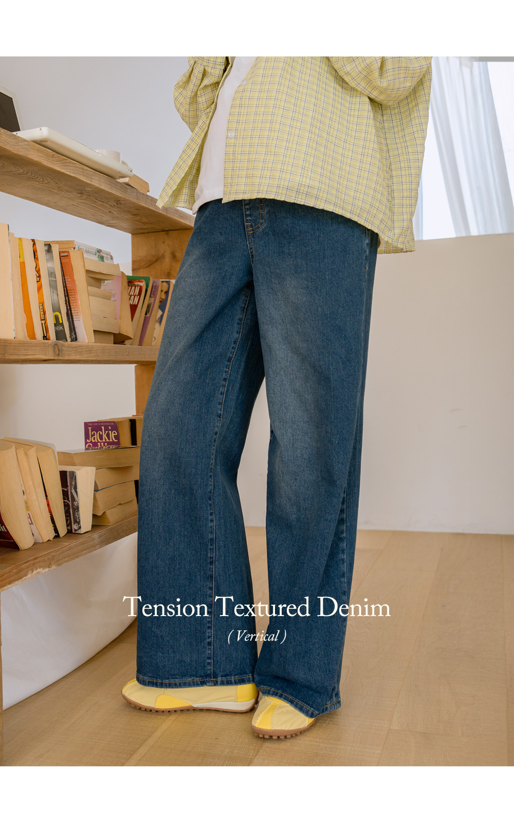 Adjustable band type Wide-fit jeans with a corrugated texture