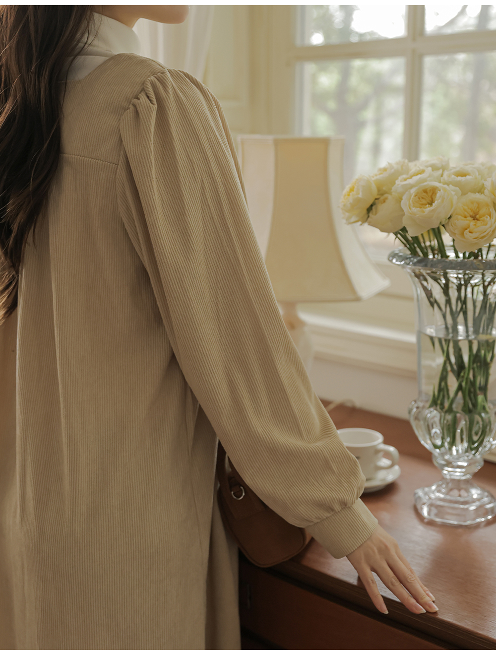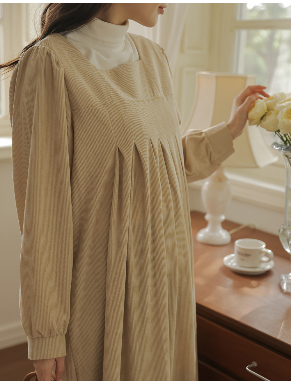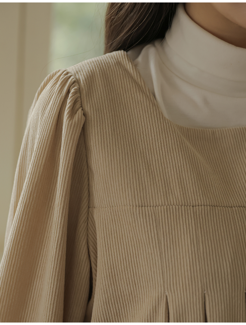 촘촘한 핀턱 디테일로 슬림해보이는 실루엣 MD's comment -어깨와 뒷면 셔링 디테일로 여성스러운 무드 -넉넉한 사이즈로 자연스러운 체형 커버 -단독 또는 폴라티와 레이어드하여 착용 가능