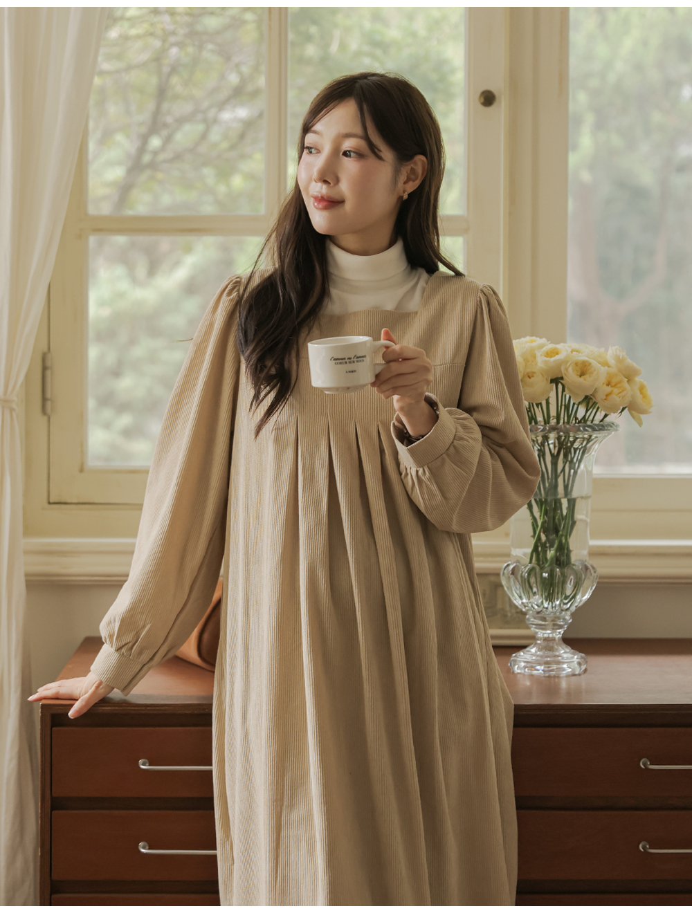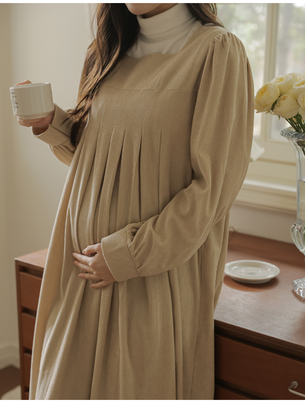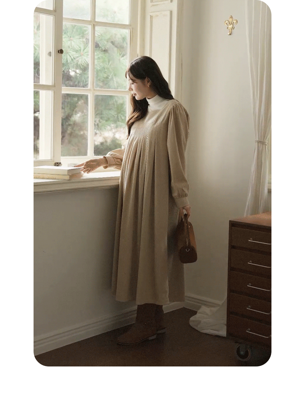 촘촘한 핀턱 디테일로 슬림해보이는 실루엣 MD's comment -어깨와 뒷면 셔링 디테일로 여성스러운 무드 -넉넉한 사이즈로 자연스러운 체형 커버 -단독 또는 폴라티와 레이어드하여 착용 가능