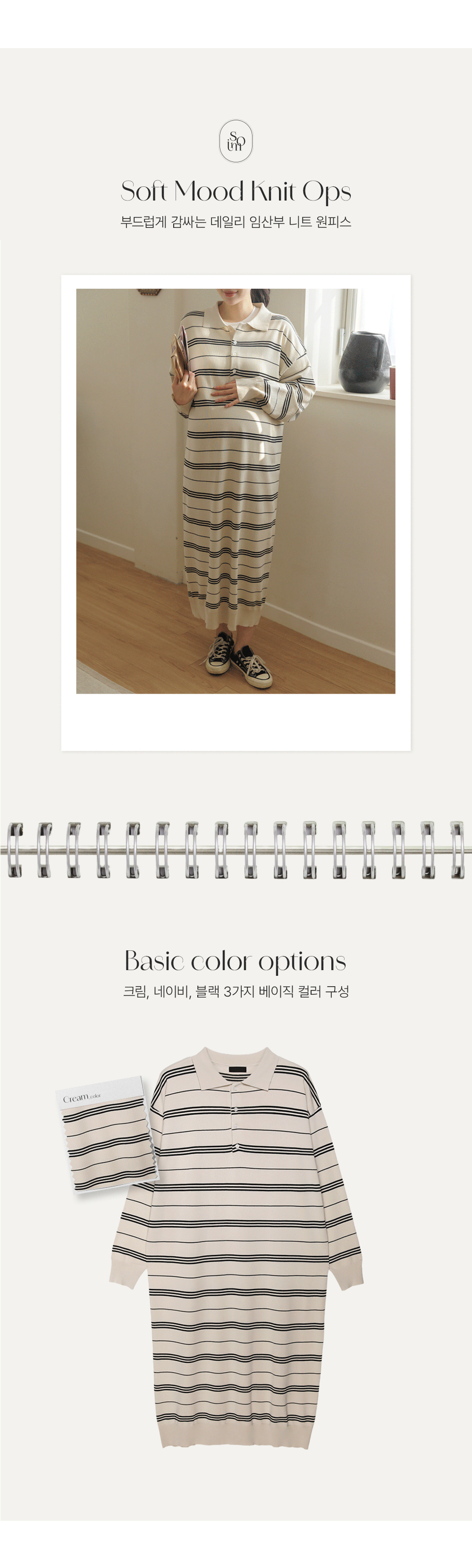 유연한 신축성과 가벼운 원사로 봄·가을 간절기에 입기 좋은 스트라이프 패턴 임산부 니트 원피스
