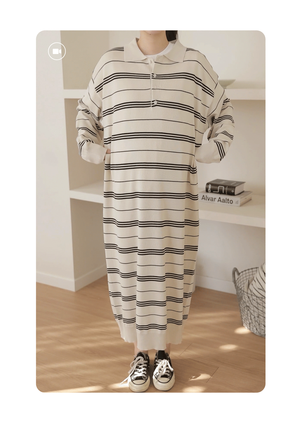 카라 디자인과 버튼 디테일이 더해진 니트 원피스로 단정하면서도 캐주얼한 분위기를 동시에 연출