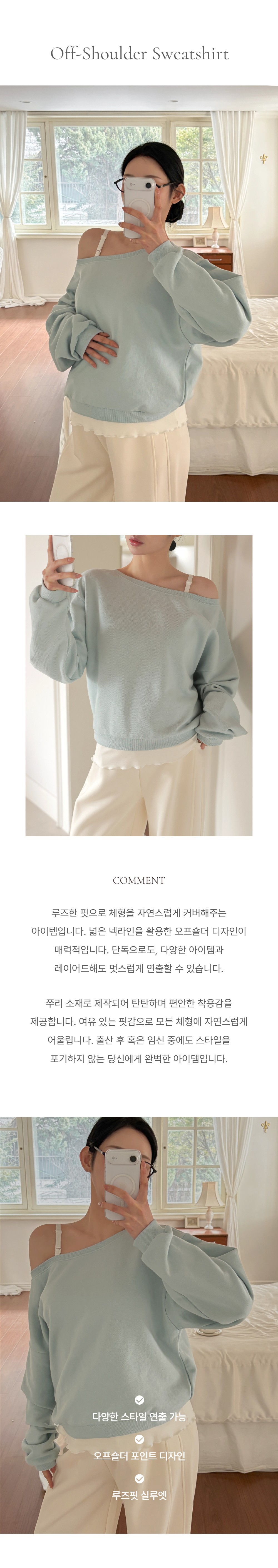 Product information출산 전후로 착용 가능한 임산부 맨투맨입니다.루즈핏 실루엣으로 체형커버에 용이한 디자인입니다. 단독 착용 및 레이어드에 모두 활용 가능한 아이템입니다. 넓은 넥라인으로 편안한 디자인입니다. |
