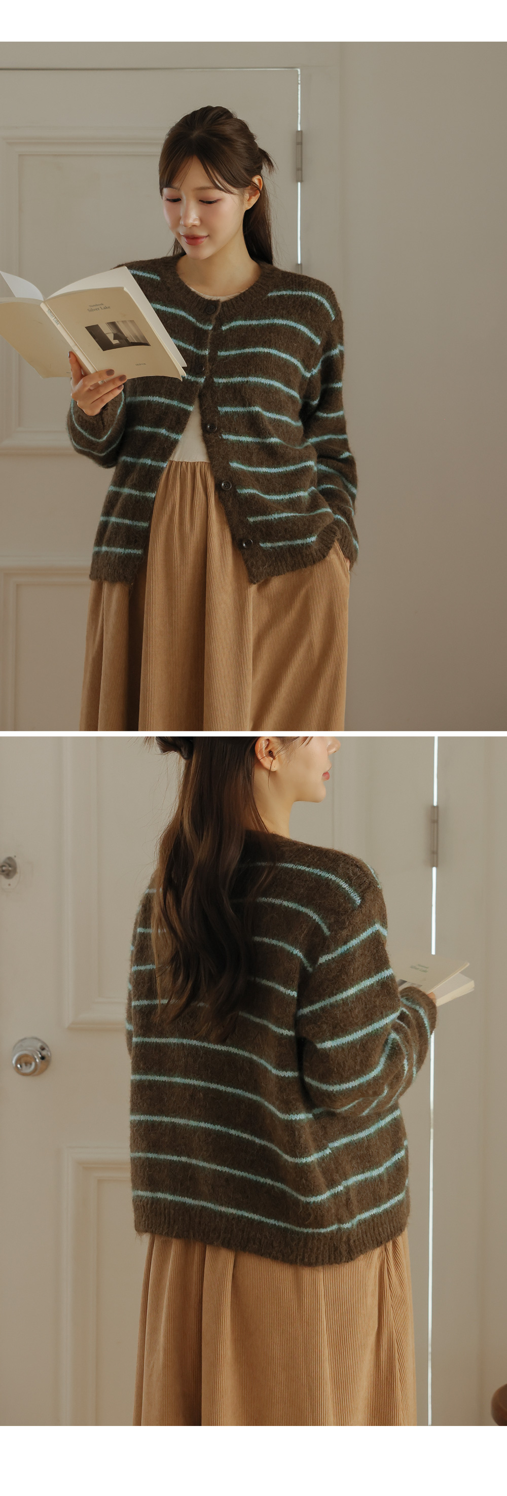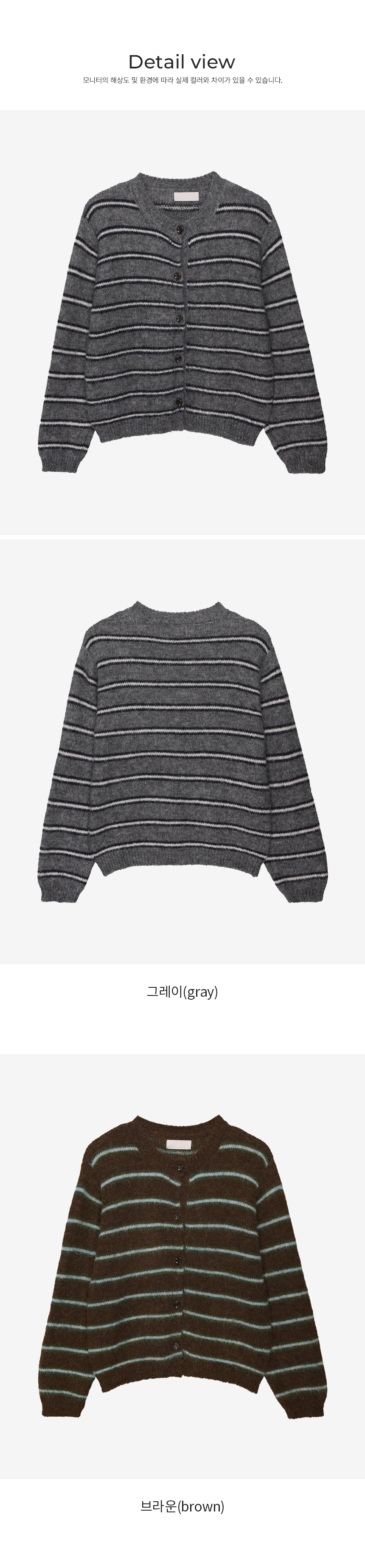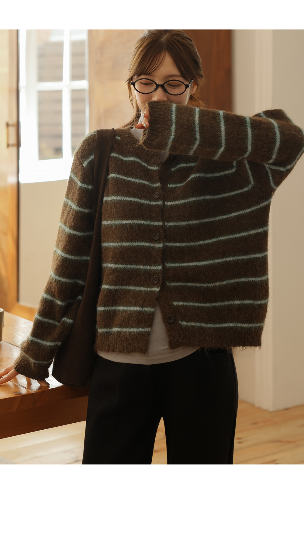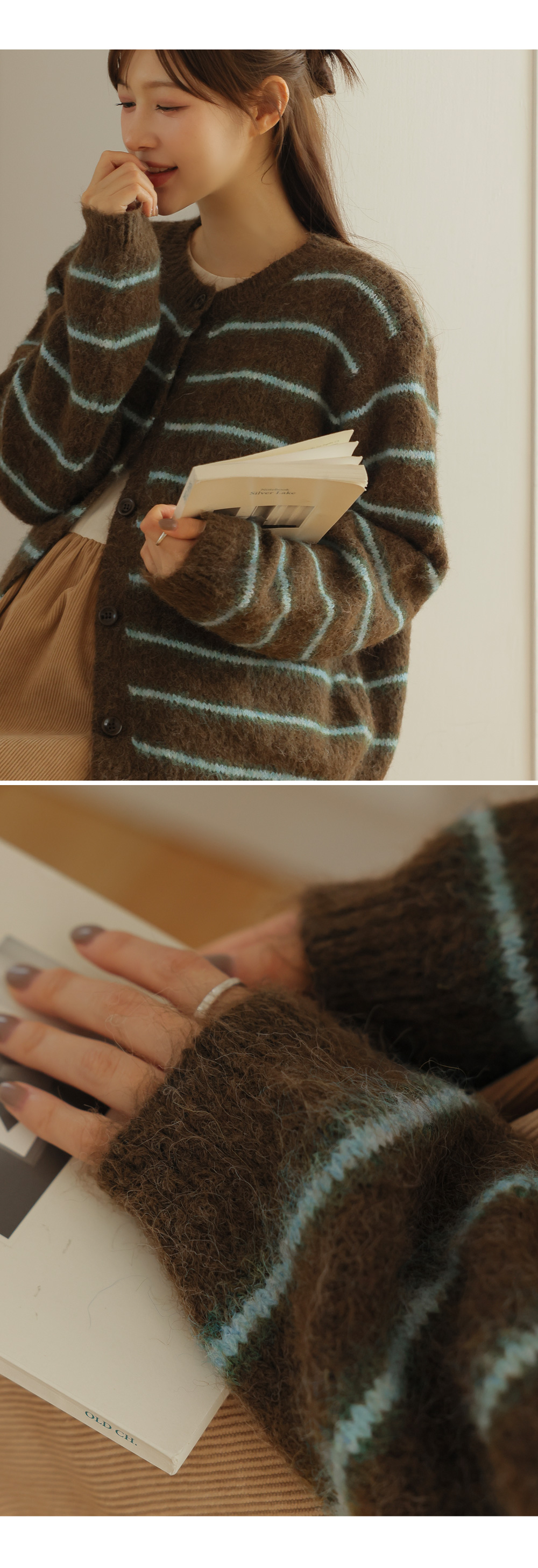 포슬포슬 헤어리한 소재감 또렷한 배색감이 예쁜 가디건 MD's comment - 포슬포슬 올라온 헤어리한 가디건 - 포근하고 유연한 니트 소재 - 또렷한 배색 스트라이프로 포인트 :) - 과하지 않게 여유로운 실루엣 - 데일리하기 좋은 적당한 기장감