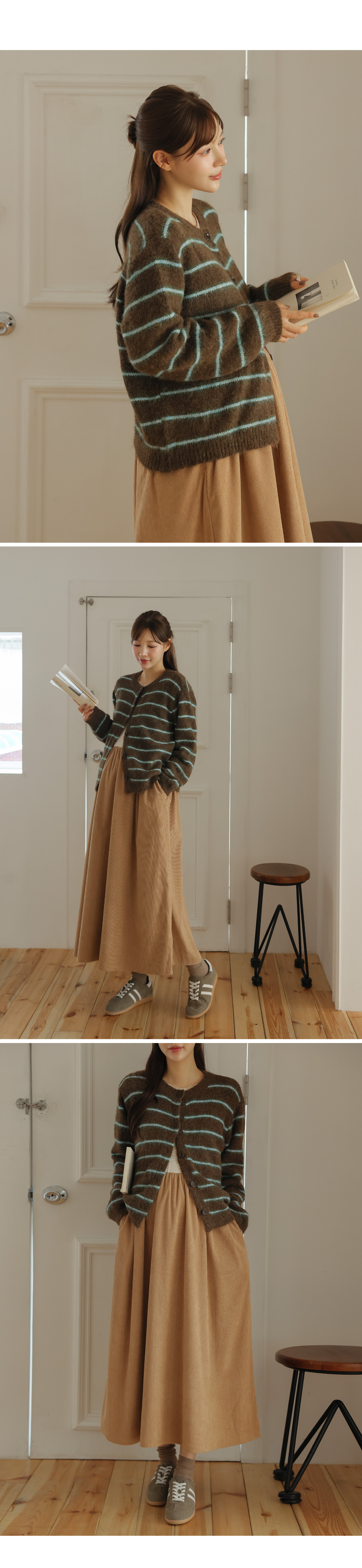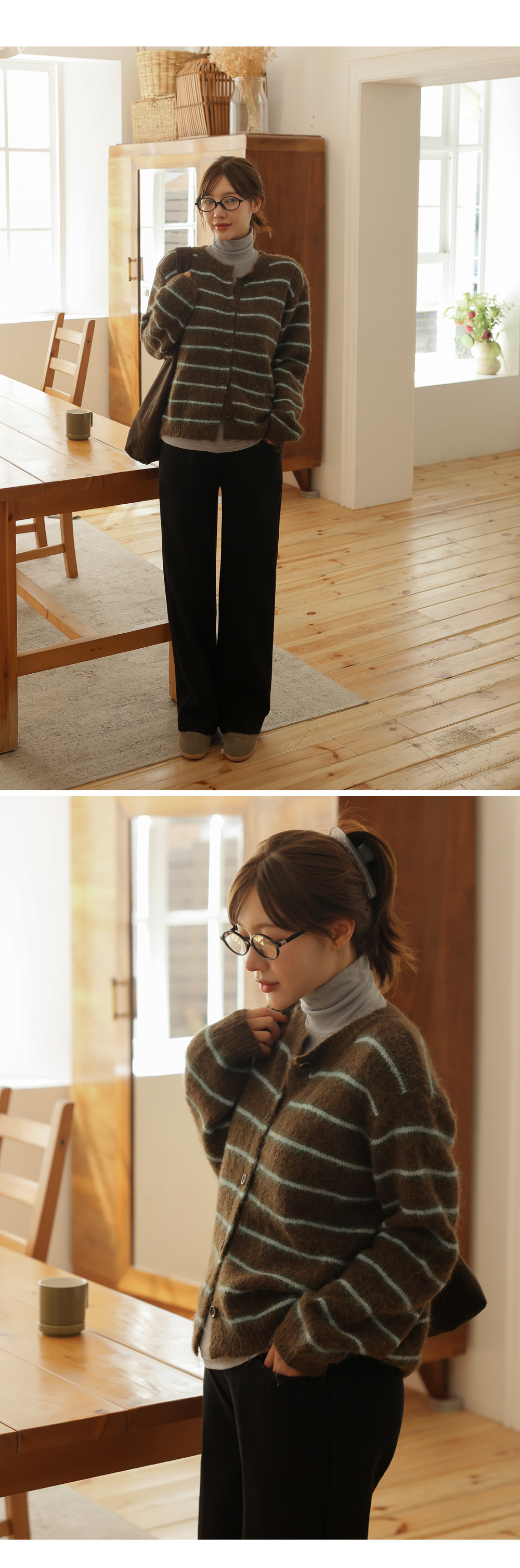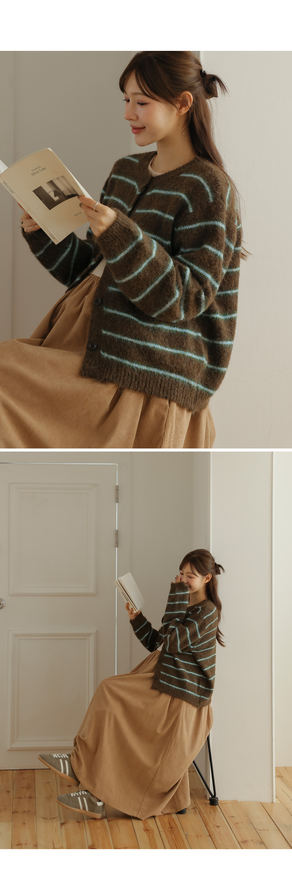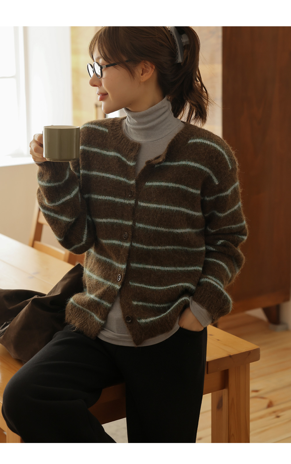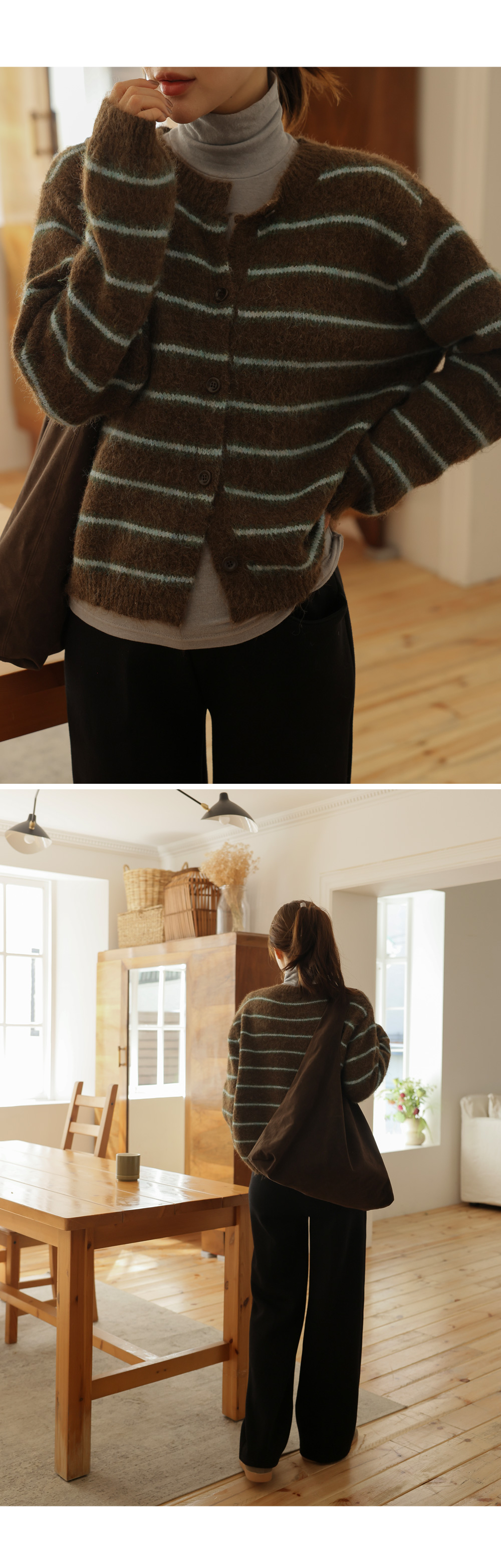포슬포슬 헤어리한 소재감 또렷한 배색감이 예쁜 가디건 MD's comment - 포슬포슬 올라온 헤어리한 가디건 - 포근하고 유연한 니트 소재 - 또렷한 배색 스트라이프로 포인트 :) - 과하지 않게 여유로운 실루엣 - 데일리하기 좋은 적당한 기장감
