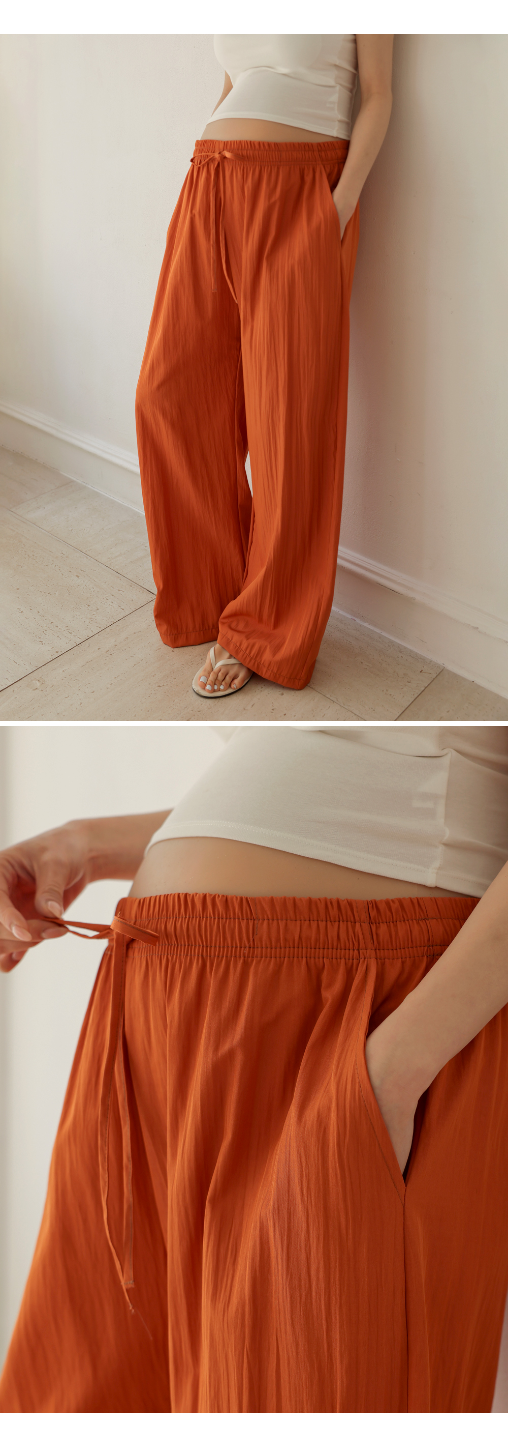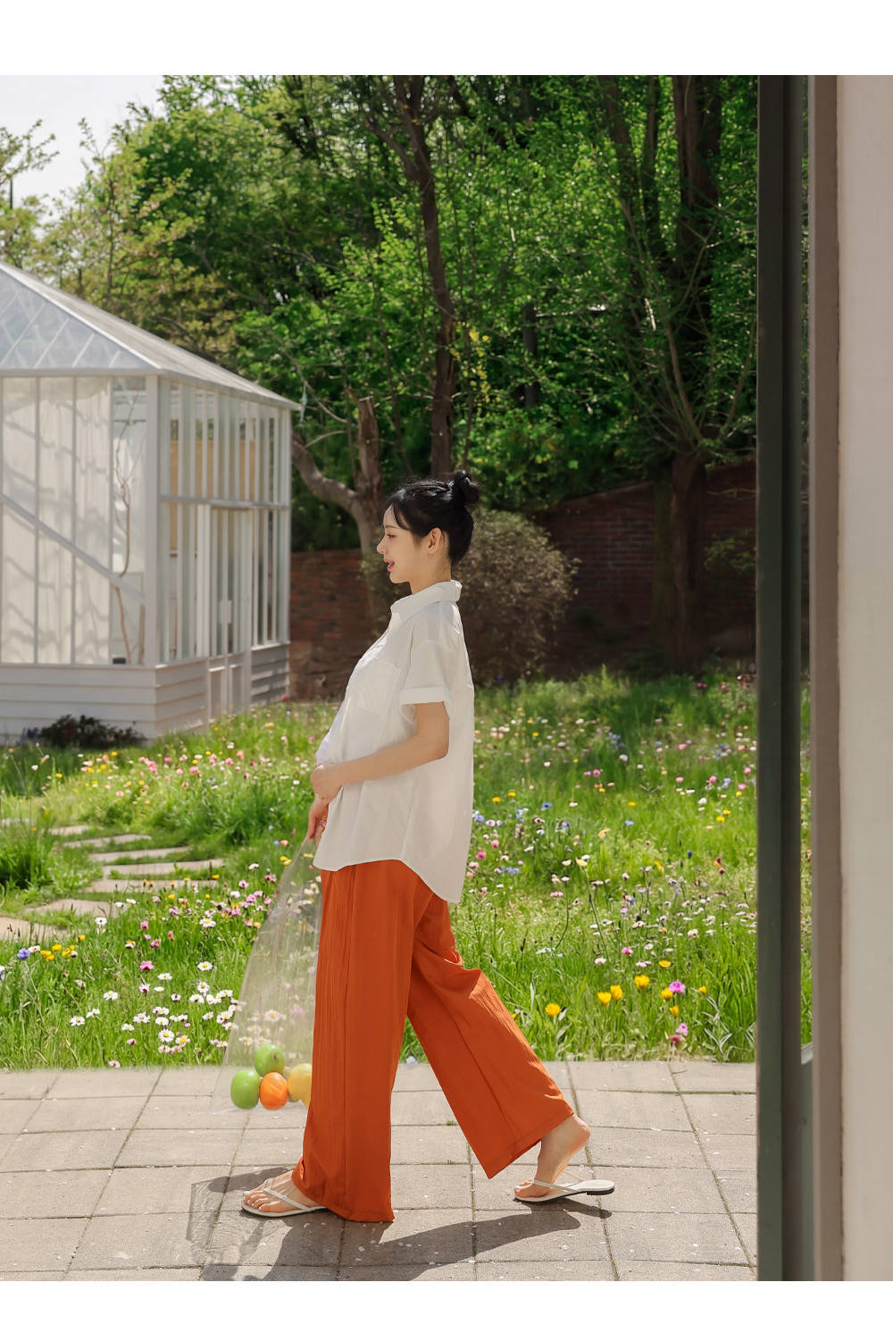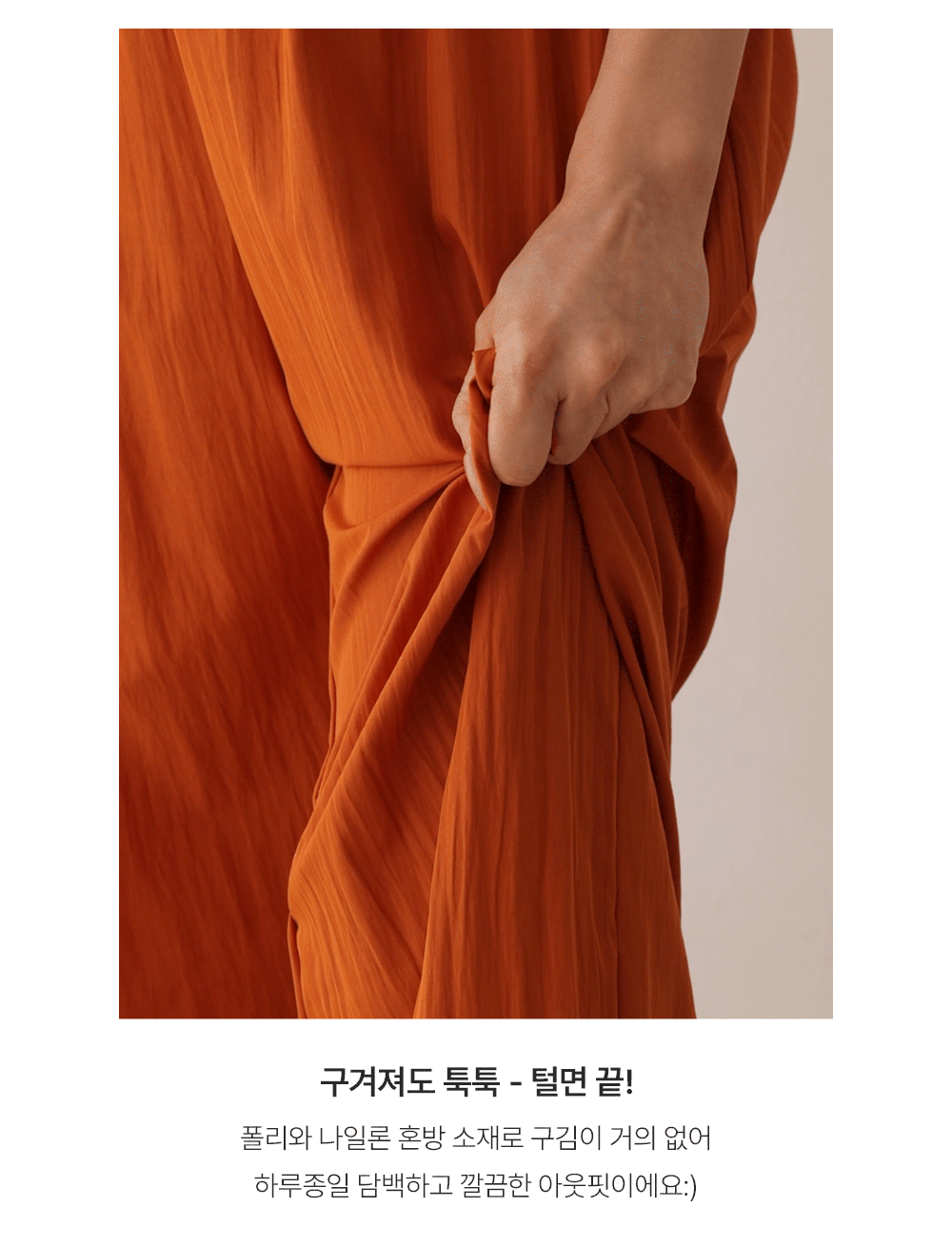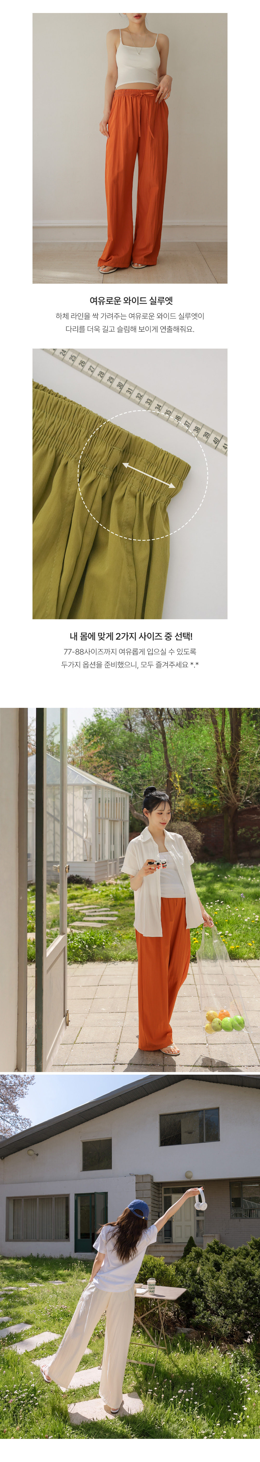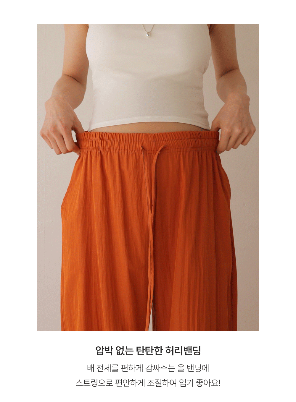 Product information가볍고 시원한 폴리 나일론 혼방 소재를 사용하여 한여름에도 몸에 붙지 않고 쾌적합니다.사이즈 1, 2 두 가지 구성으로 제작되어 임신 초기부터 만삭까지 체형에 맞춰 편안하게 선택 가능합니다. 허리 전체 밴딩 디테일이 복부를 부드럽게 지지해 주어 압박감 없는 편안한 착용감을 선사합니다. 여유롭게 떨어지는 와이드 핏이 다리 라인 군살을 완벽하게 커버하며 롱한 레그라인을 완성합니다. 오렌지, 올리브, 크림, 블랙 4가지 컬러 구성으로 데일리룩부터 포인트룩까지 활용도가 높습니다. 구김이 적고 복원력이 좋은 소재 특성상 세탁 후 관리가 간편하며 매일 입기 좋은 데일리 아이템입니다. |