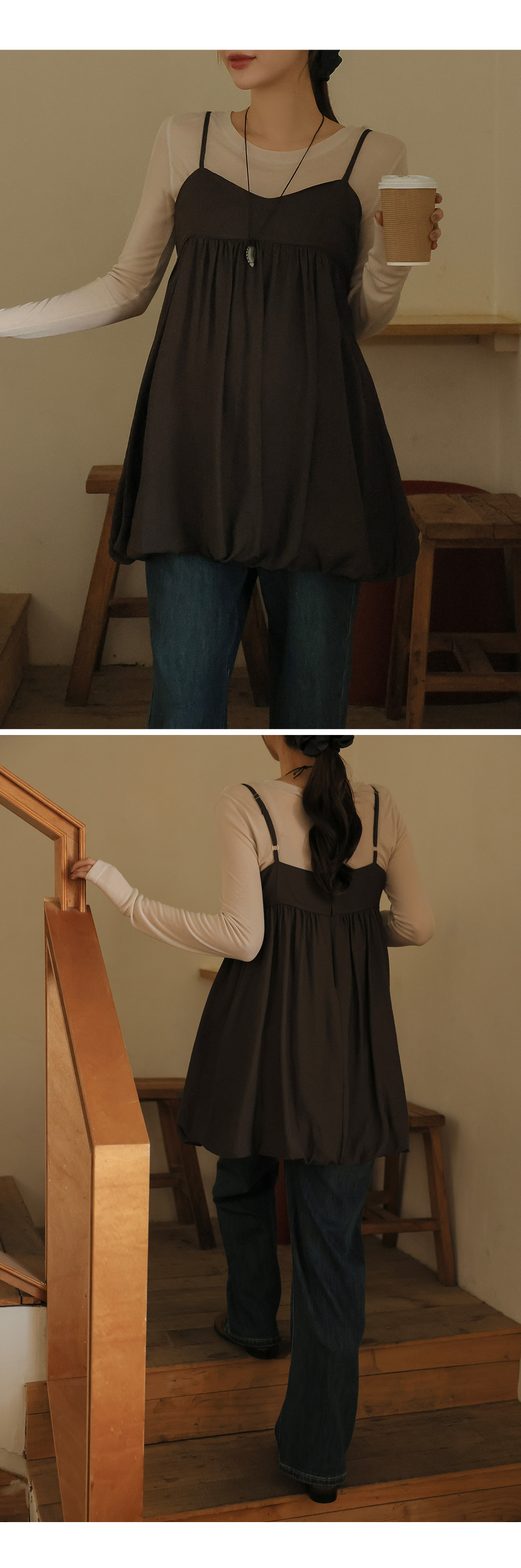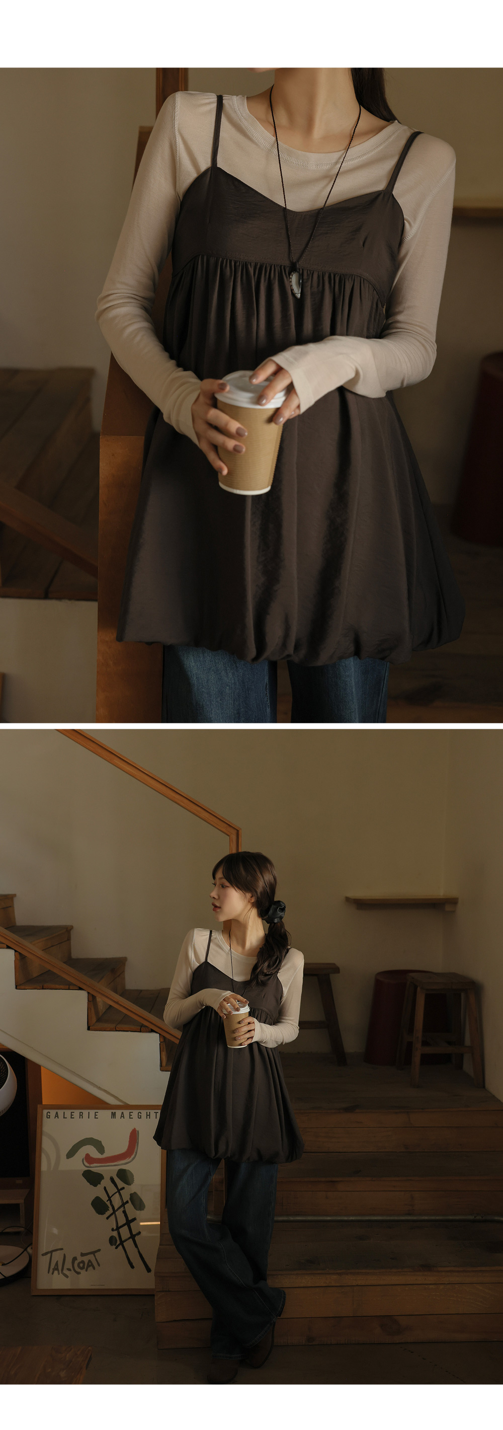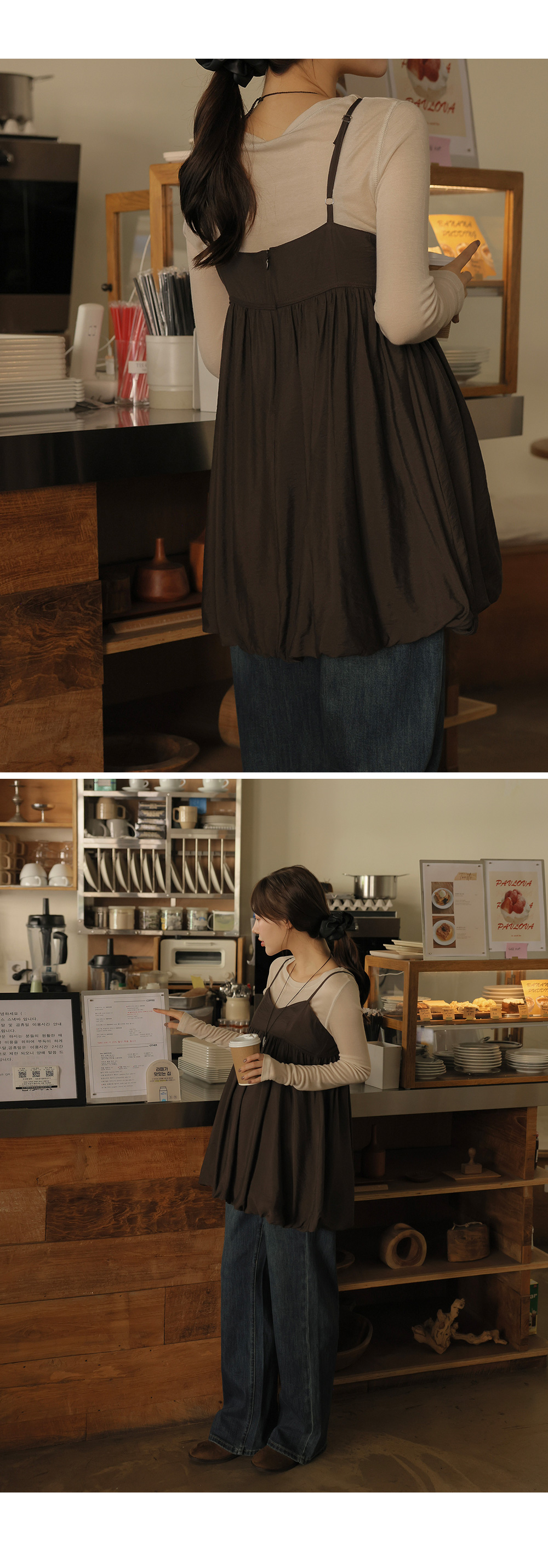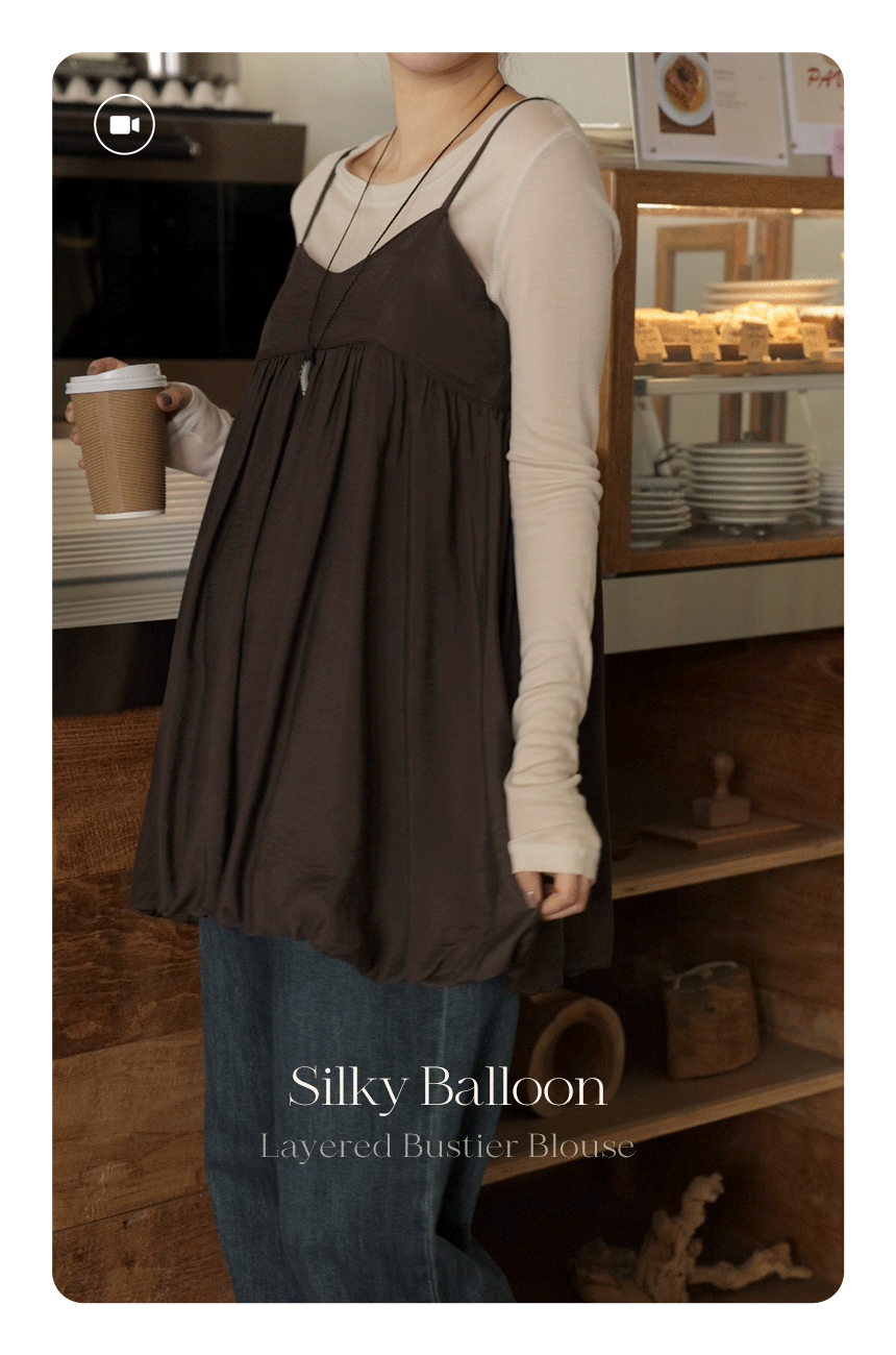 배를 쏘옥 감춰주는 귀여운 벌룬핏 미니원피스 무드의 뷔스티에 블라우스 MD's comment - 레이어드하기 좋은 뷔스티에 블라우스 - 배를 쏘옥 감춰주는 풍성한 벌룬핏 - 미니원피스처럼 여유로운 기장감 - 체형에 맞게 기장 조절이 가능한 어깨버클 - 실키한 소재로 고급스럽게 감도는 광택감