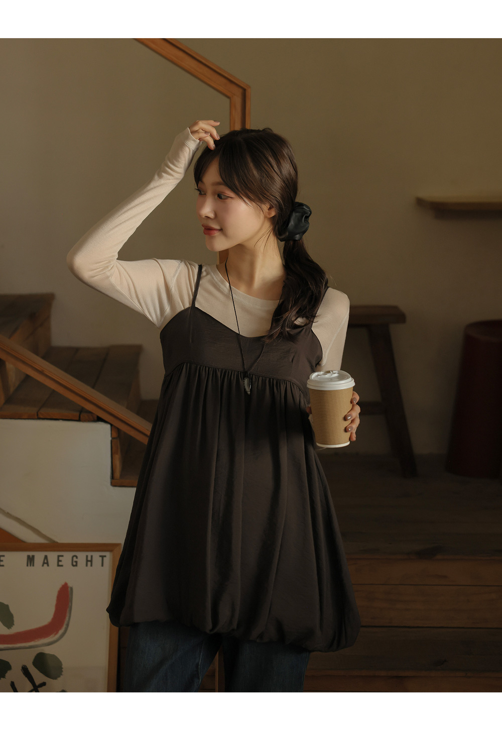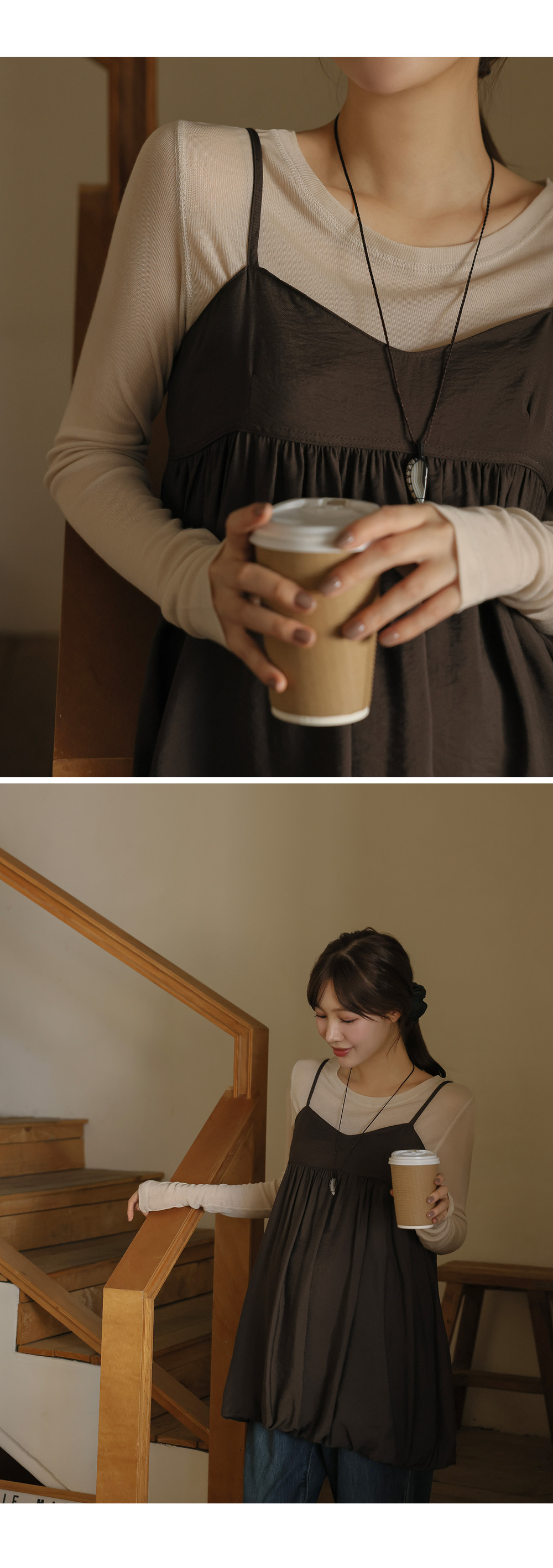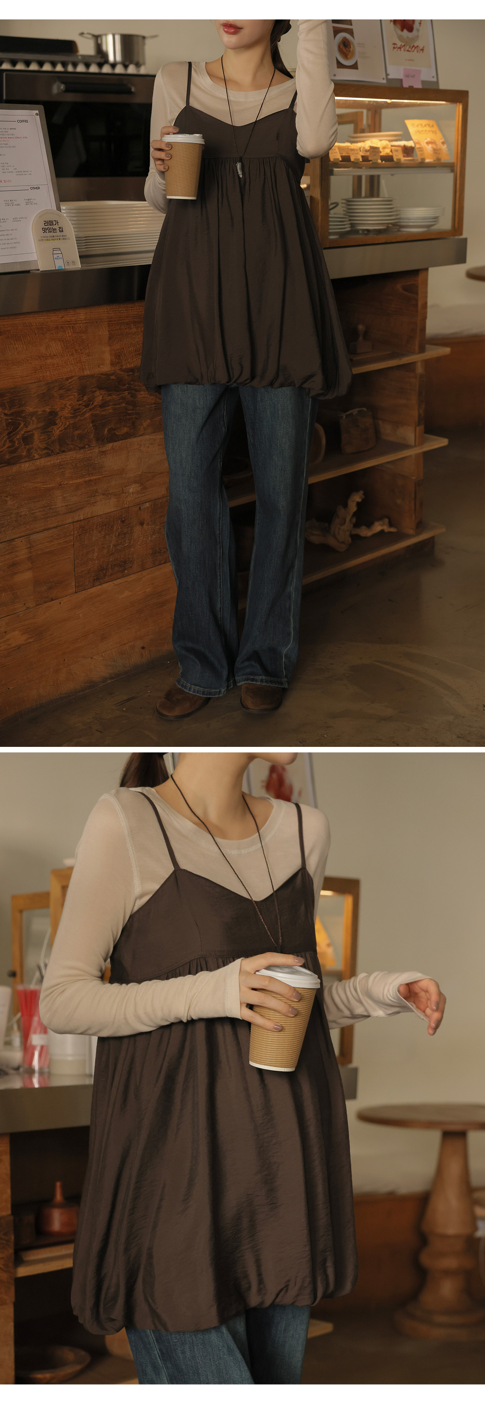 배를 쏘옥 감춰주는 귀여운 벌룬핏 미니원피스 무드의 뷔스티에 블라우스 MD's comment - 레이어드하기 좋은 뷔스티에 블라우스 - 배를 쏘옥 감춰주는 풍성한 벌룬핏 - 미니원피스처럼 여유로운 기장감 - 체형에 맞게 기장 조절이 가능한 어깨버클 - 실키한 소재로 고급스럽게 감도는 광택감