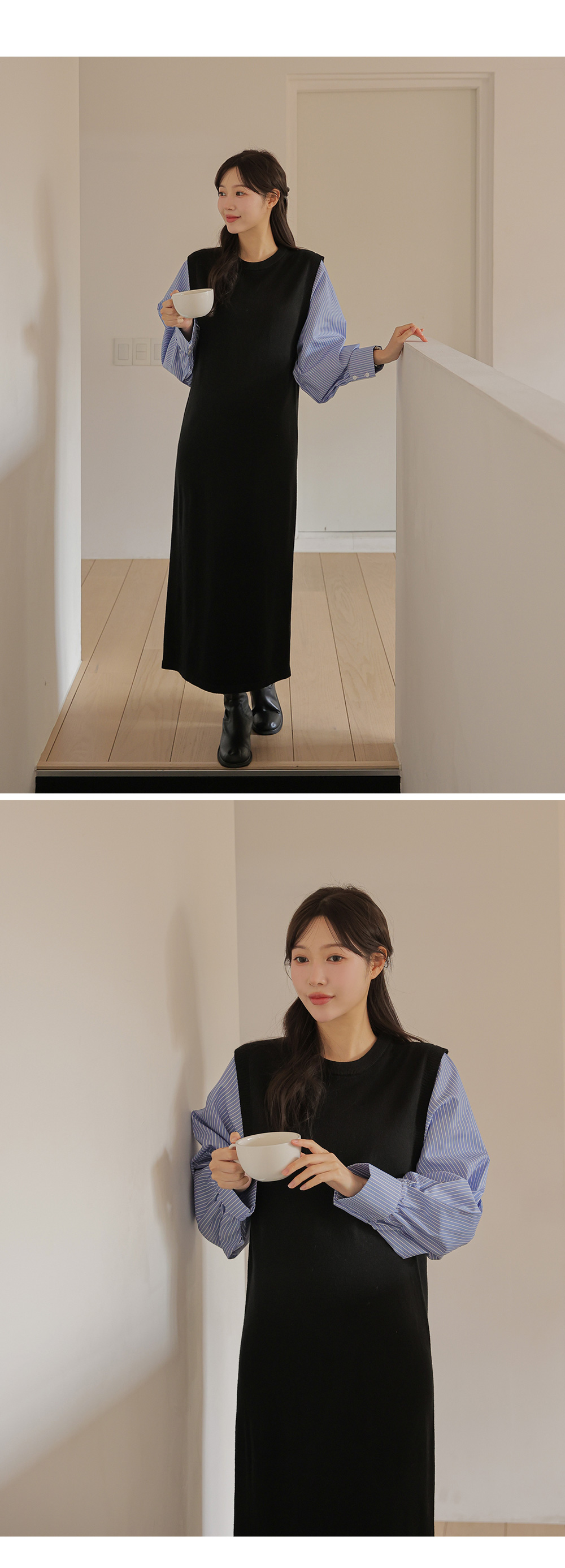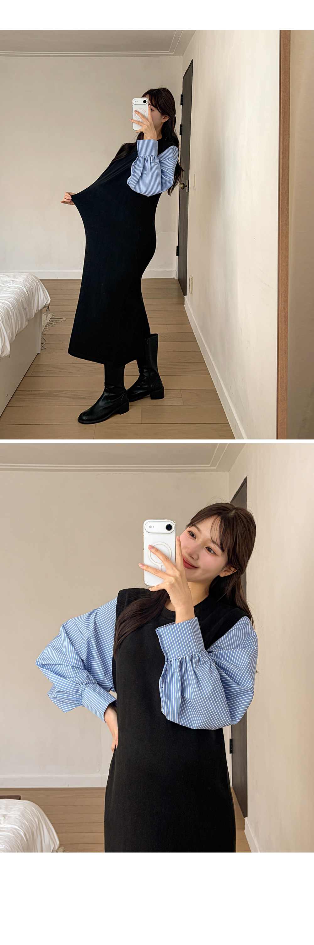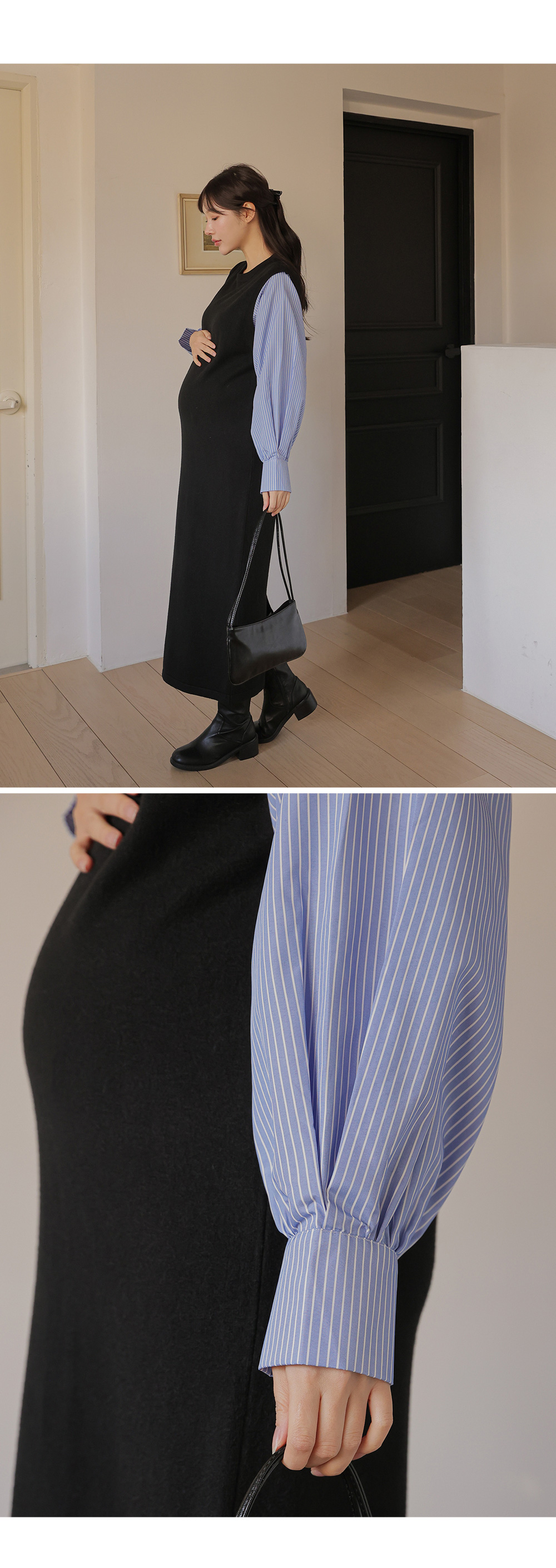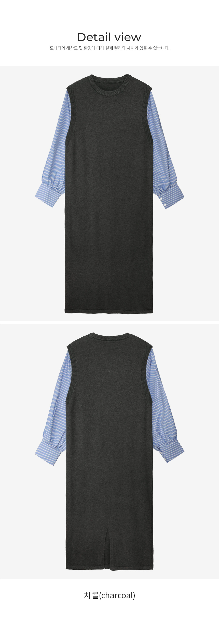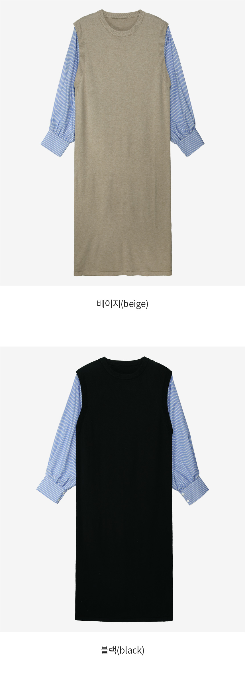 셔츠를 레이어드한 듯 세련된 무드의 니트원피스 MD's comment - 바디는 배 압박없이 유연하고 부드러운 촉감의 니트 소재 - 소매는 풍성한 벌룬감이 느껴지는 스트라이프 패턴의 코튼 혼방 소재 - 활동성을 높여주는 밑단 뒤트임 - 출근룩, 하객룩, 모임룩 추천♥