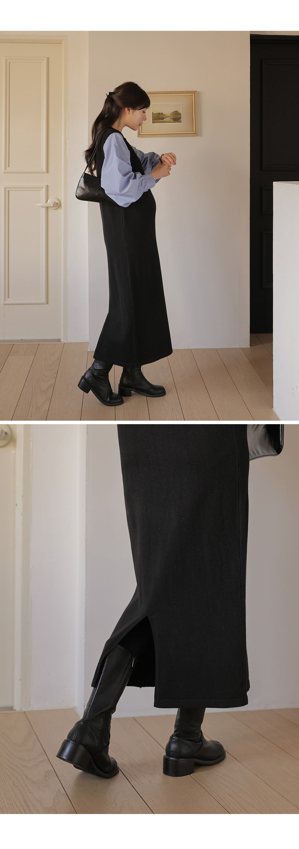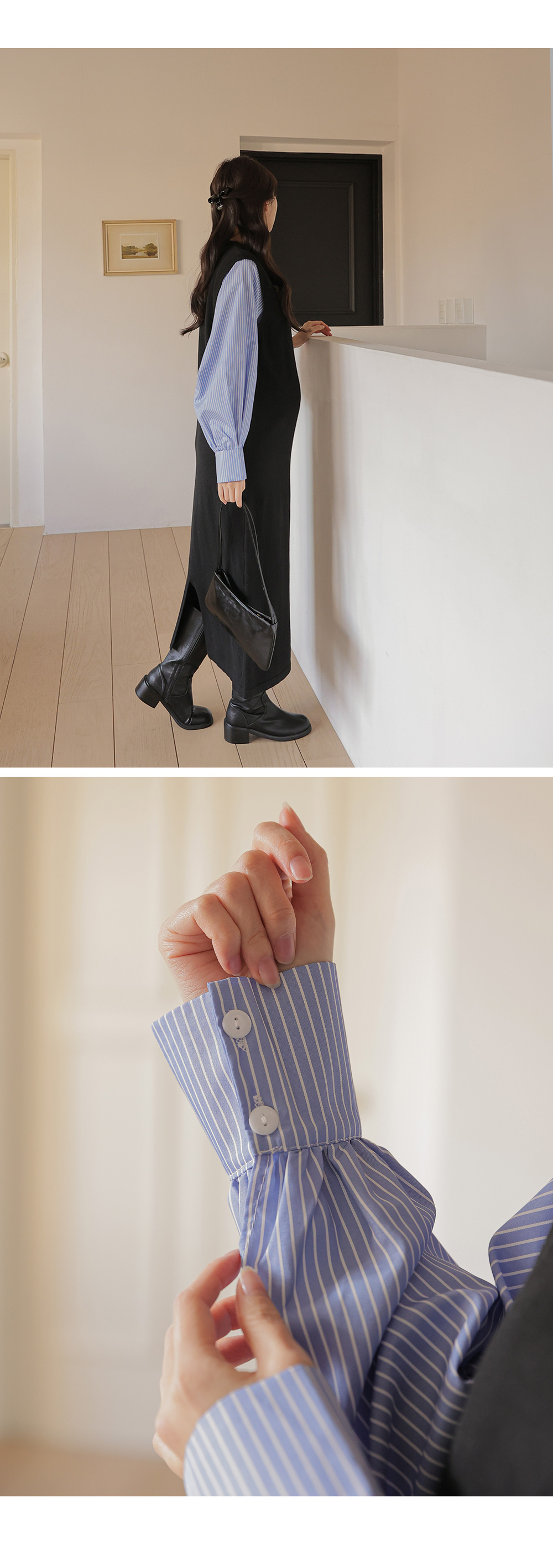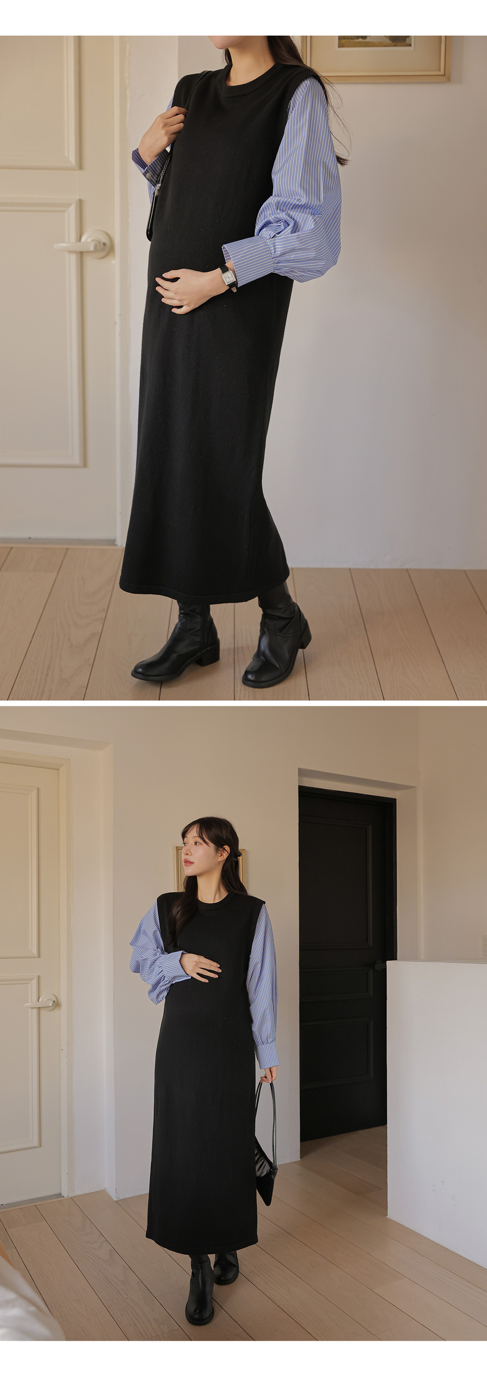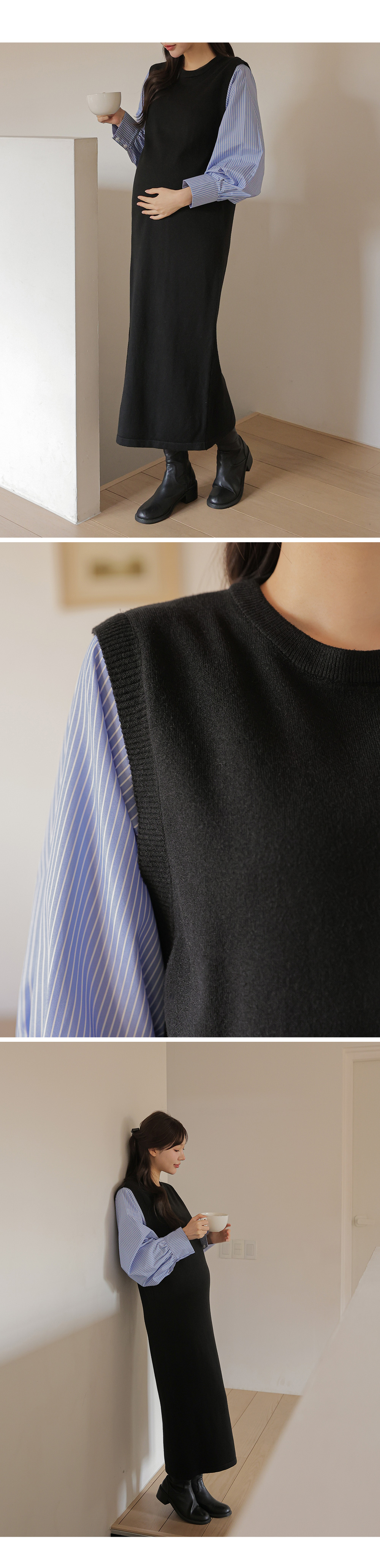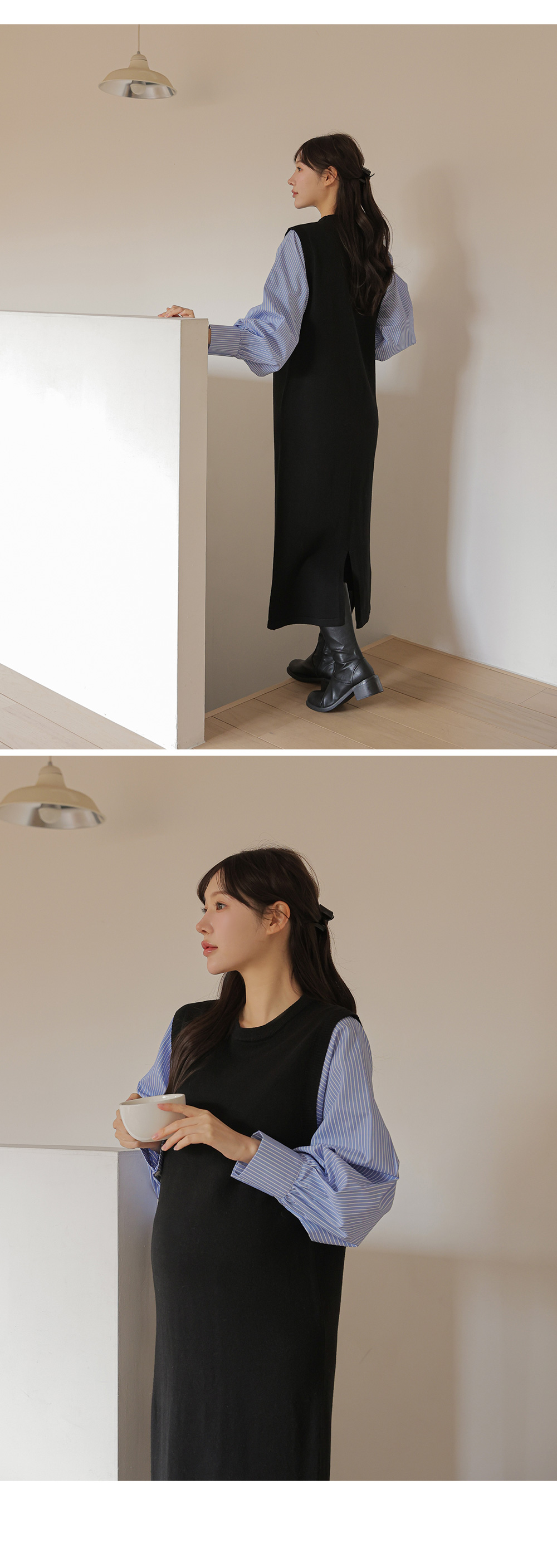 셔츠를 레이어드한 듯 세련된 무드의 니트원피스 MD's comment - 바디는 배 압박없이 유연하고 부드러운 촉감의 니트 소재 - 소매는 풍성한 벌룬감이 느껴지는 스트라이프 패턴의 코튼 혼방 소재 - 활동성을 높여주는 밑단 뒤트임 - 출근룩, 하객룩, 모임룩 추천♥