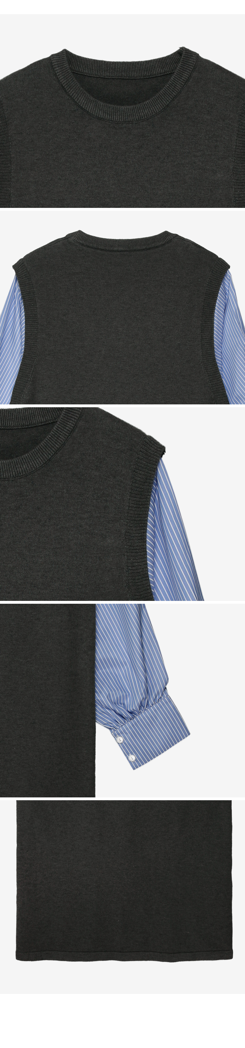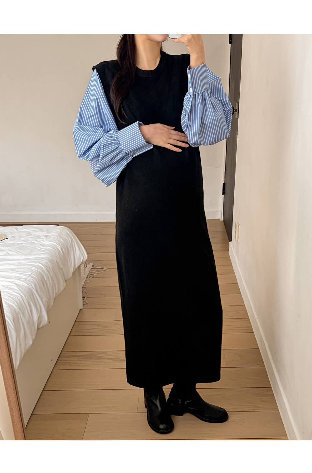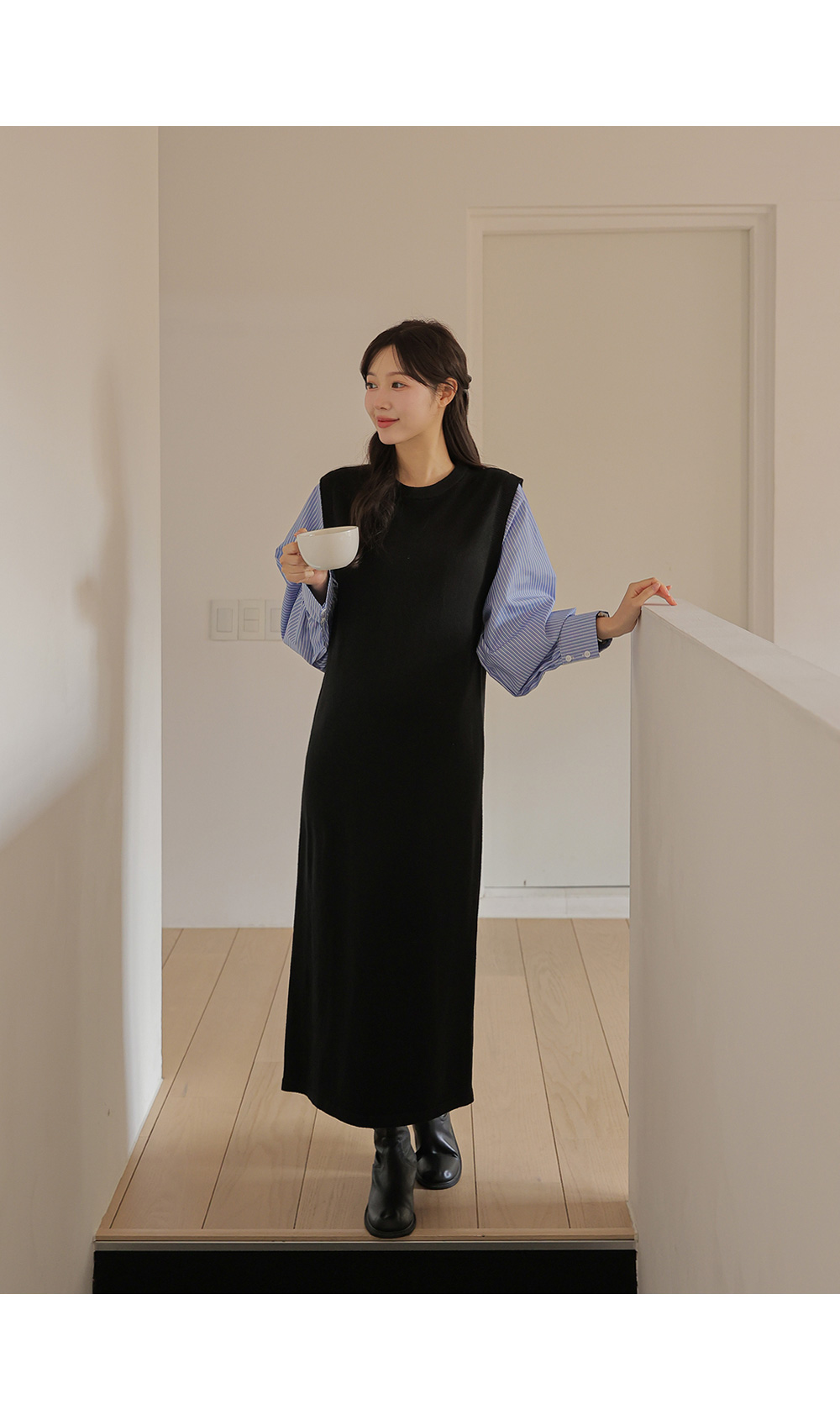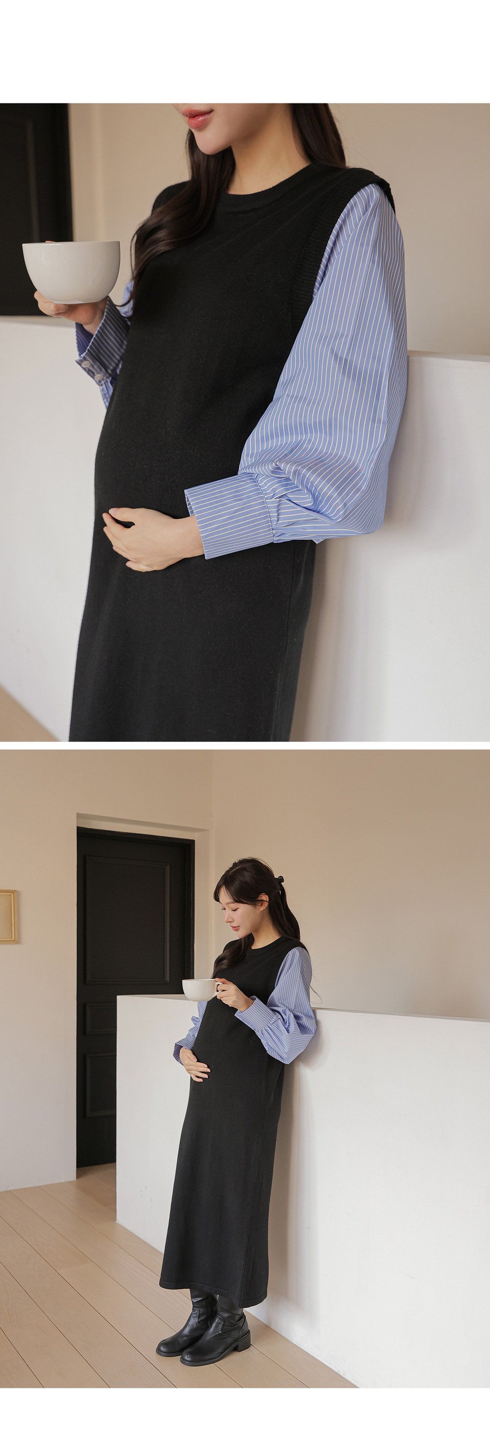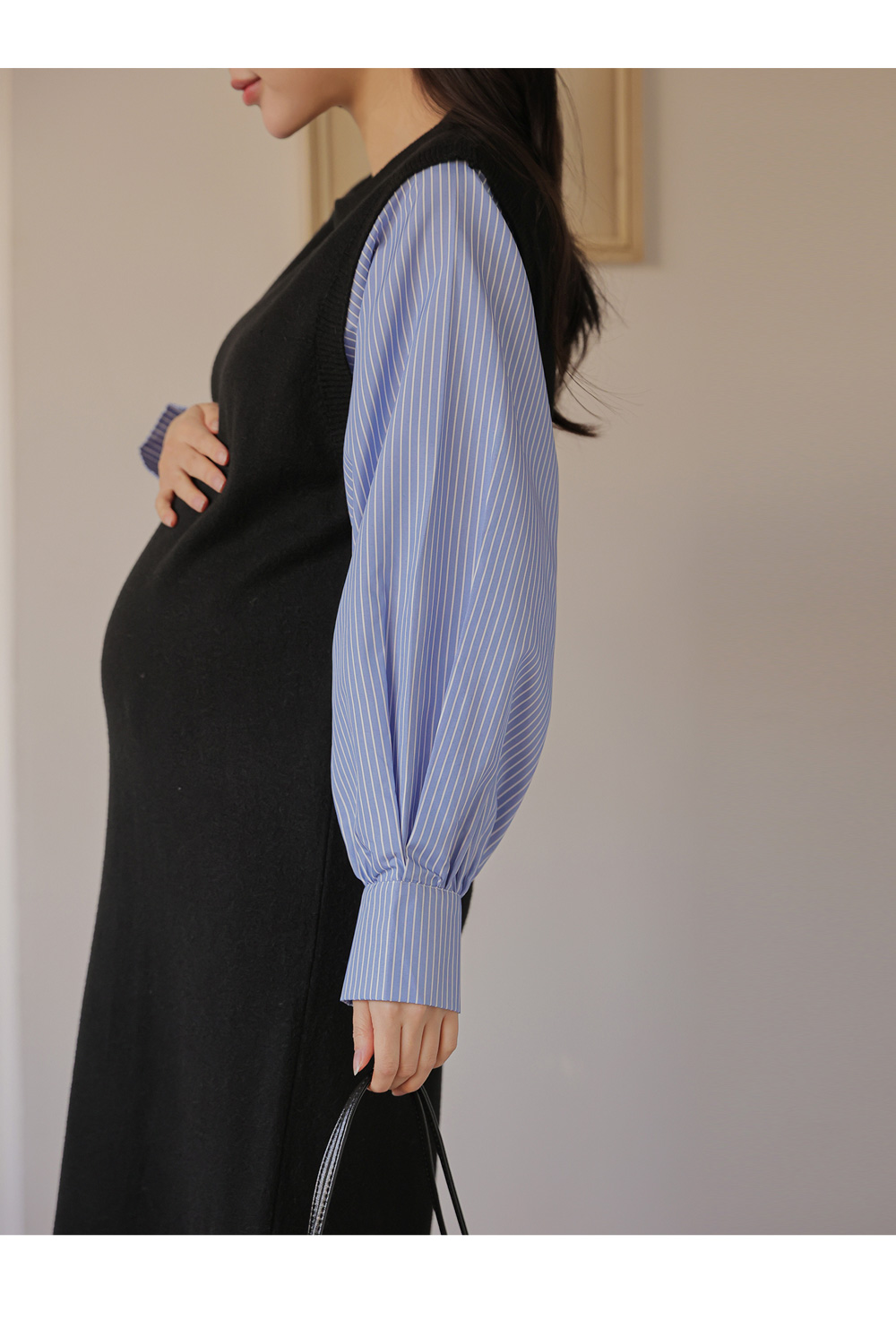 셔츠를 레이어드한 듯 세련된 무드의 니트원피스 MD's comment - 바디는 배 압박없이 유연하고 부드러운 촉감의 니트 소재 - 소매는 풍성한 벌룬감이 느껴지는 스트라이프 패턴의 코튼 혼방 소재 - 활동성을 높여주는 밑단 뒤트임 - 출근룩, 하객룩, 모임룩 추천♥