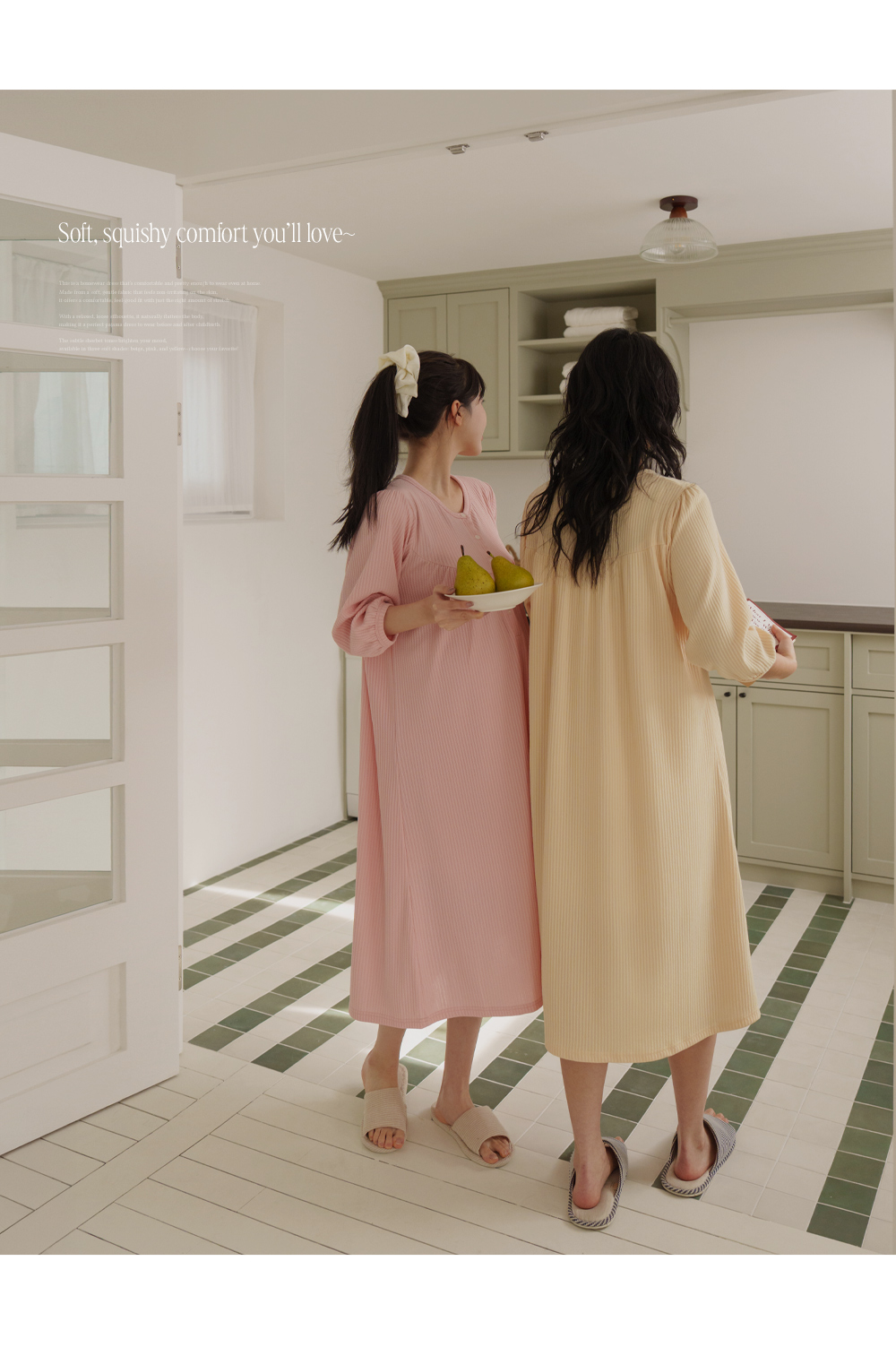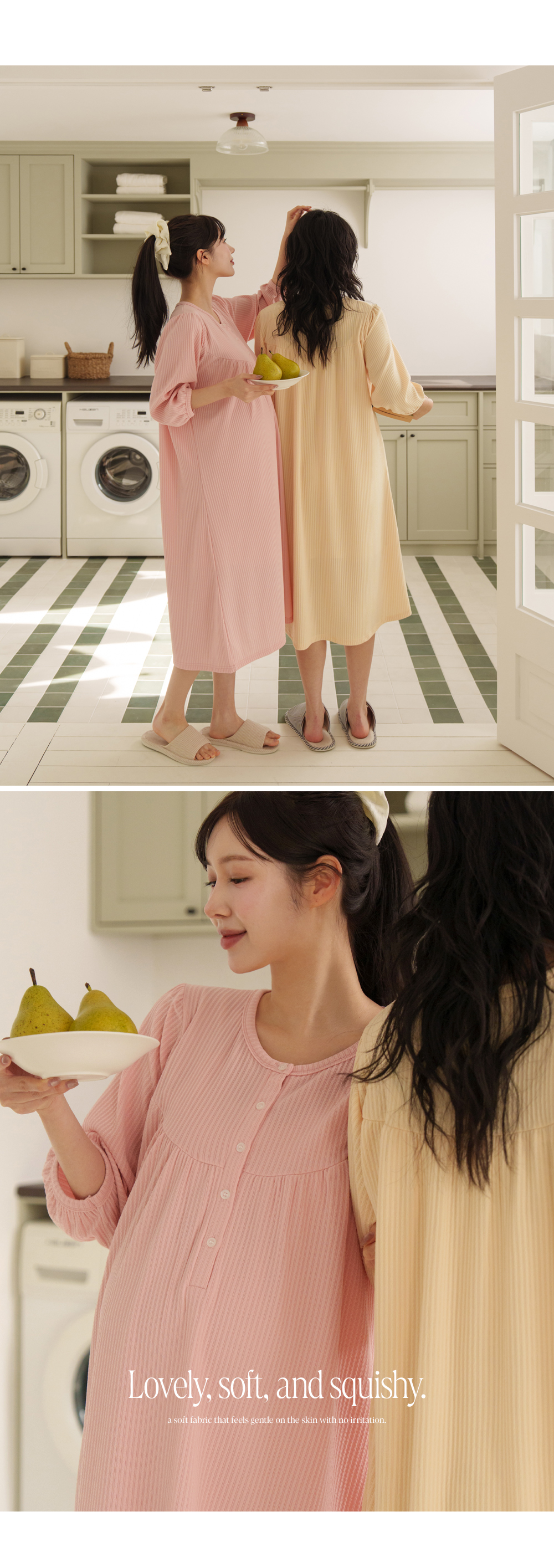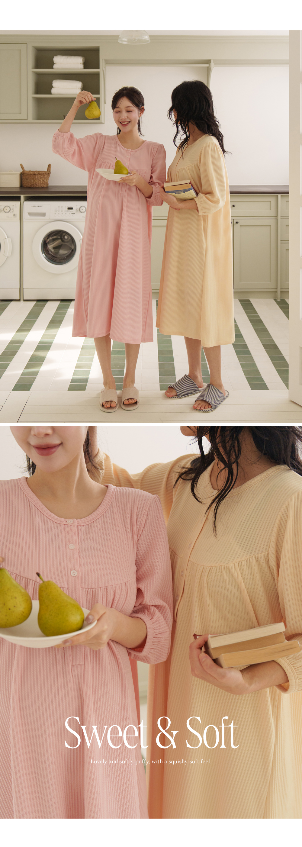 출산 전 후 편하게 입어요! 말랑말랑 소프트한 착용감~ MD's comment 집에서도 편하고 예쁘게 입을 수 있는 홈웨어 원피스예요 말랑하고 부드러운 소재로 피부에 자극없이 편안하고 기분좋은 착용감을 느끼실 수 있구요, 스판기도 함유하고 있어 낭낭하게 입어져요 여유있고 낙낙한 품이라 만삭맘들도 물론, 출산 전후로도 쭉 입기 좋은 파자마에요. 은은한 셔링포인트로 기분좋게 입는 홈 웨어룩 베이지,핑크,노랑 3가지 화사한 컬러들로만나보세요!