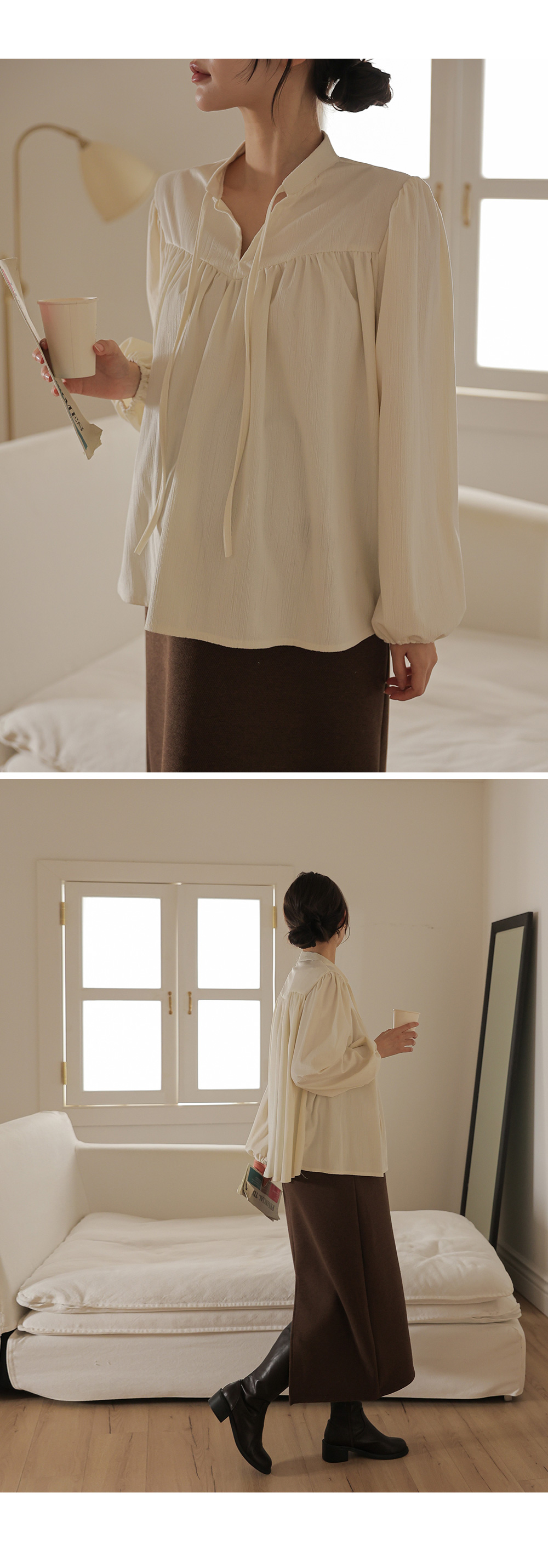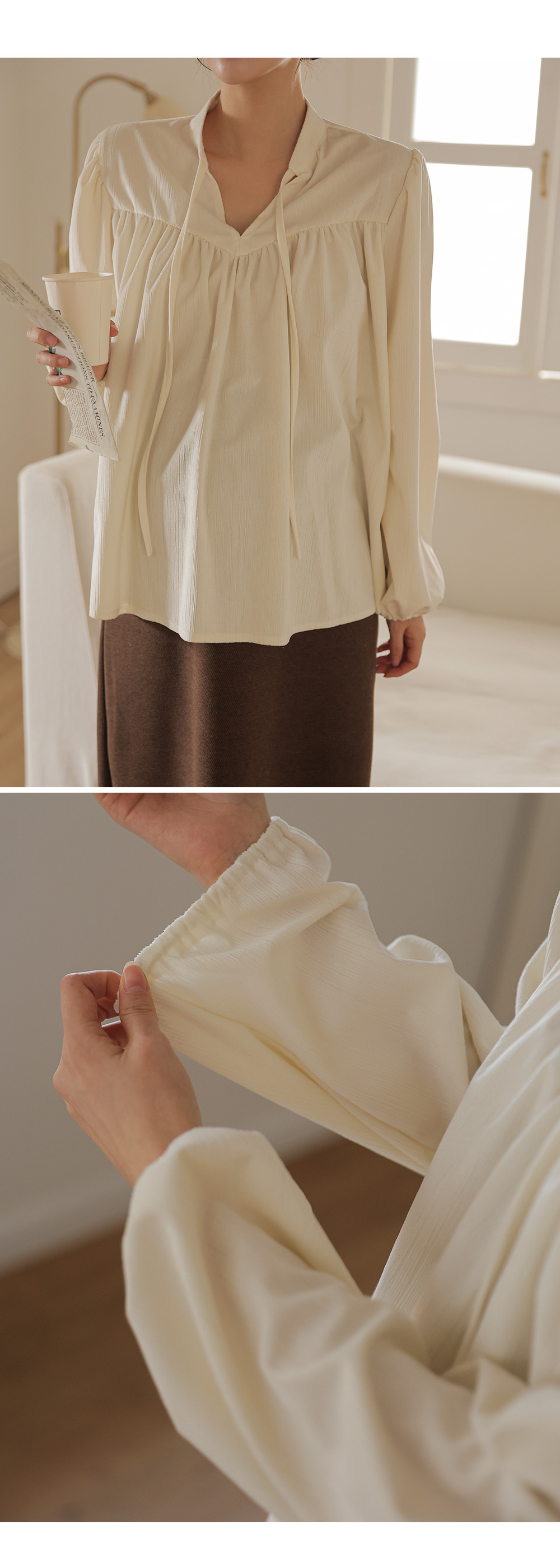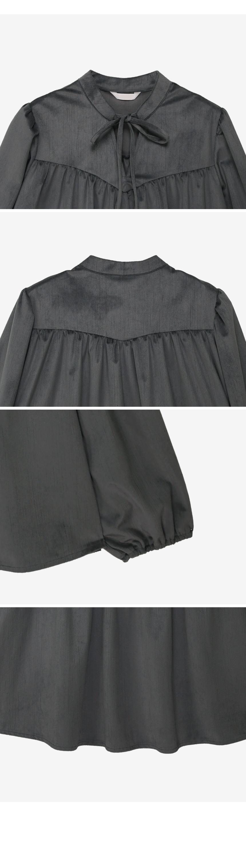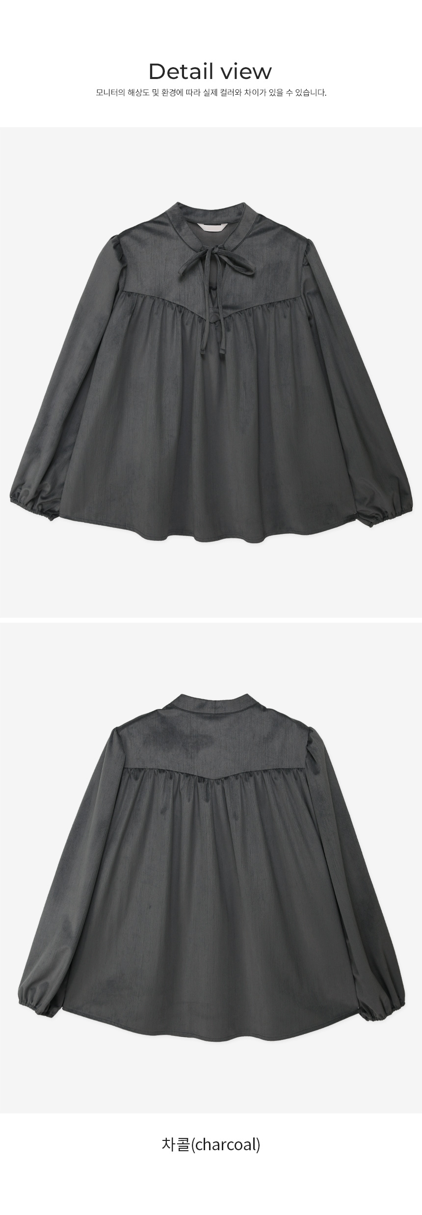 여성스러운 실루엣의 블라우스 오피스룩, 하객룩, 모임룩 추천 MD's comment - 셔링이 잡혀 플레어지는 실루엣이 배를 예쁘게 커버하는 디자인 - 넉넉하지만 여리여리하게 흐르는 핏 - 은은한 윤기가 흐르는 포근한 벨벳소재 - 폴라티를 매치해도 좋은 트임넥 - 리본을 묶거나 툭, 늘어트려도 자연스러운 넥라인 스트링 - 얇지 않은 밀도감에 고급스러운 소재로 겨울 하객룩, 연말룩 블라우스로 추천♥