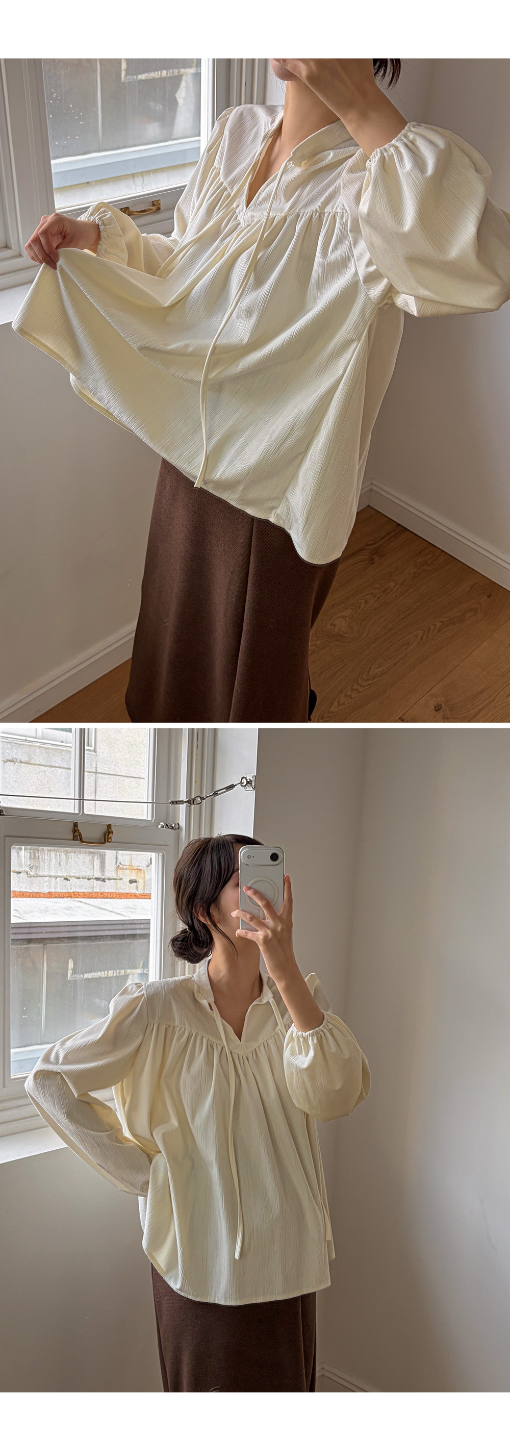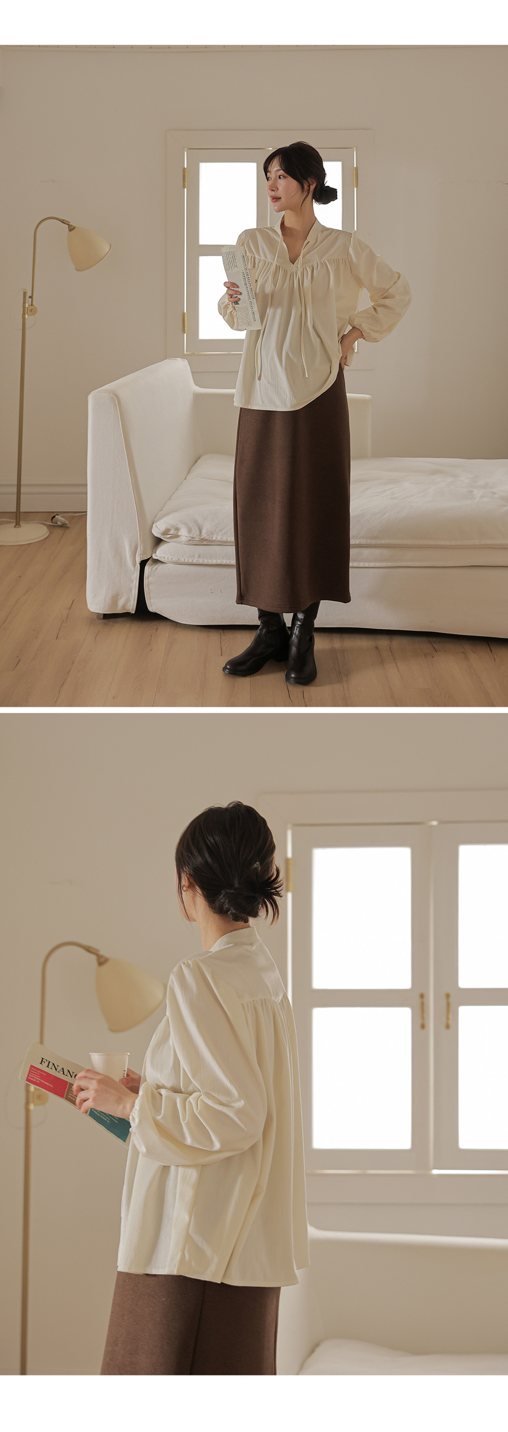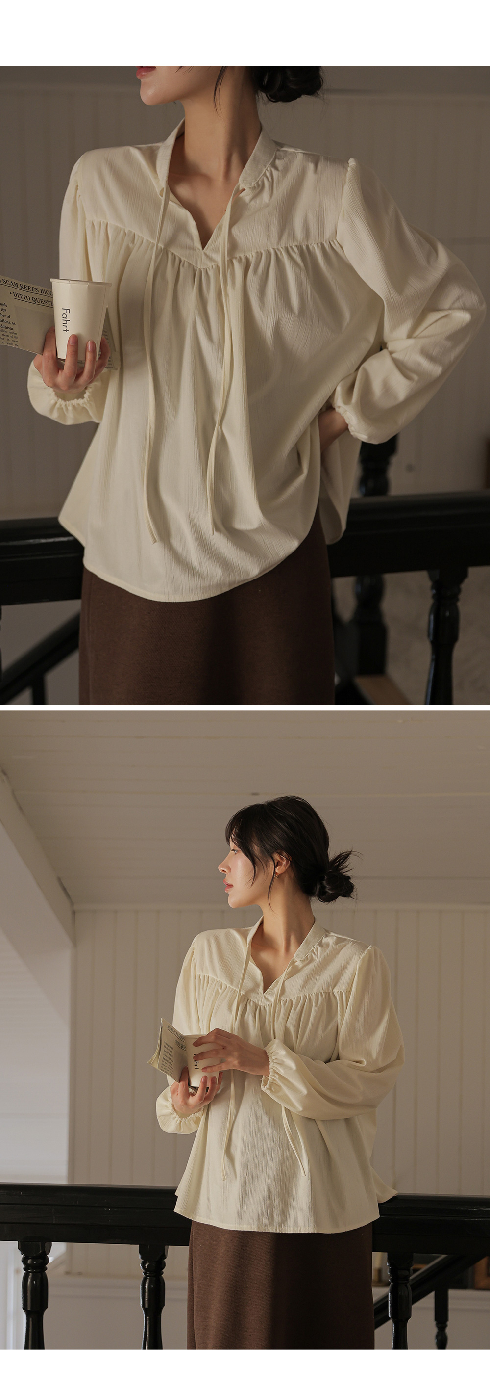 여성스러운 실루엣의 블라우스 오피스룩, 하객룩, 모임룩 추천 MD's comment - 셔링이 잡혀 플레어지는 실루엣이 배를 예쁘게 커버하는 디자인 - 넉넉하지만 여리여리하게 흐르는 핏 - 은은한 윤기가 흐르는 포근한 벨벳소재 - 폴라티를 매치해도 좋은 트임넥 - 리본을 묶거나 툭, 늘어트려도 자연스러운 넥라인 스트링 - 얇지 않은 밀도감에 고급스러운 소재로 겨울 하객룩, 연말룩 블라우스로 추천♥