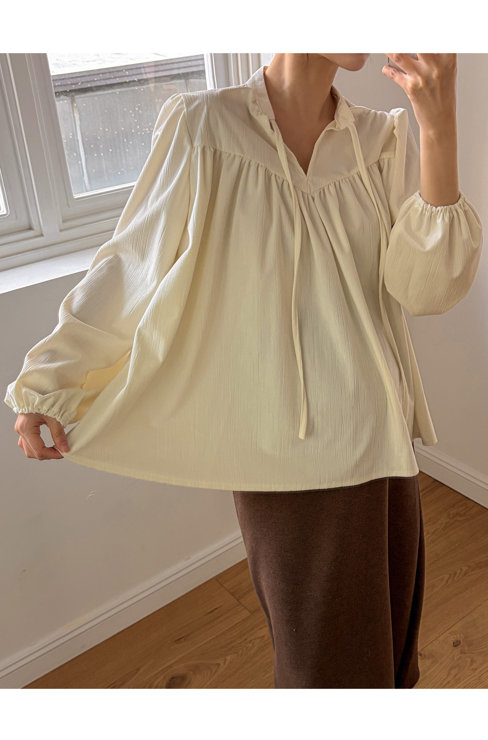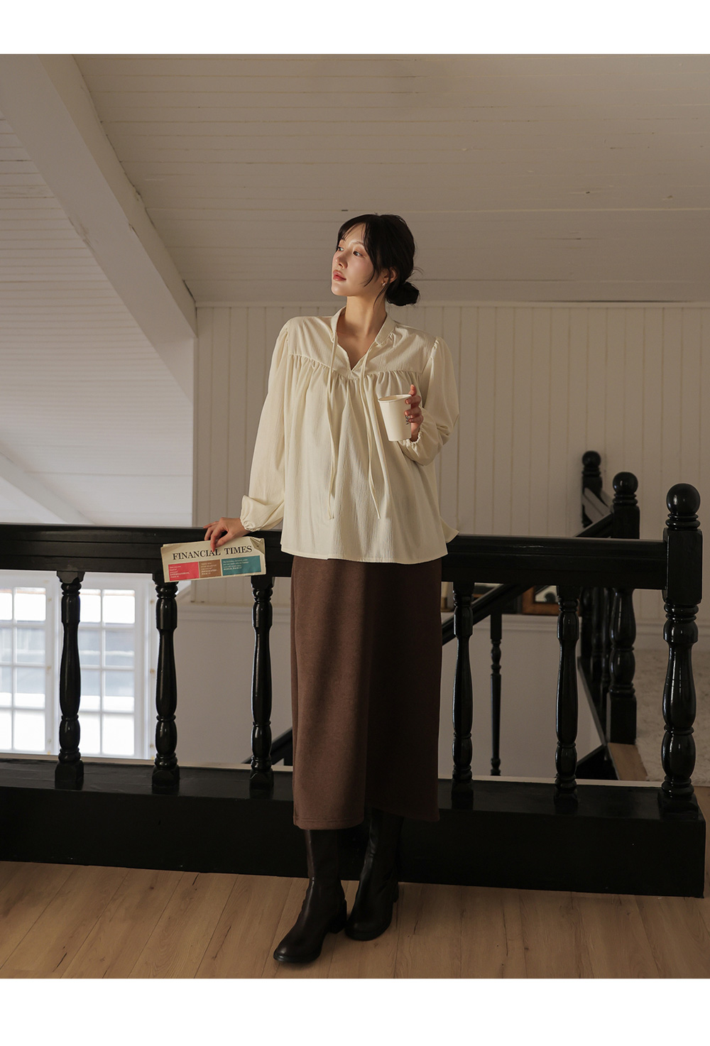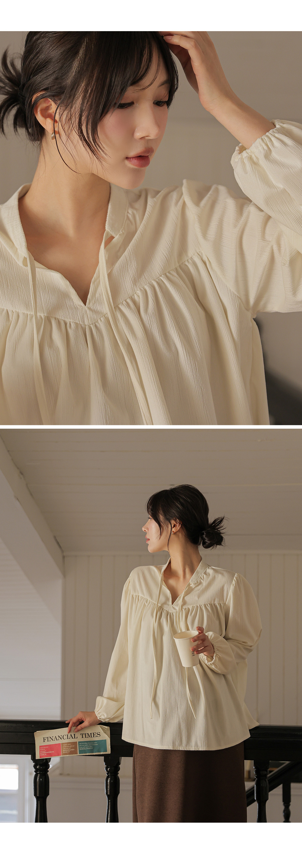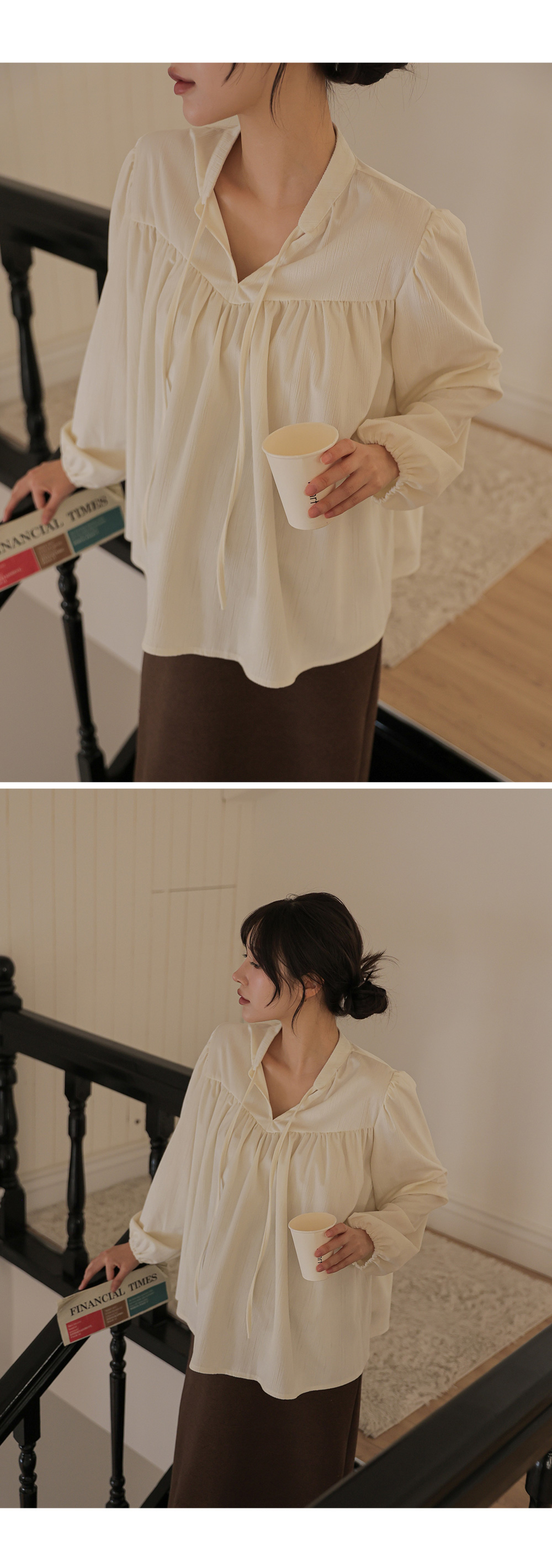 여성스러운 실루엣의 블라우스 오피스룩, 하객룩, 모임룩 추천 MD's comment - 셔링이 잡혀 플레어지는 실루엣이 배를 예쁘게 커버하는 디자인 - 넉넉하지만 여리여리하게 흐르는 핏 - 은은한 윤기가 흐르는 포근한 벨벳소재 - 폴라티를 매치해도 좋은 트임넥 - 리본을 묶거나 툭, 늘어트려도 자연스러운 넥라인 스트링 - 얇지 않은 밀도감에 고급스러운 소재로 겨울 하객룩, 연말룩 블라우스로 추천♥